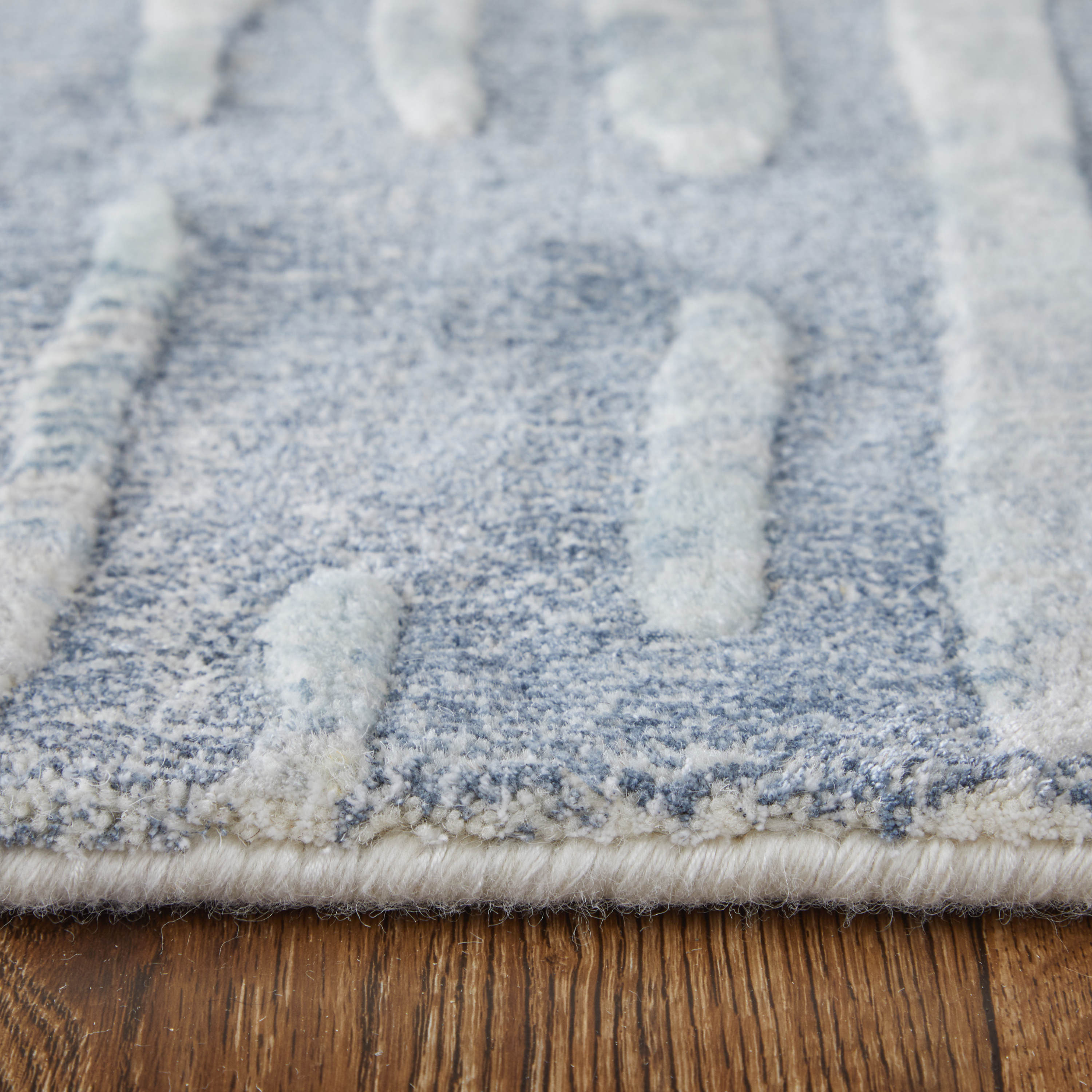 Add some artistry to your room with this 10-foot x 14-foot blue and ivory abstract hand woven area rug. Ideal for spaces with kids and pets, this rug is stain resistant to help repel dirt and spilled liquids. Crafted by skilled artisans, this hand woven rug is genuine and unique. No two will be exactly alike. Crafted from wool blend fibers that give this piece premium texture, refinement, and appeal. This larger sized, industrial styled rug is ready to create a focal point or statement piece in your room. 120.00-inch h x 168.00-inch w x 0.39-inch d.