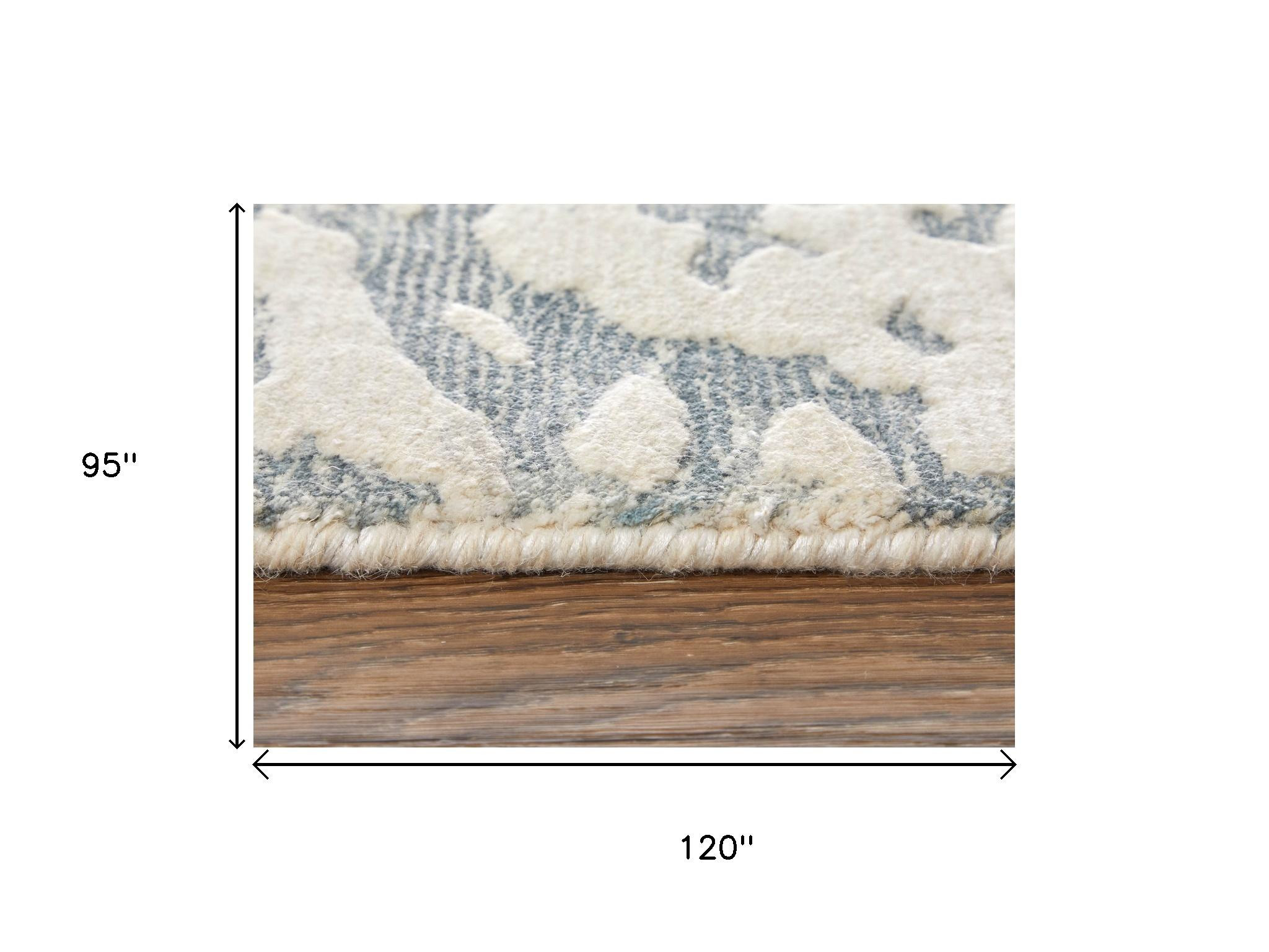 Add some artistry to your room with this 8-foot x 10-foot blue and ivory abstract hand woven area rug. Ideal for spaces with kids and pets, this rug is stain resistant to help repel dirt and spilled liquids. Crafted by skilled artisans, this hand woven rug is genuine and unique. No two will be exactly alike. Crafted from wool blend fibers that give this piece premium texture, refinement, and appeal. This larger sized, industrial styled rug is ready to create a focal point or statement piece in your room. 95.00-inch h x 120.00-inch w x 0.39-inch d.