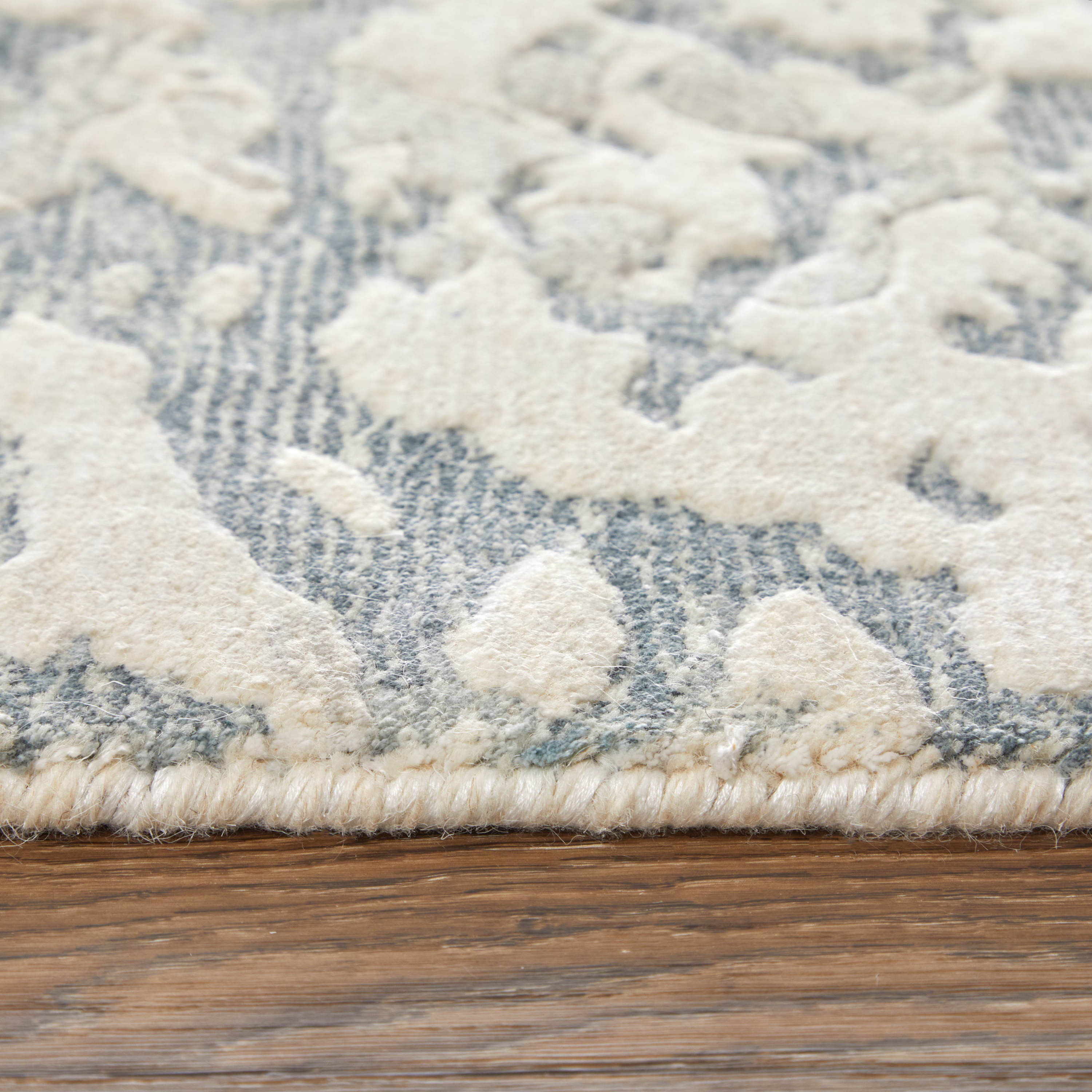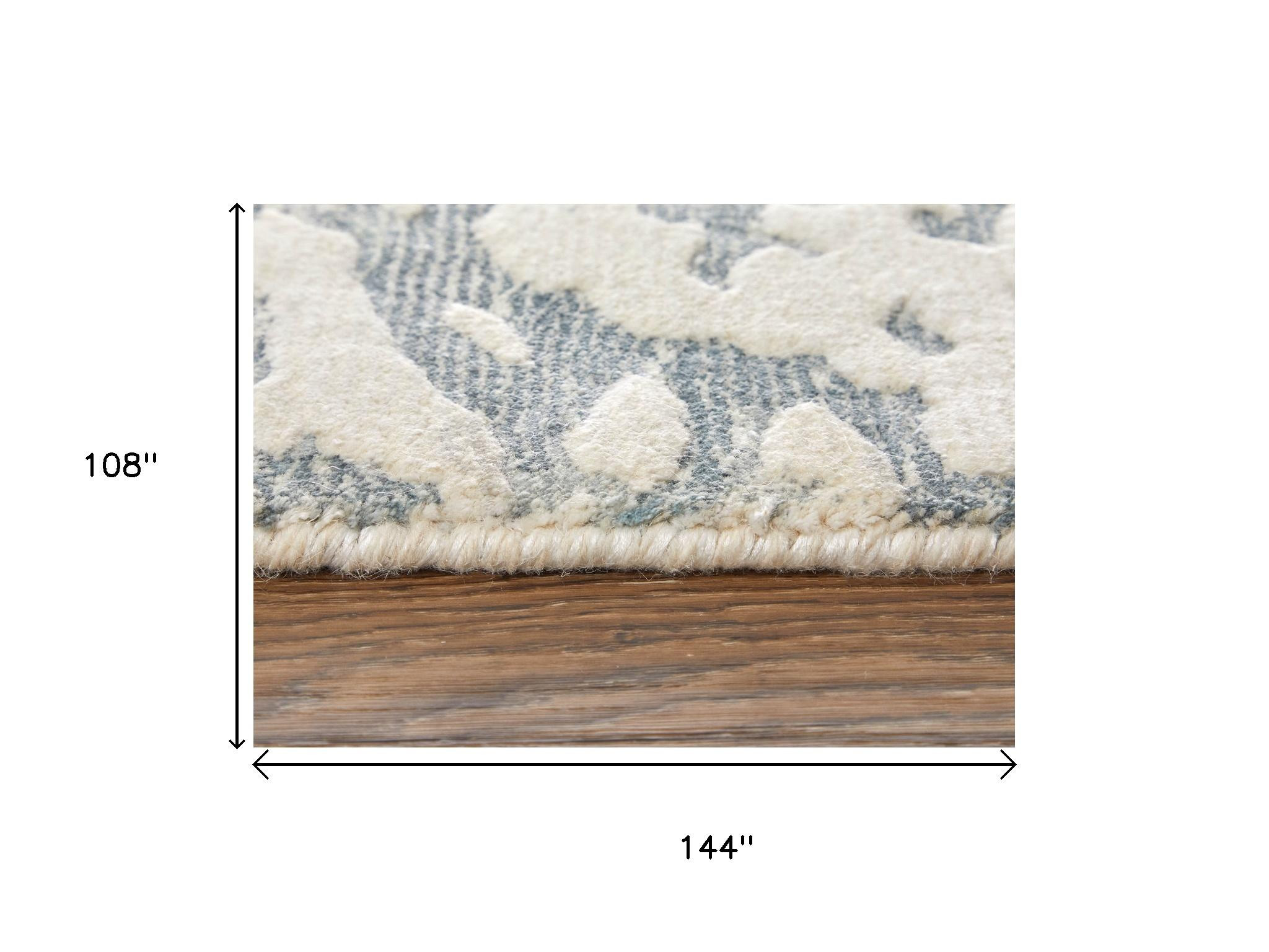 This 9-foot x 12-foot blue and ivory abstract hand woven area rug, is a great way to add warmth to a room. Ideal for spaces with kids and pets, this rug is stain resistant to help repel dirt and spilled liquids. Crafted by skilled artisans, this hand woven rug is genuine and unique. No two will be exactly alike. Crafted from wool blend fibers that give this piece premium texture, refinement, and appeal. This larger sized, industrial styled rug is ready to create a focal point or statement piece in your room. 108.00-inch h x 144.00-inch w x 0.39-inch d.