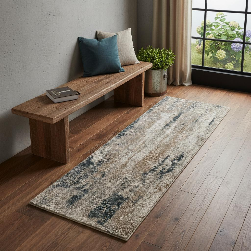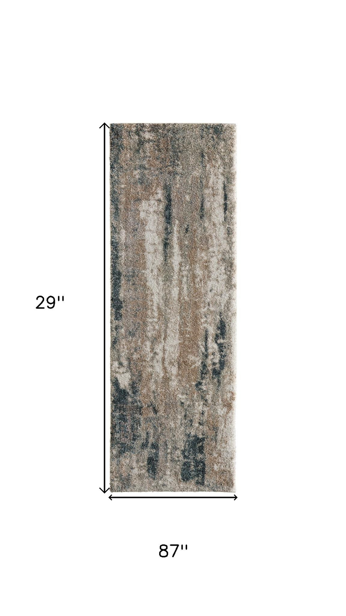 Set an inviting tone in your space with this 7-foot blue and ivory abstract area rug. Ideal for spaces with kids and pets, this rug is stain resistant to help repel dirt and spilled liquids. Built to last, this rug crafted from polypropylene fibers is known for its durability and long lasting appeal. This smaller sized, industrial styled rug is just what you need for your walkway, bedside, in front of door, cabinet, refrigerator, or chair. 29.00-inch h x 87.00-inch w x 0.94-inch d.