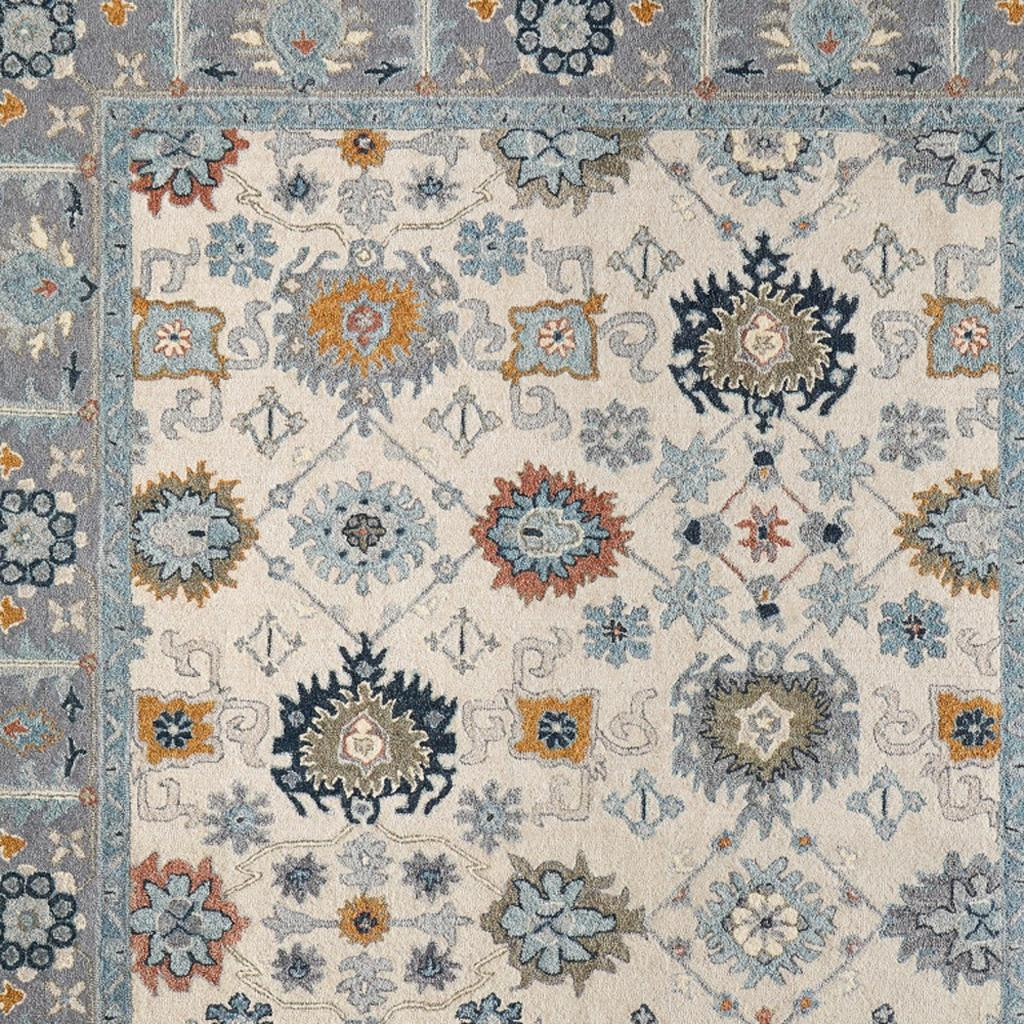 This 10-foot x 14-foot blue and ivory wool floral hand tufted area rug, is a great way to add warmth to a room. Ideal for spaces with kids and pets, this rug is stain resistant to help repel dirt and spilled liquids. Crafted by skilled artisans, this hand tufted rug is genuine and unique. No two will be exactly alike. This larger sized, traditional styled rug is ready to create a focal point or statement piece in your room. 120.00-inch h x 168.00-inch w x 0.44-inch d.