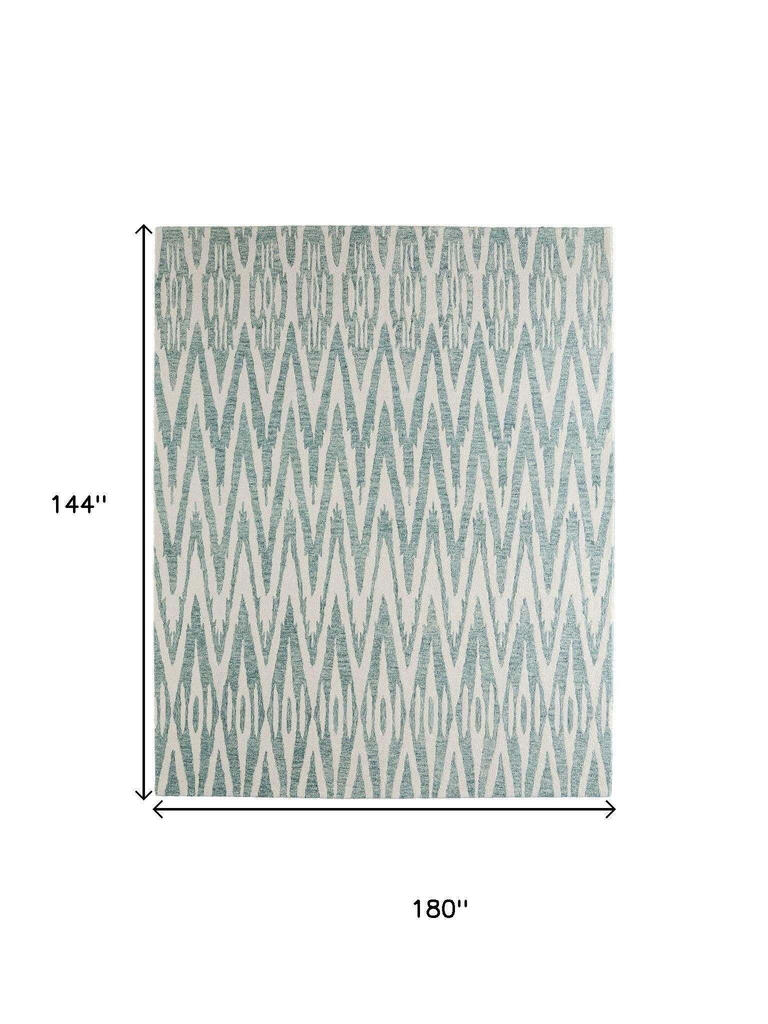 Set an inviting tone in your space with this 12-foot x 15-foot blue and white wool chevron hand tufted area rug. Ideal for spaces with kids and pets, this rug is stain resistant to help repel dirt and spilled liquids. Crafted by skilled artisans, this hand tufted rug is genuine and unique. No two will be exactly alike. This larger sized, bohemian styled rug is ready to create a focal point or statement piece in your room. 144.00-inch h x 180.00-inch w x 0.31-inch d.