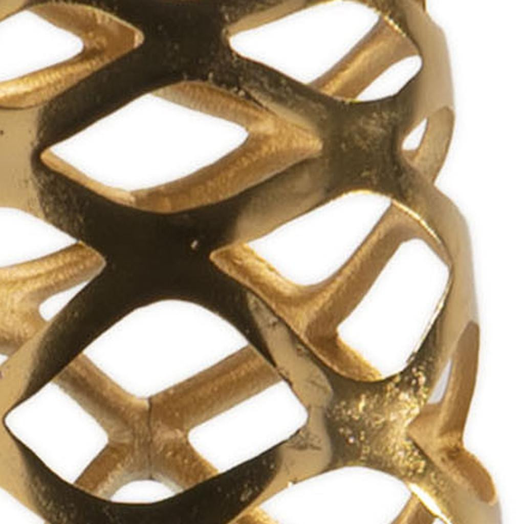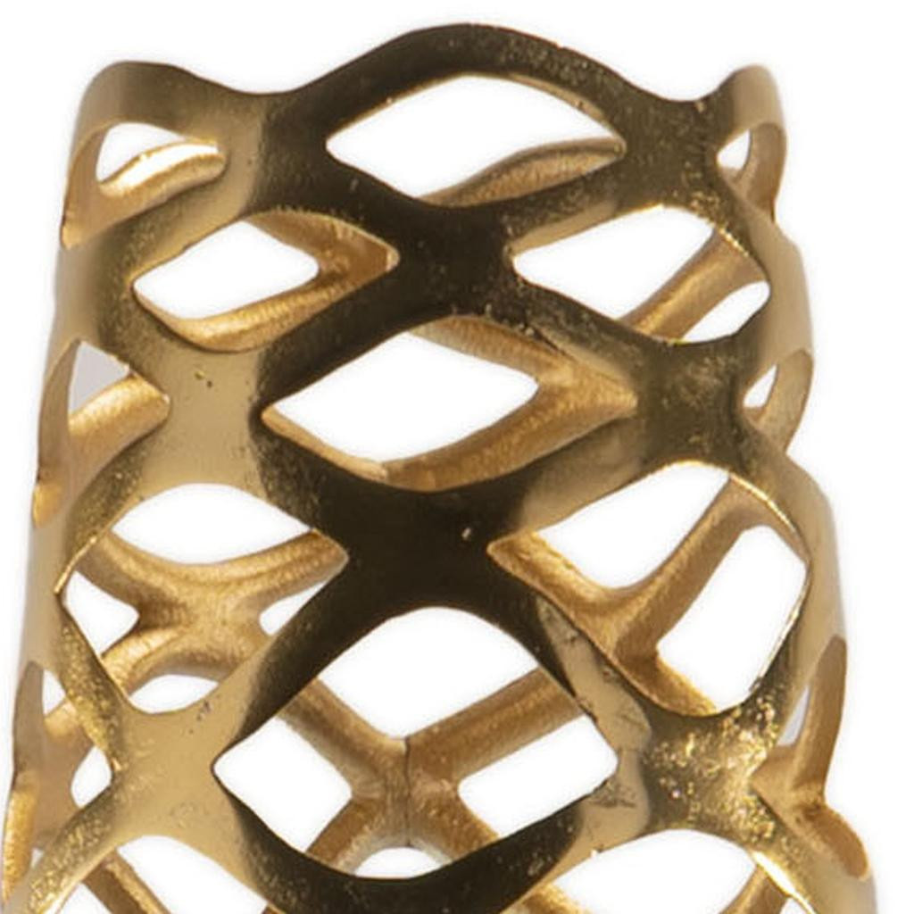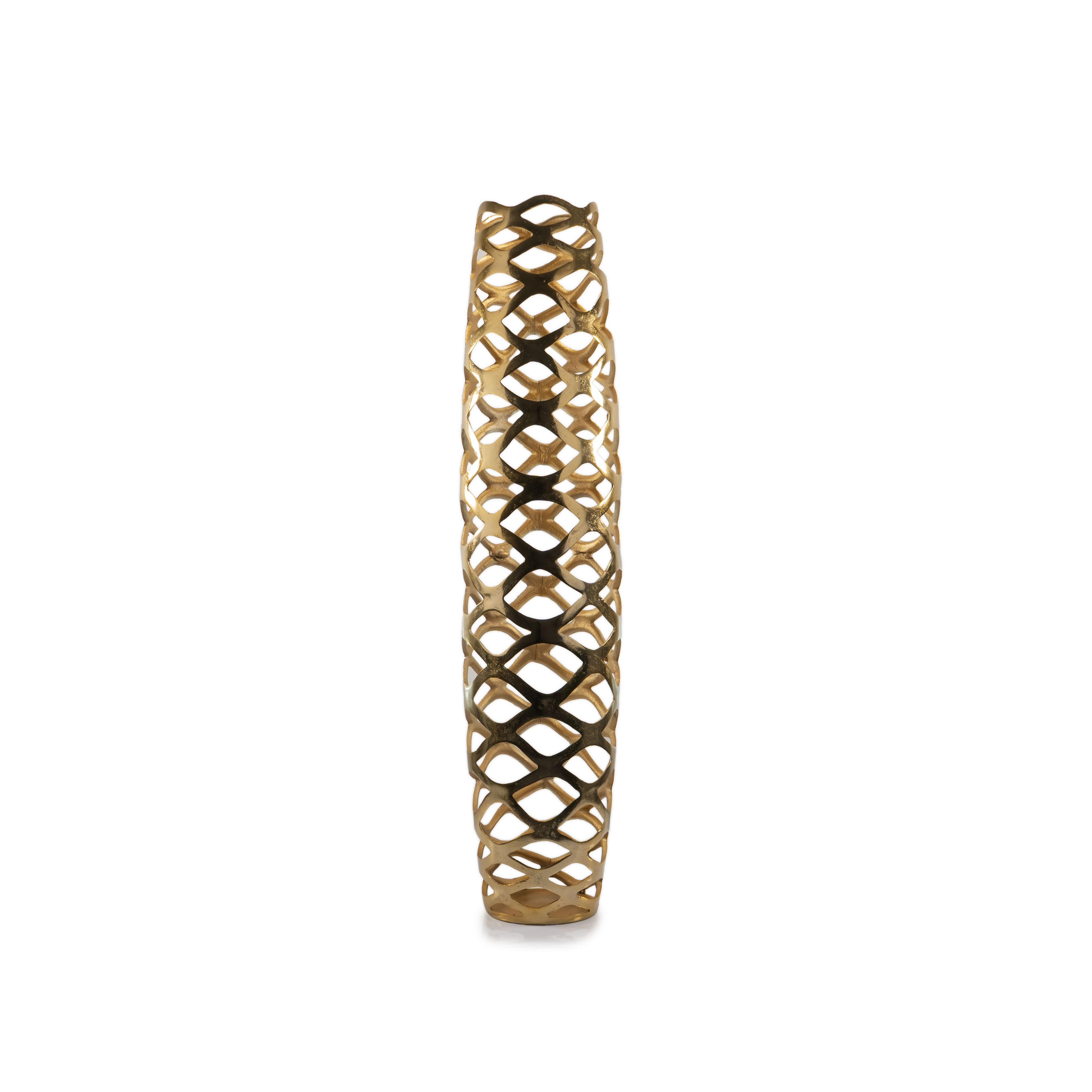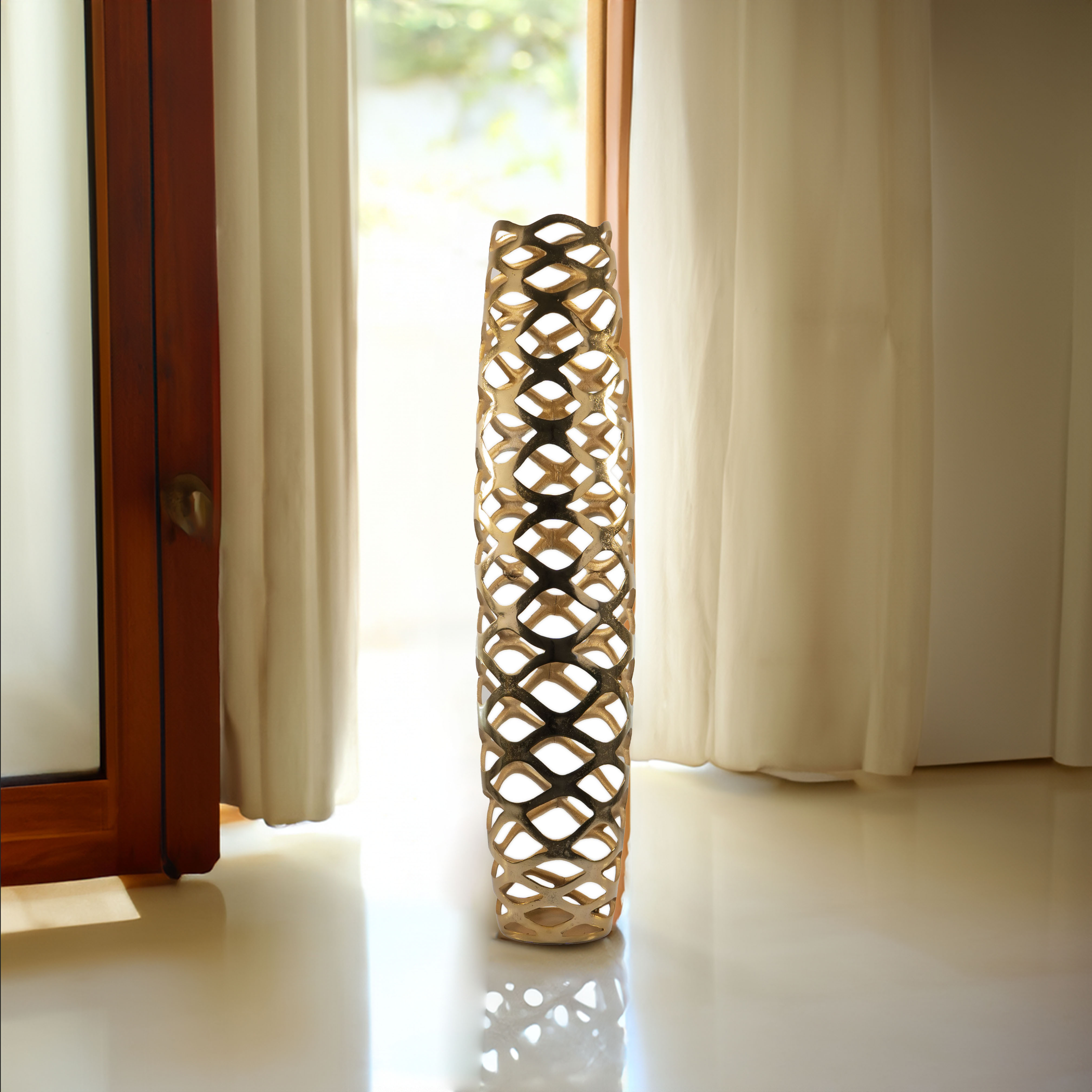 cast aluminum floor vase, gold decorative vase, open design vase, metallic gold home décor, modern floor sculpture, tall vases set, contemporary metal vase, electroplated gold finish, statement floor décor, open lattice vase, artistic metal décor |