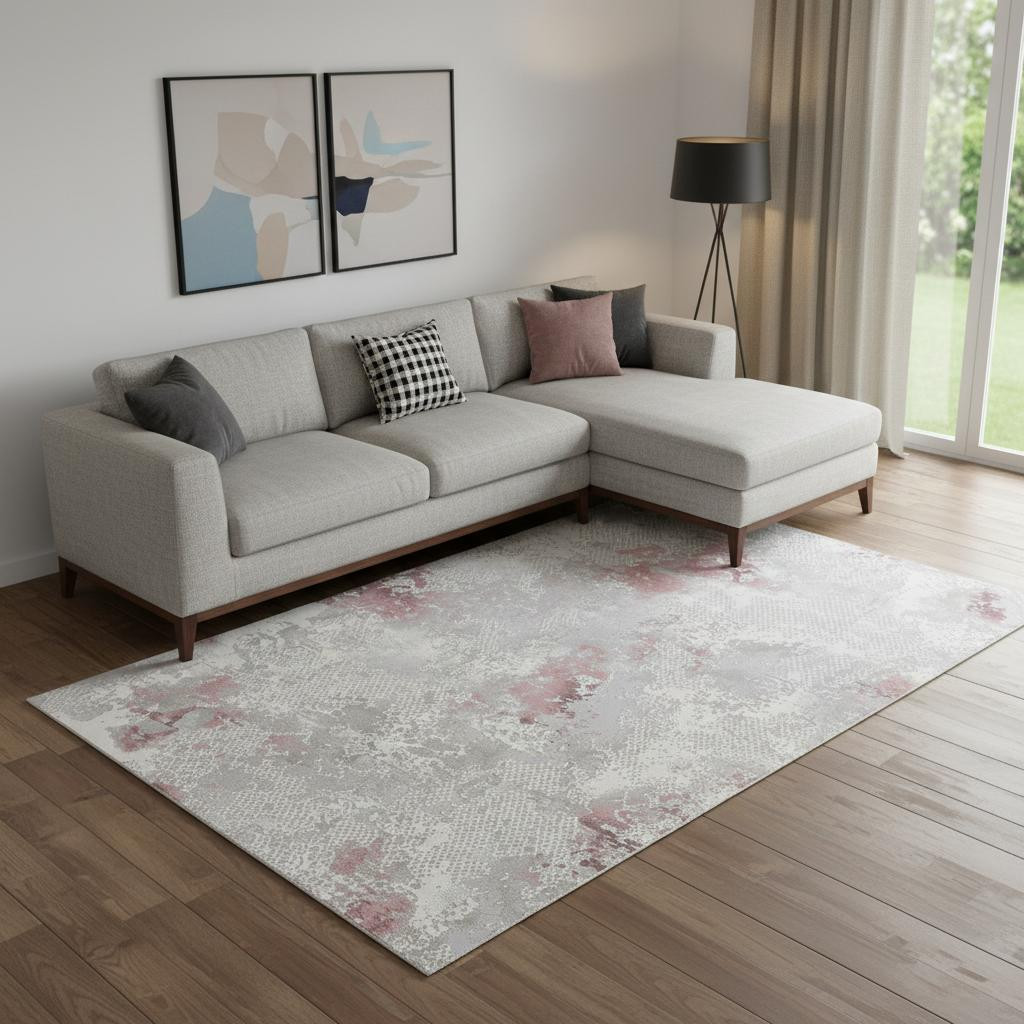 This 7-foot x 10-foot gray ivory and pink abstract distressed area rug, is a great way to add warmth to a room. Crafted from luxurious plush acrylic fibers that give this piece premium softness, texture, and appeal. This larger sized, contemporary styled rug is ready to create a focal point or statement piece in your room. 79.00-inch h x 114.00-inch w x 0.39-inch d.