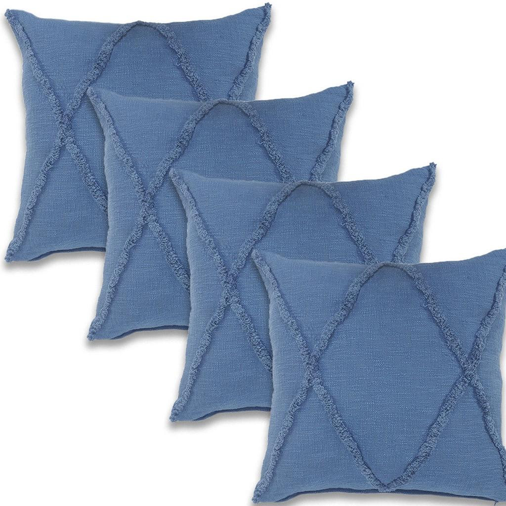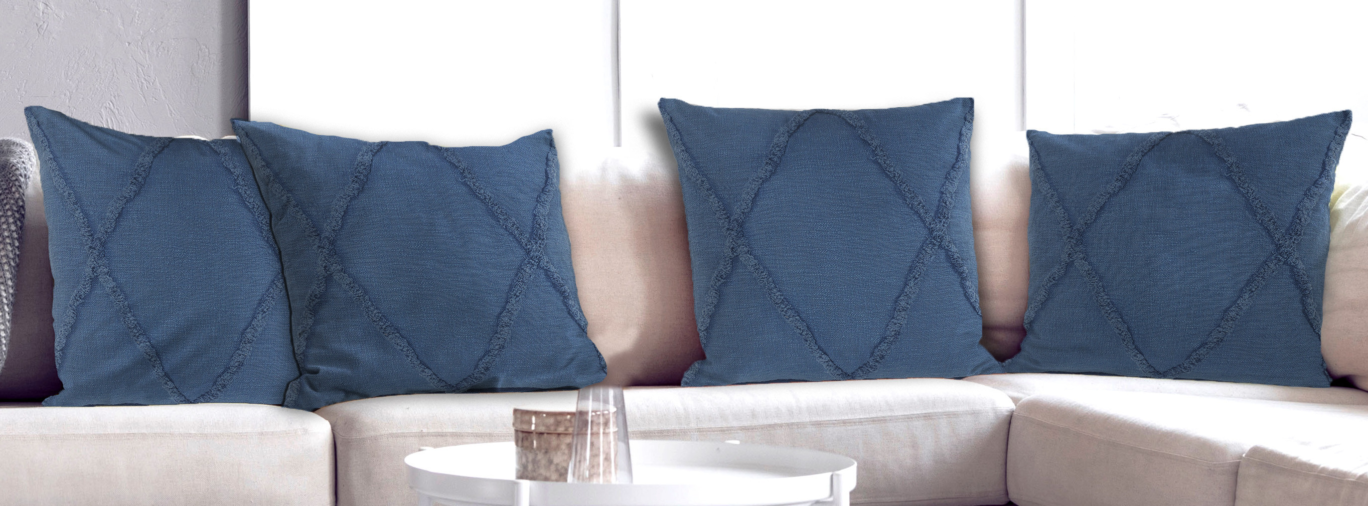 Unique and decorative, this comfortable set of four blue and indigo diamond cotton throw pillows with texture will leave a lasting impression. Ultra durable blue and indigo cotton has been used to make this decorative pillow set a beautiful look that will stand the test of time. Decorative pillows are a great way to change up the look and feel of your space easily and quickly. A great decorative accessory to add color and dimension to your favorite chair, accent your sofa, or to use as part of your bed ensemble. 24.00-inch h x 16.00-inch w x 5.00-inch d.