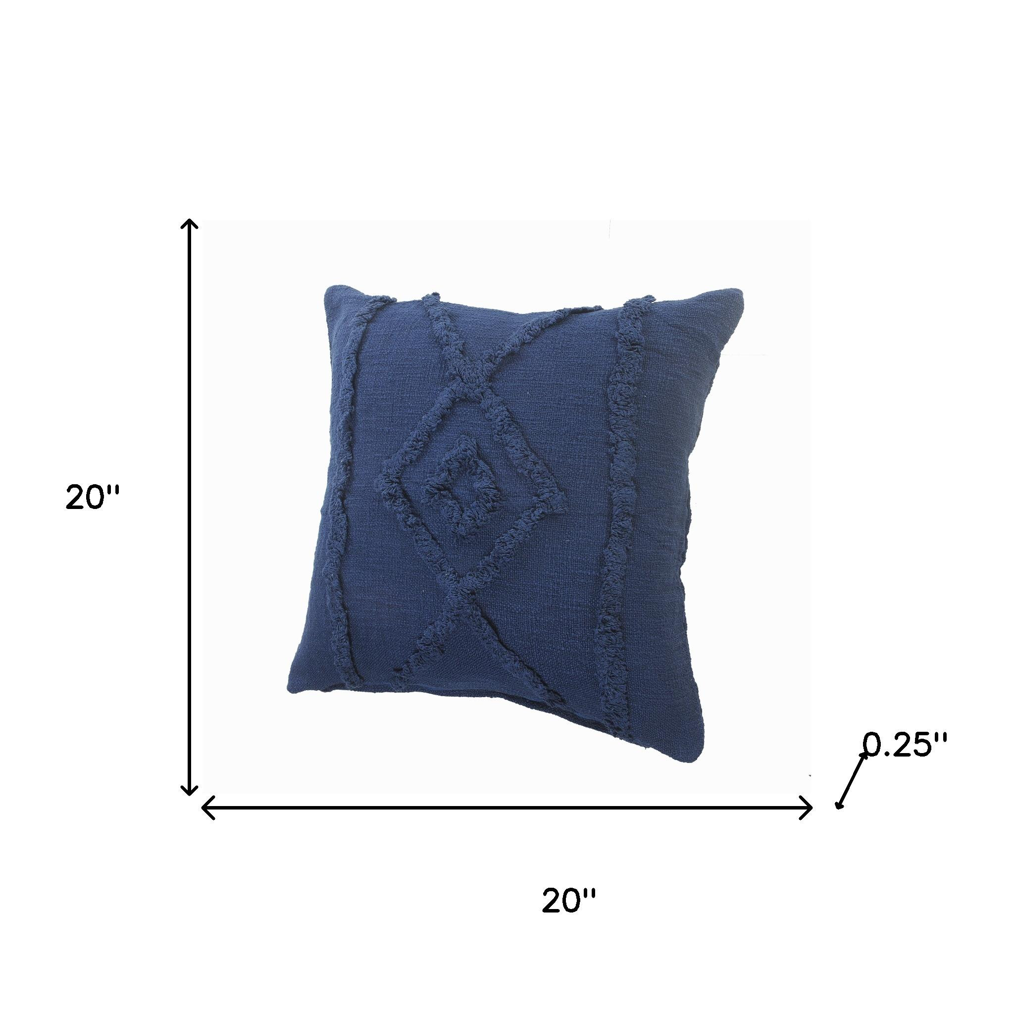 This 20-inch blue and indigo geometric cotton throw pillow cover with texture will add a beautiful decorative accent to your decor. This blue and indigo colored decorative pillow cover is made from high grade cotton that is durable and long lasting. Pillow covers are a good idea for anyone that loves to decorate or accent their space with color and texture. Combine with your own fill or insert to add decoration and dimension to your favorite chair, accent your sofa, or to use as part of your bed ensemble. 20.00-inch h x 20.00-inch w x 0.25-inch d.