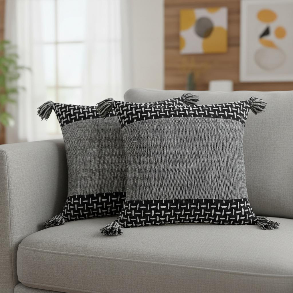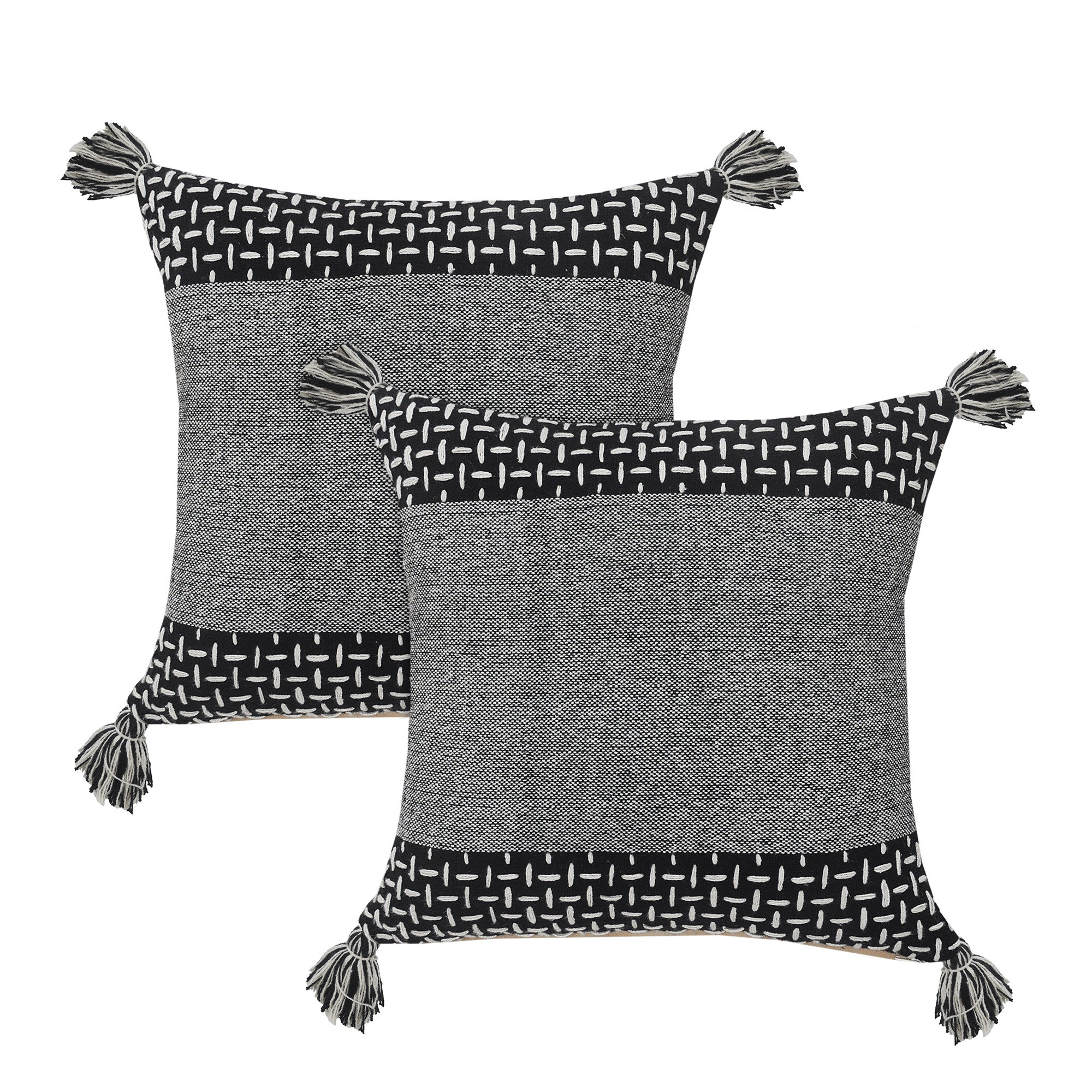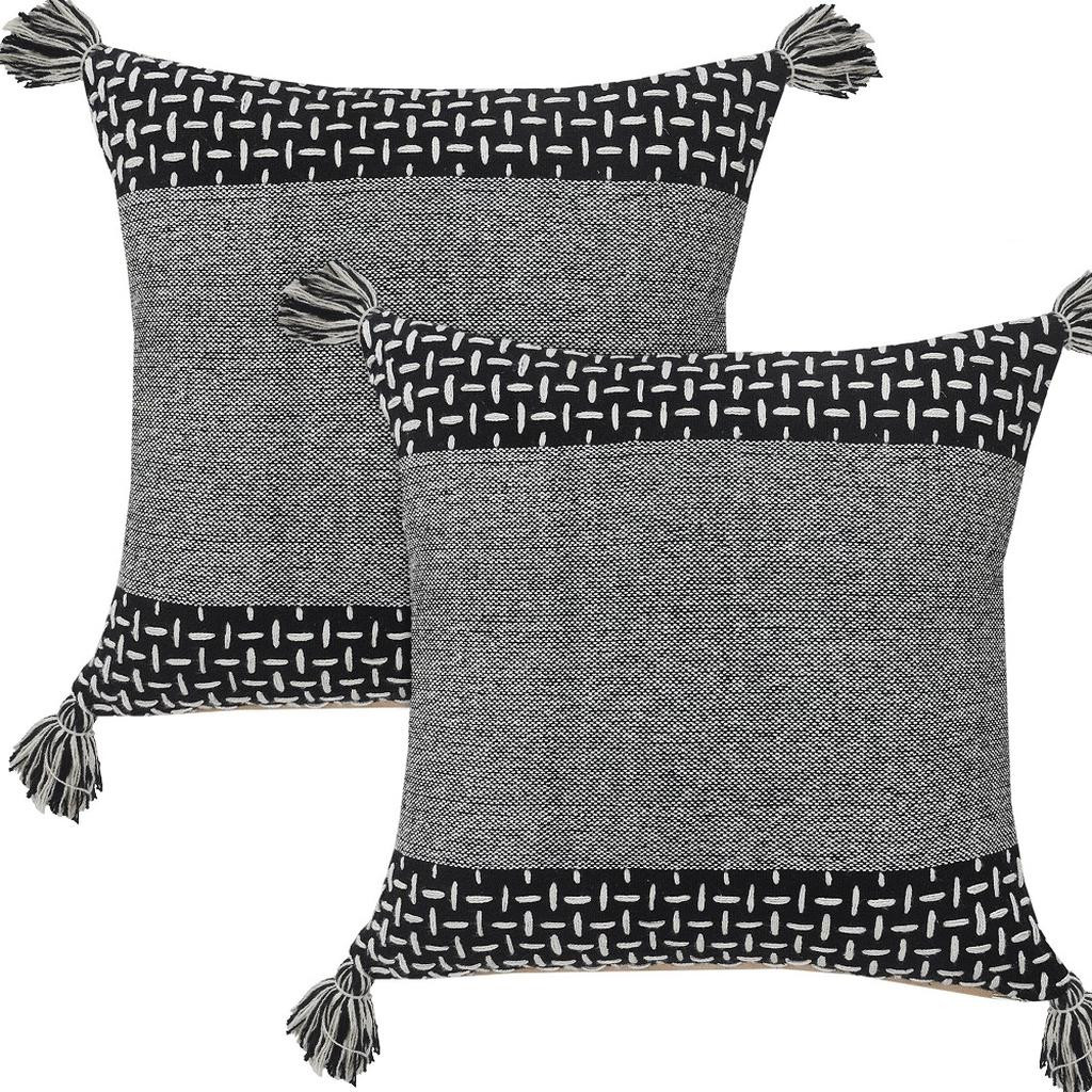 The set of two black and white geometric cotton throw pillows with tassels is the perfect decorative accessory for your home. These great looking soft decorative pillows are expertly made of durable and long lasting cotton in a black and white coloration. Fun and decorative tassels add some high end and hand-crafted textural designer touches. Decorative pillows are a great way to change up the look and feel of your space easily and quickly. Decorative throw pillows not only add color and dimension to your space but can be comfy and supportive when you are lounging and cuddling as well. 20.00-inch h x 20.00-inch w x 5.00-inch d.