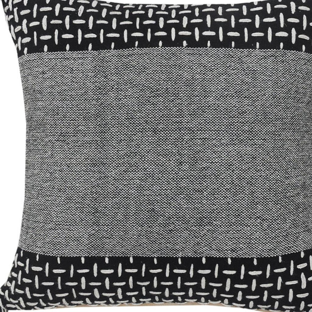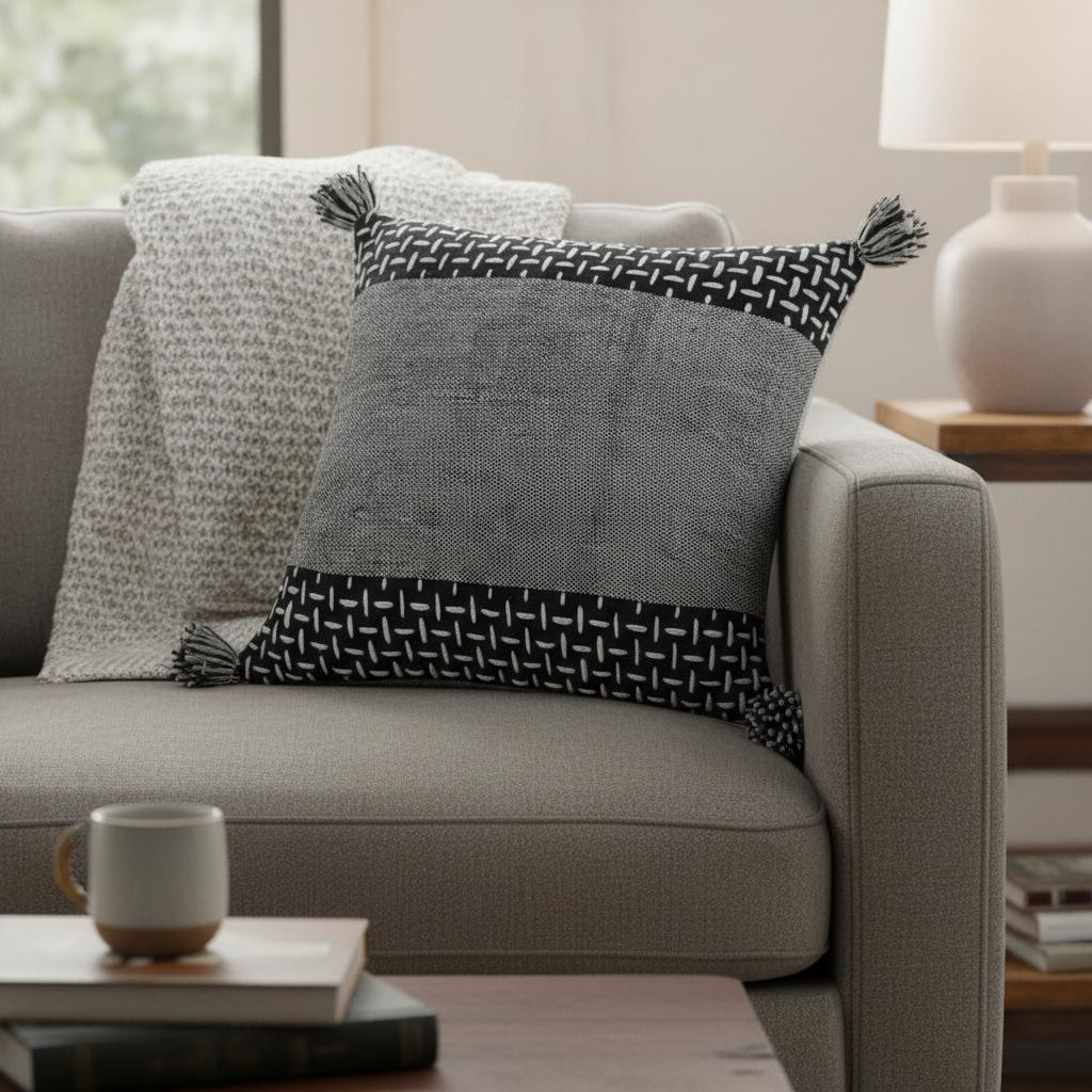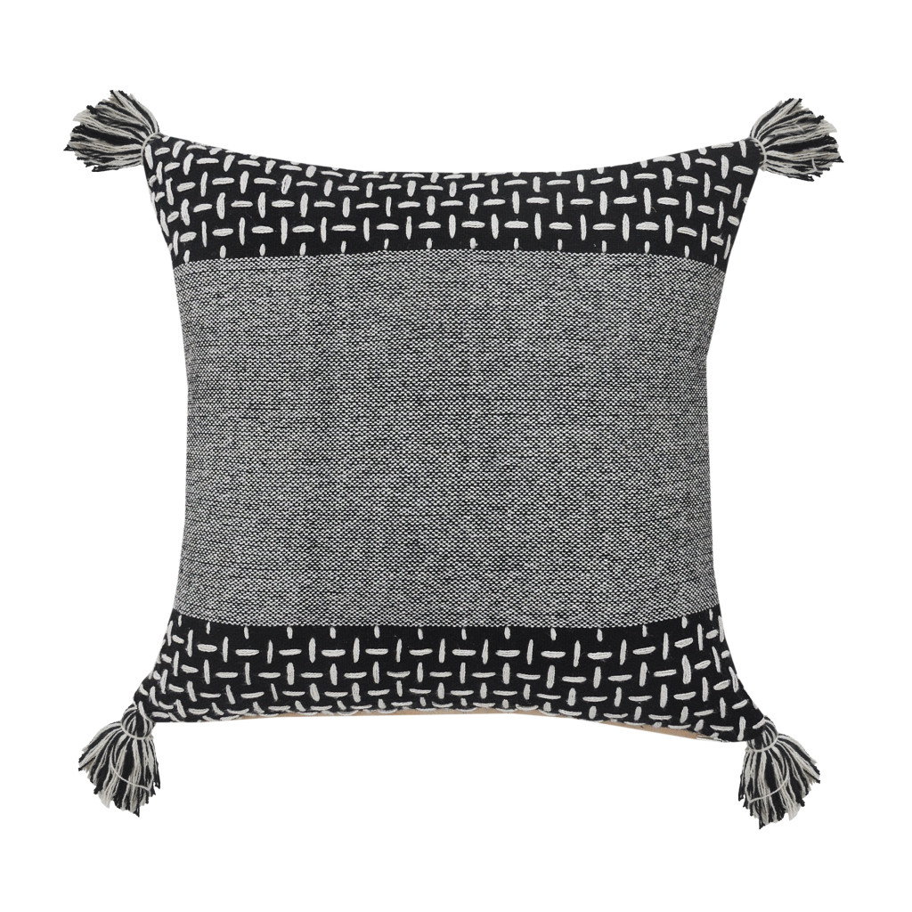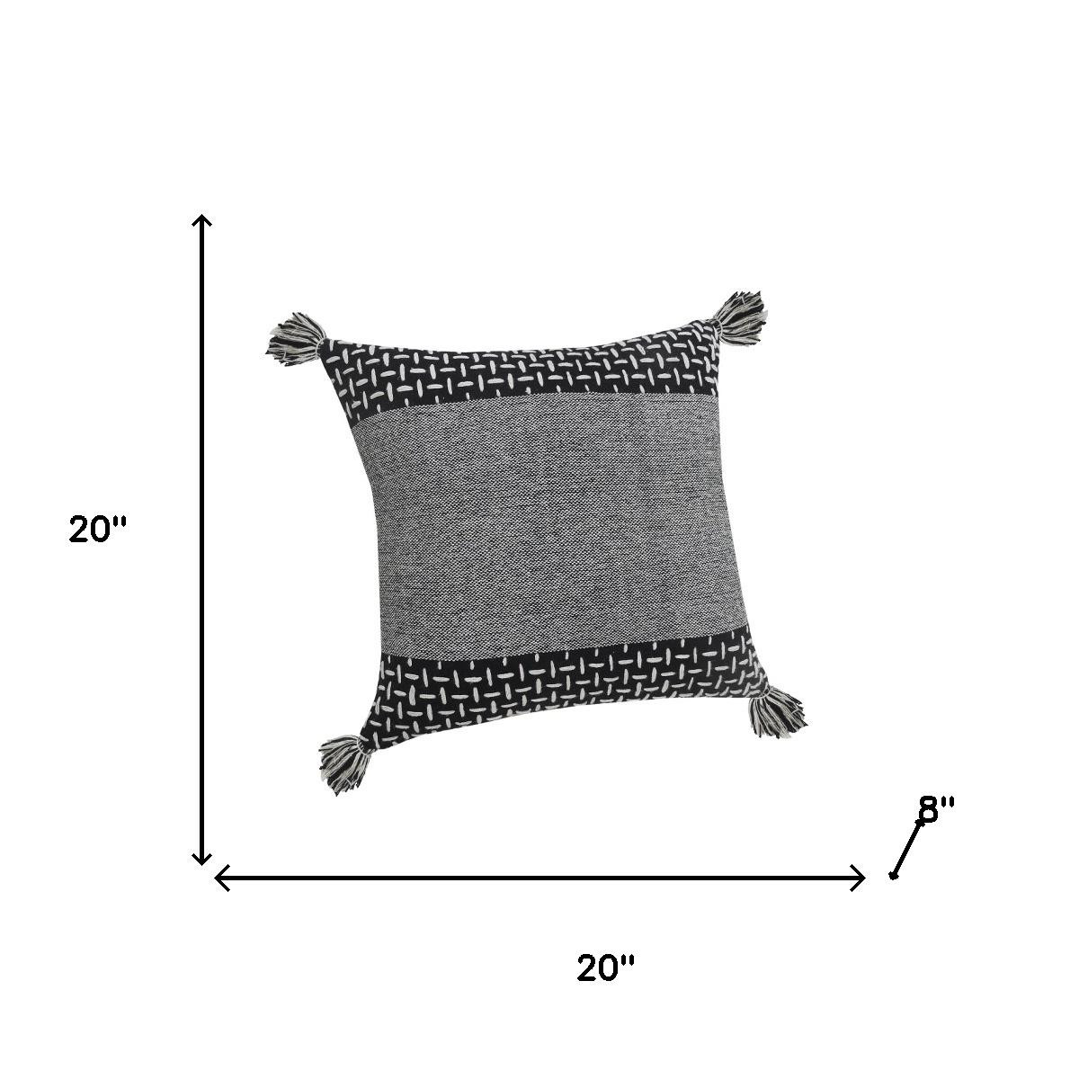 The 20-inch black and white geometric cotton throw pillow with tassels is the perfect decorative accessory for your home. Durable black and white cotton has been used to give this pillow a beautiful look that will stand the test of time. Charming decorative tassels give this design texture along with a hand-crafted look and feel. Great to use on its own or mix with other decorations for the perfect look. Decorative throw pillows not only add color and dimension to your space but can be comfy and supportive when you are lounging and cuddling as well. 20.00-inch h x 20.00-inch w x 8.00-inch d.
