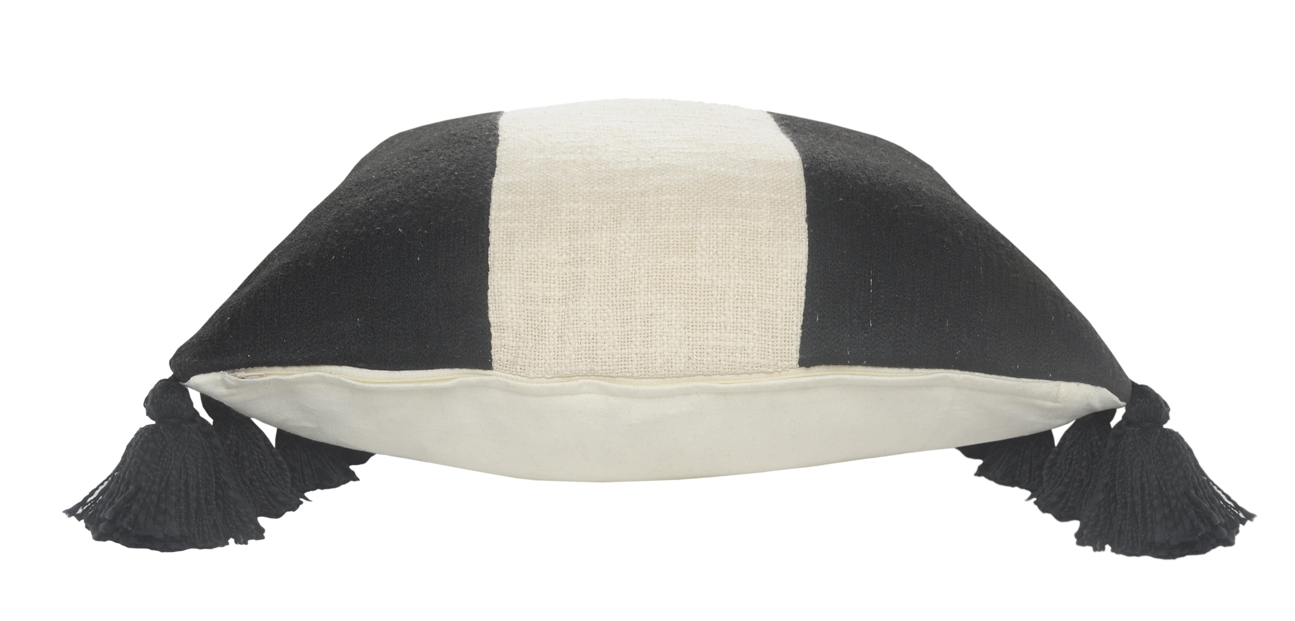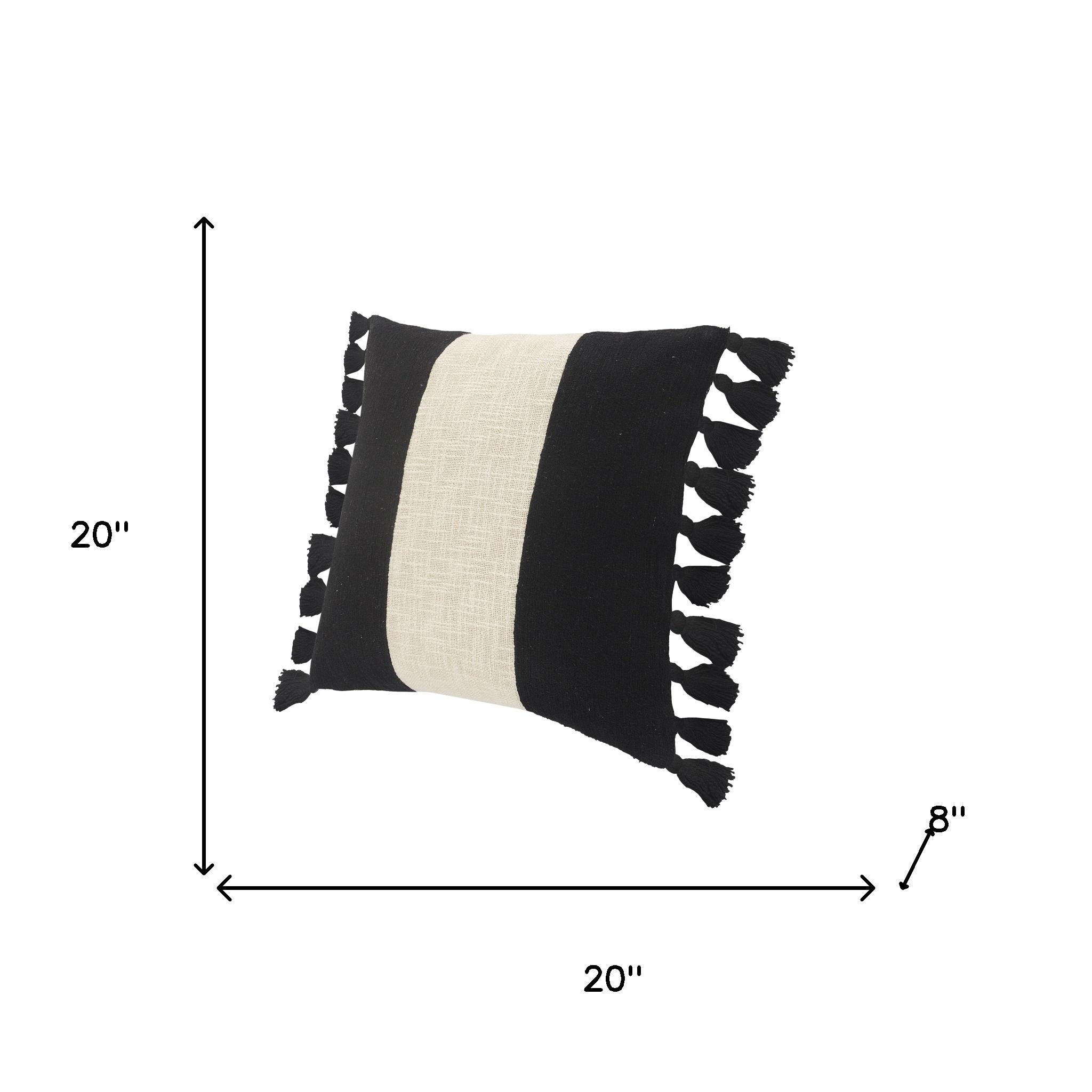 Unique and decorative, this comfortable 20-inch white and black striped cotton throw pillow with tassels will leave a lasting impression. This white and black colored decorative pillow is made from high grade cotton that is durable and long lasting. Charming decorative tassels give this design texture along with a hand-crafted look and feel. Decorative pillows are a great way to change up the look and feel of your space easily and quickly. A great decorative accessory to add color and dimension to your favorite chair, accent your sofa, or to use as part of your bed ensemble. 20.00-inch h x 20.00-inch w x 8.00-inch d.