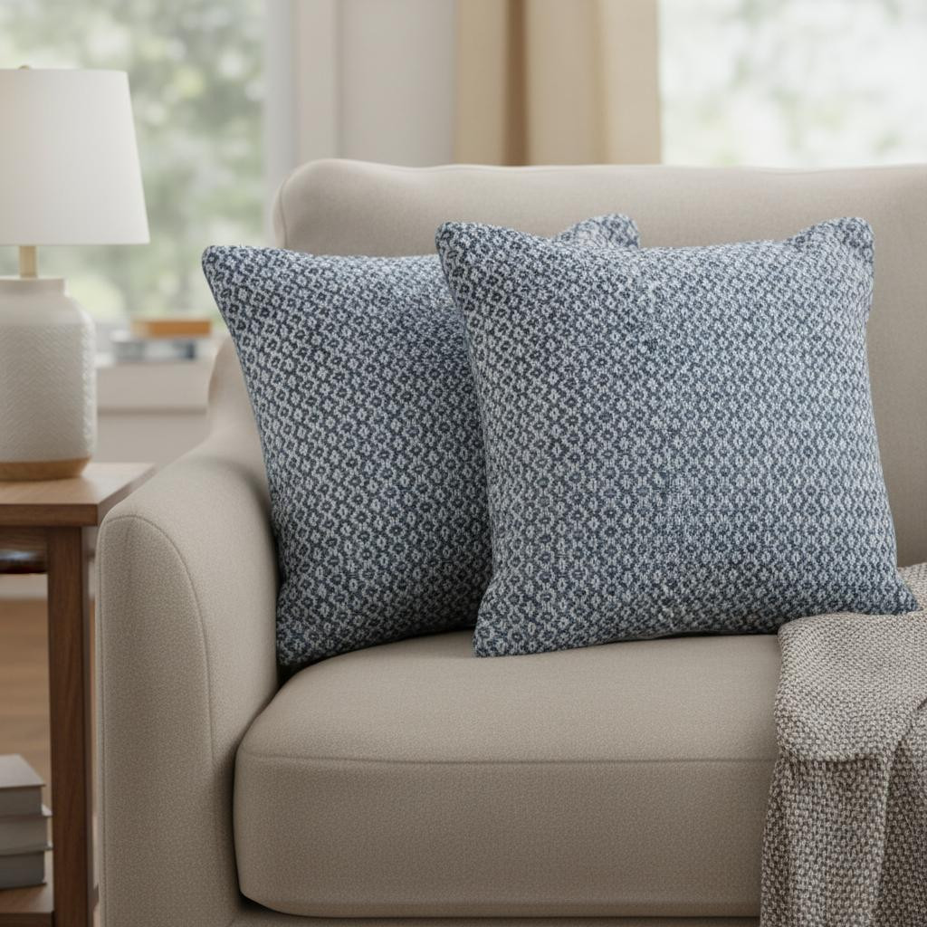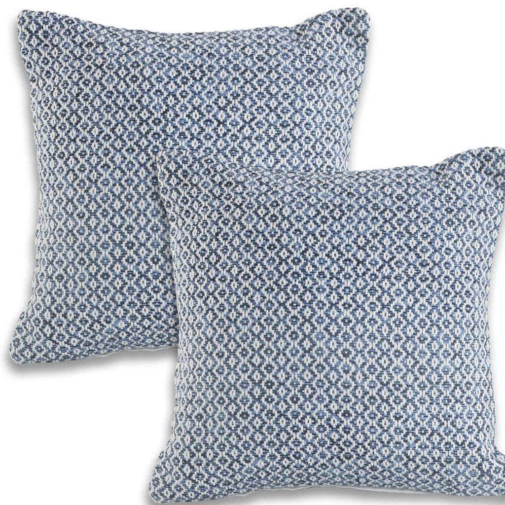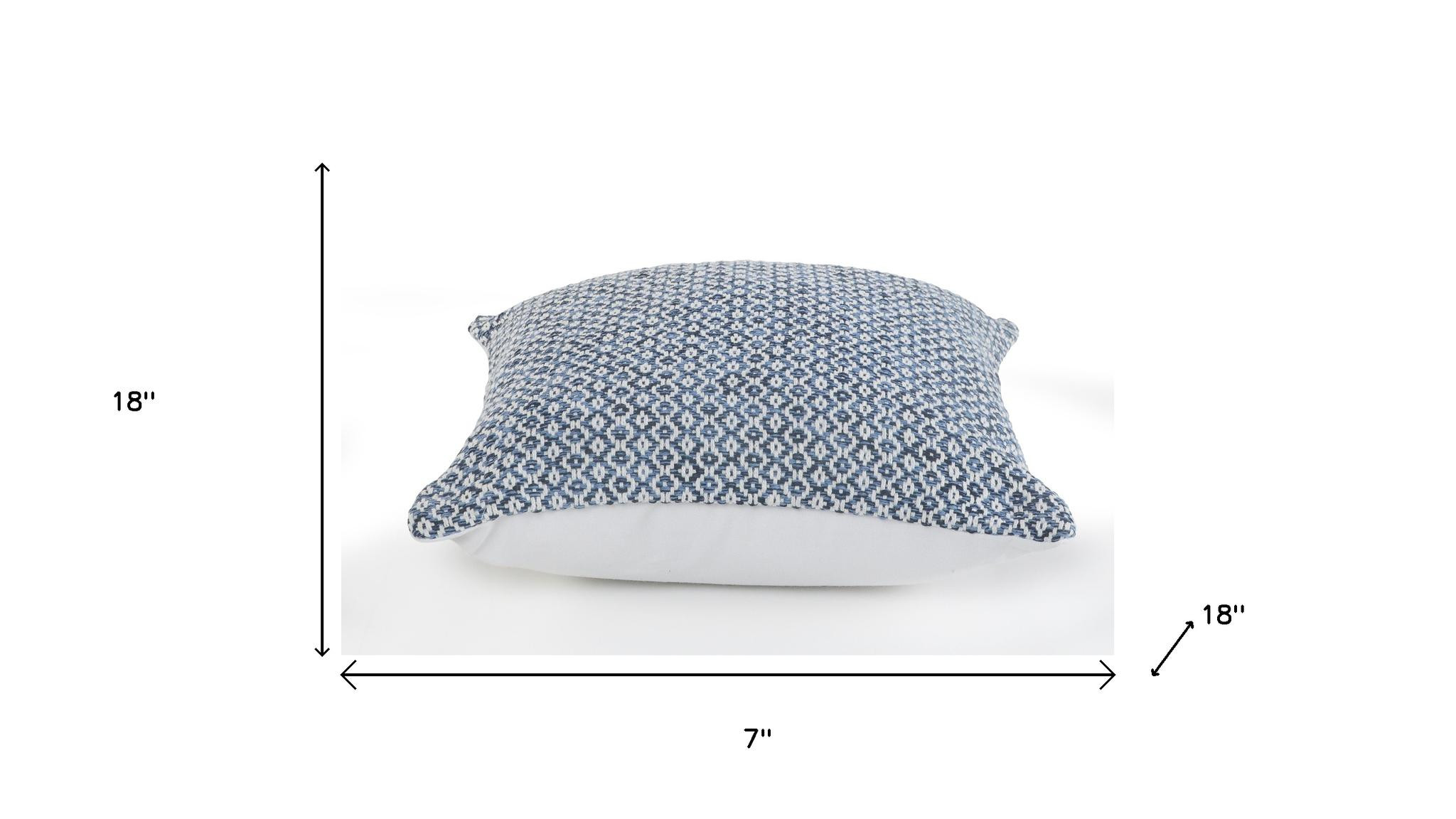 Unique and decorative, this comfortable set of two blue and white geometric cotton throw pillows with texture will leave a lasting impression. This blue and white colored decorative pillow set is made from high grade cotton that is durable and soft to the touch. For anyone that loves to decorate or accent their space with color and texture. A great decorative accessory to add color and dimension to your favorite chair, accent your sofa, or to use as part of your bed ensemble. 18.00-inch h x 18.00-inch w x 7.00-inch d.