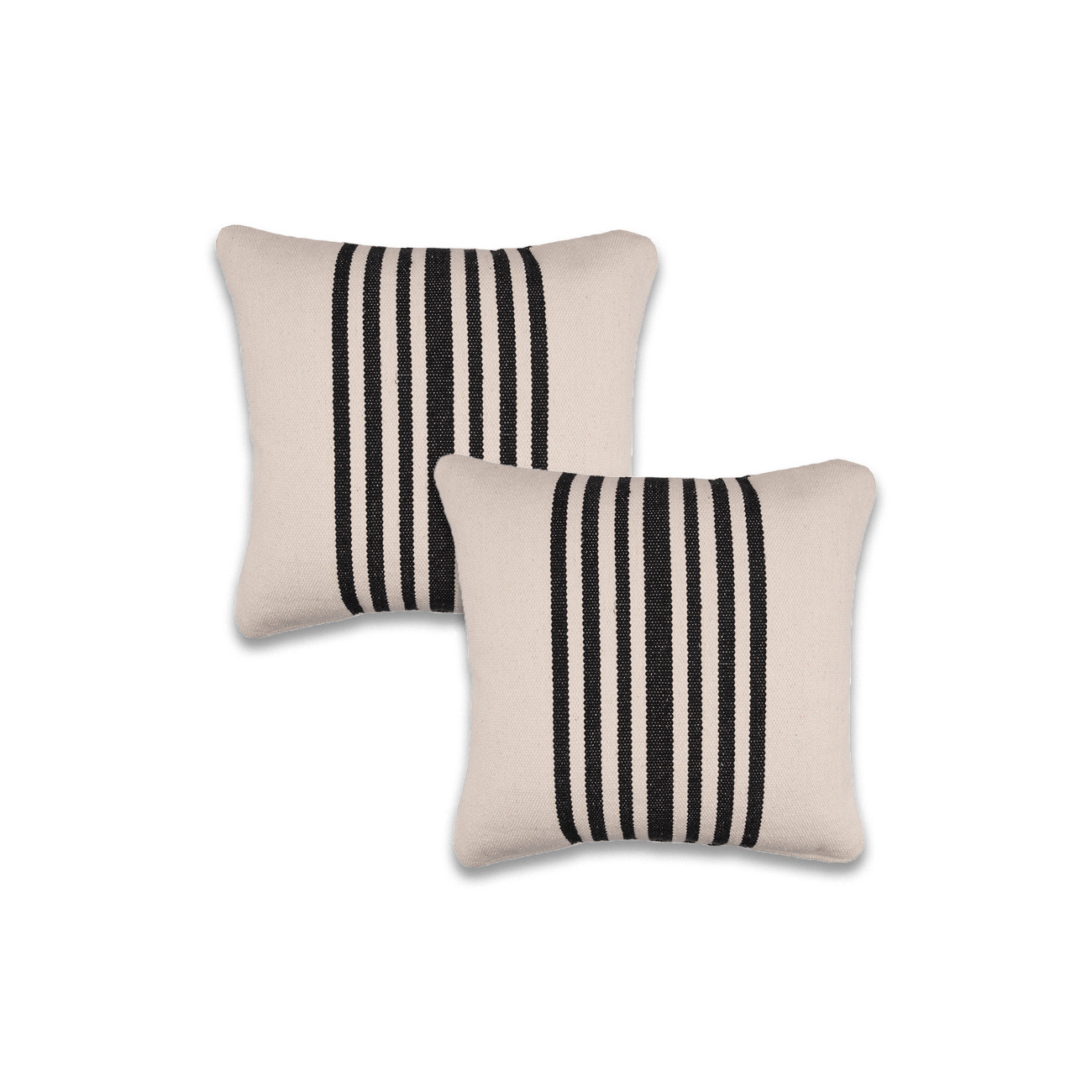 The set of two white and black striped cotton throw pillows with texture is the perfect decorative accessory for your home. The white and black coloring of the extremely durable and long lasting cotton pillows will add dimension and texture to your space. Great to use on its own or mix with other decorations for the perfect look. Decorative throw pillows not only add color and dimension to your space but can be comfy and supportive when you are lounging and cuddling as well. 22.00-inch h x 22.00-inch w x 9.00-inch d.