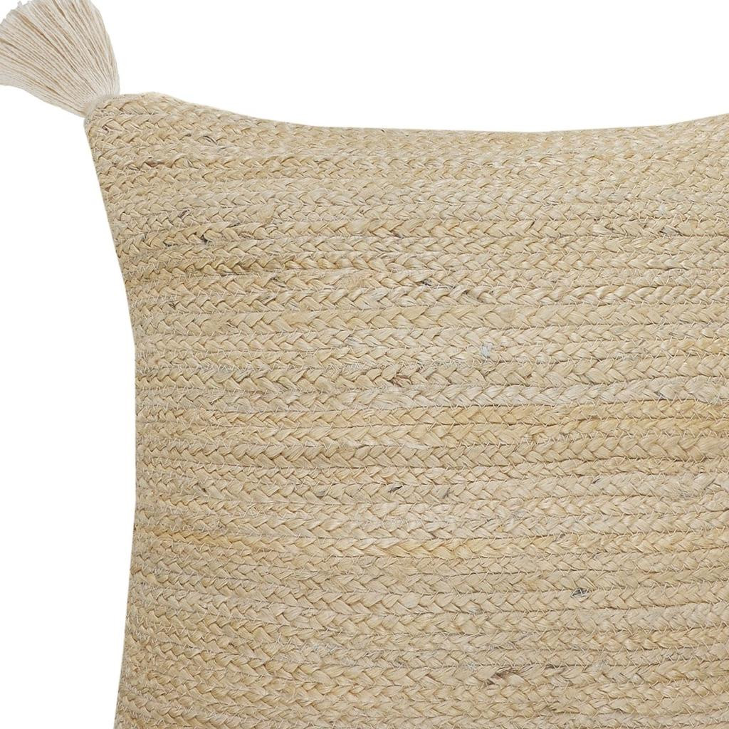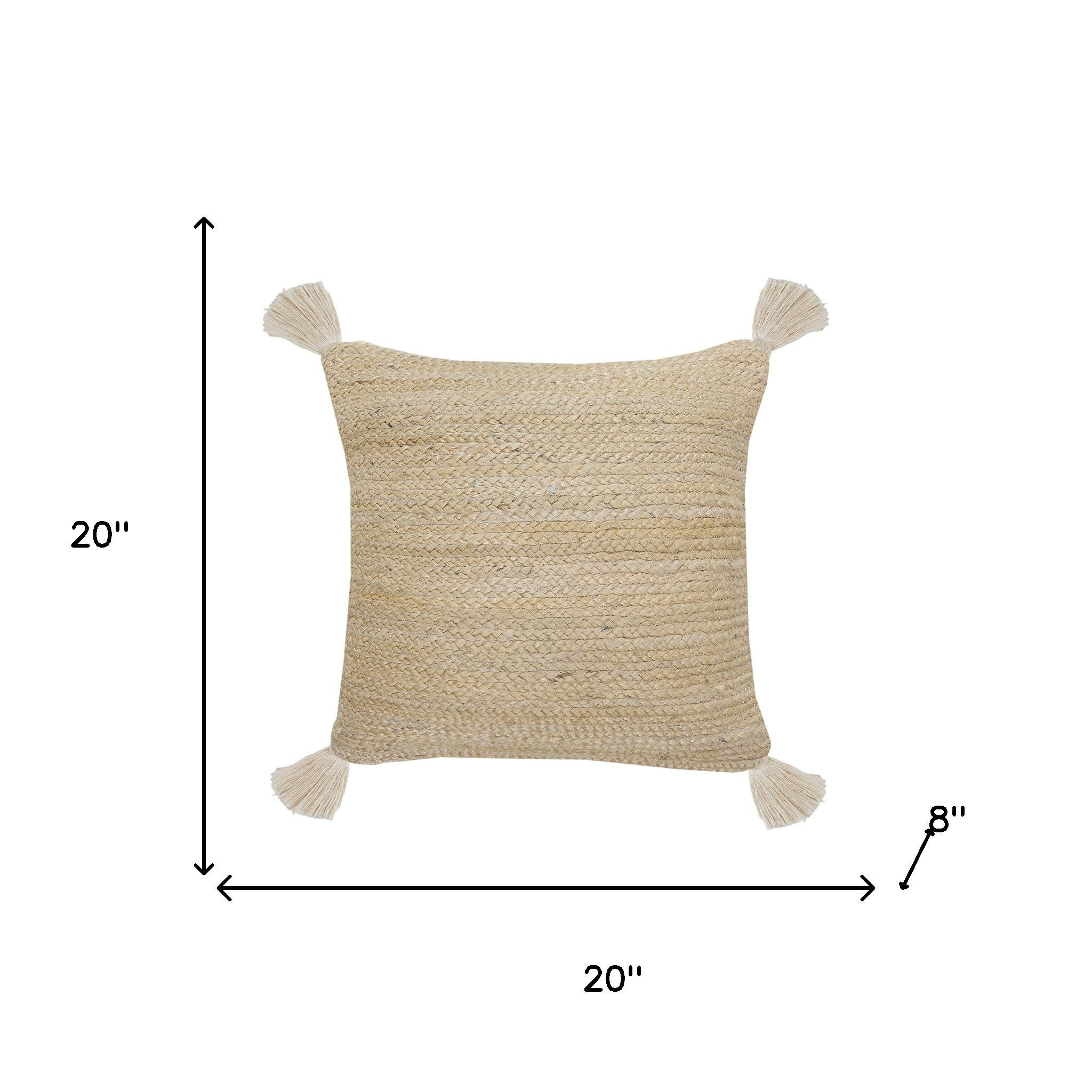 Bring a bit of fashion and zip to your space with this eye-catching and comfy 20-inch beige and white jute throw pillow with tassels. Durable beige and white jute has been used to give this pillow a beautiful look that will stand the test of time. Fun and decorative tassels add some high end and hand-crafted textural designer touches. Great to use on its own or mix with other decorations for the perfect look. Decorative throw pillows not only add color and dimension to your space but can be comfy and supportive when you are lounging and cuddling as well. 20.00-inch h x 20.00-inch w x 8.00-inch d.