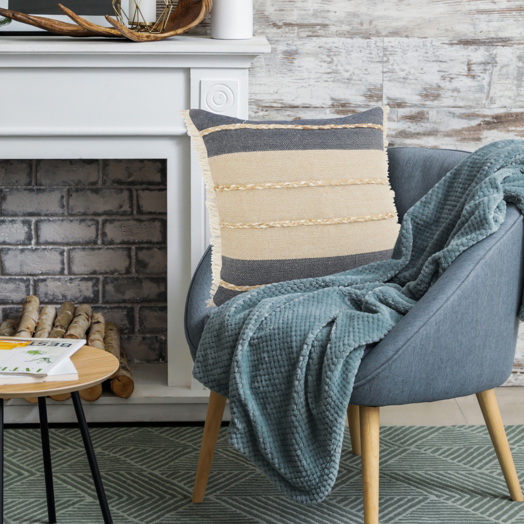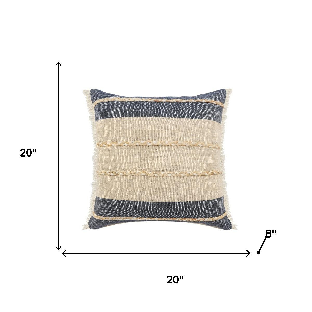 Bring a bit of fashion and zip to your space with this eye-catching and comfy 20-inch blue and beige striped jute throw pillow with fringe. This soft and durable decorative pillow is expertly made of high grade, long lasting jute in a blue and beige coloration. Decorative pillows are a great way to change up the look and feel of your space easily and quickly. A great decorative accessory to add color and dimension to your favorite chair, accent your sofa, or to use as part of your bed ensemble. 20.00-inch h x 20.00-inch w x 8.00-inch d.