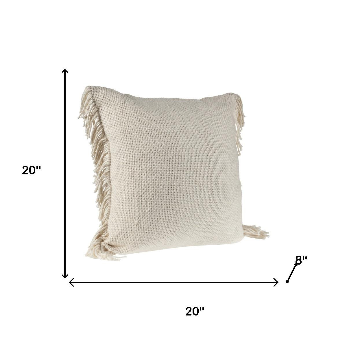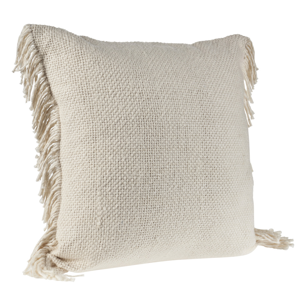 Add an air of fashion to your room and rejuvenate the space with this cute and fashionable 20-inch beige and ivory cotton throw pillow with fringe. This beige and ivory hued piece represents quality construction, expertly made from durable cotton that is not only long lasting but soft to the touch as well. For anyone that loves to decorate or accent their space with color and texture. Decorative throw pillows not only add color and dimension to your space but can be comfy and supportive when you are lounging and cuddling as well. 20.00-inch h x 20.00-inch w x 8.00-inch d.