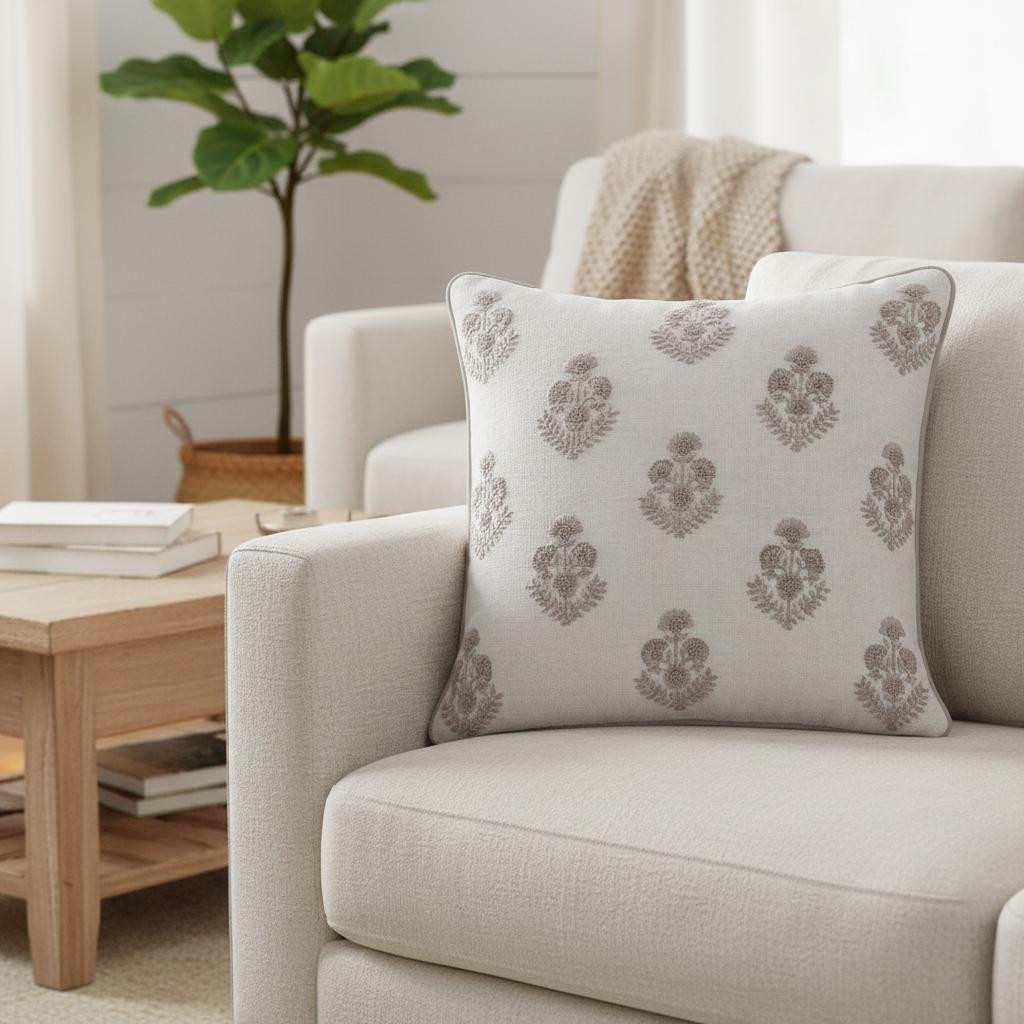 floral linen throw pillow embroidery, linen throw pillow embroidery, throw pillow embroidery, taupe floral linen throw pillow, floral linen throw pillow |
