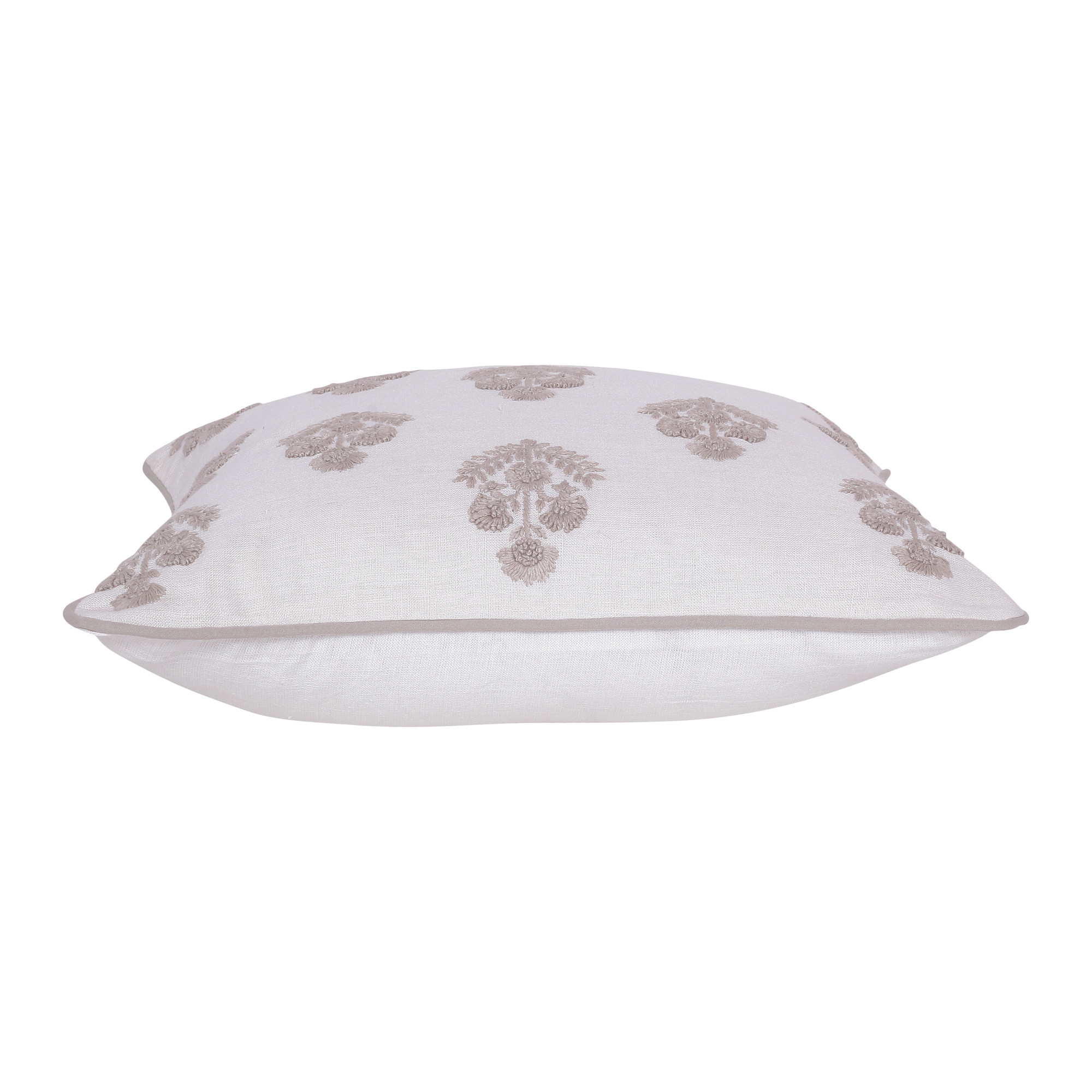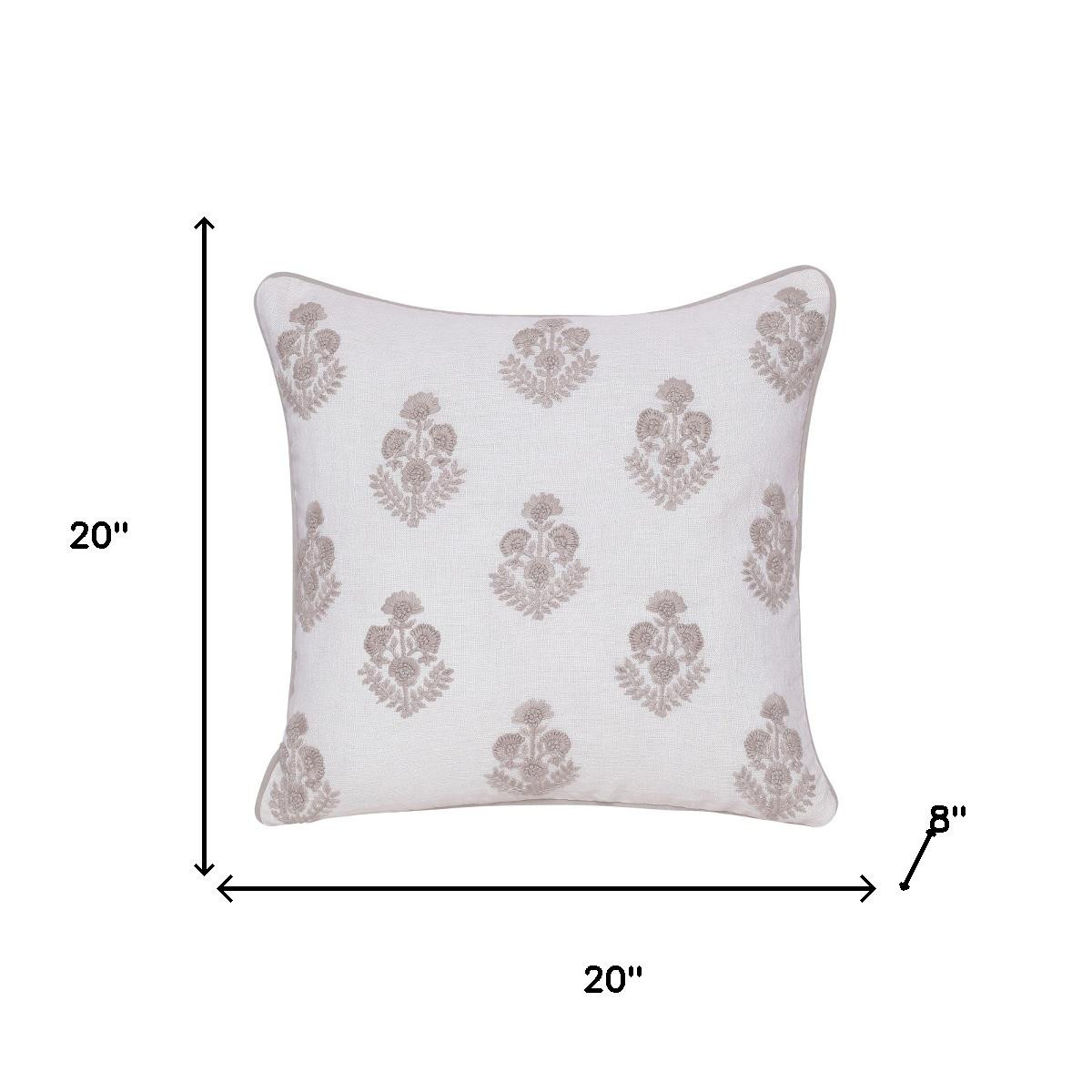 The 20-inch off white and taupe floral linen throw pillow with embroidery is the perfect decorative accessory for your home. This soft and durable decorative pillow is expertly made of high grade, long lasting linen in a off white and taupe coloration. Embroidered decorative accents add some high end and hand-crafted textural designer touches. Decorative pillows are a great way to change up the look and feel of your space easily and quickly. A great decorative accessory to add color and dimension to your favorite chair, accent your sofa, or to use as part of your bed ensemble. 20.00-inch h x 20.00-inch w x 8.00-inch d.