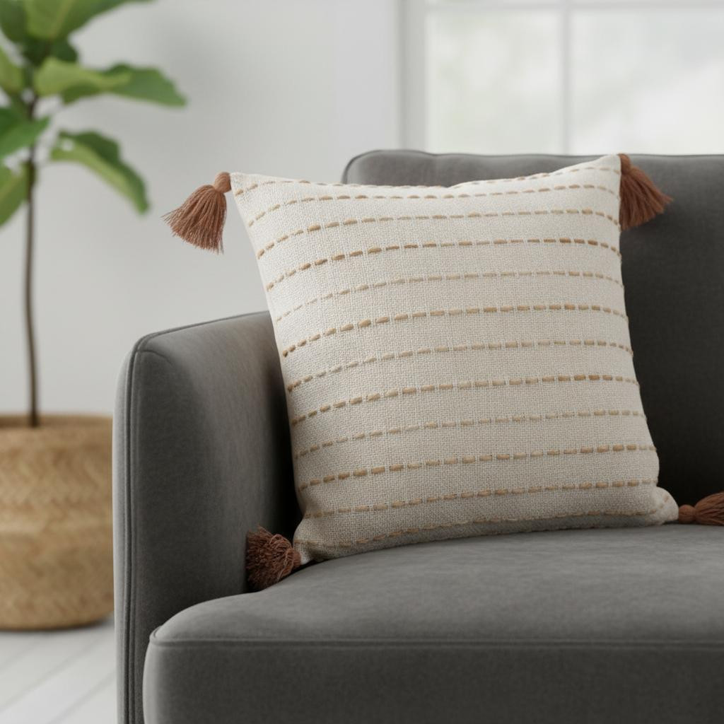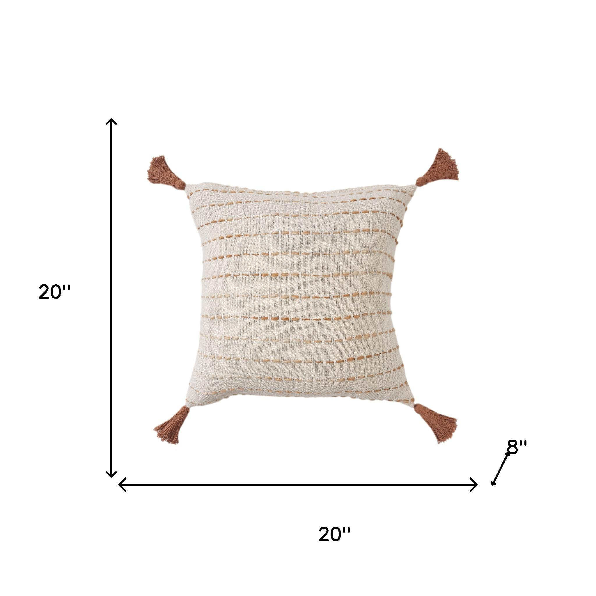 The perfect complement to your sofa, favorite chair, or bed, this 20-inch brown and ivory striped cotton blend throw pillow with fringe is a great decorative accent. This soft and durable decorative pillow is expertly made of high grade, long lasting cotton blend in a brown and ivory coloration. For anyone that loves to decorate or accent their space with color and texture. A great decorative accessory to add color and dimension to your favorite chair, accent your sofa, or to use as part of your bed ensemble. 20.00-inch h x 20.00-inch w x 8.00-inch d.