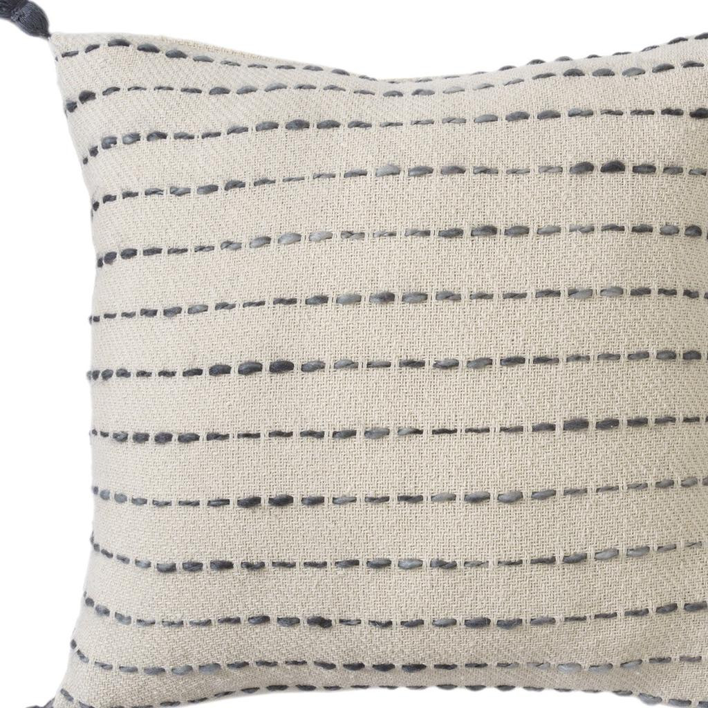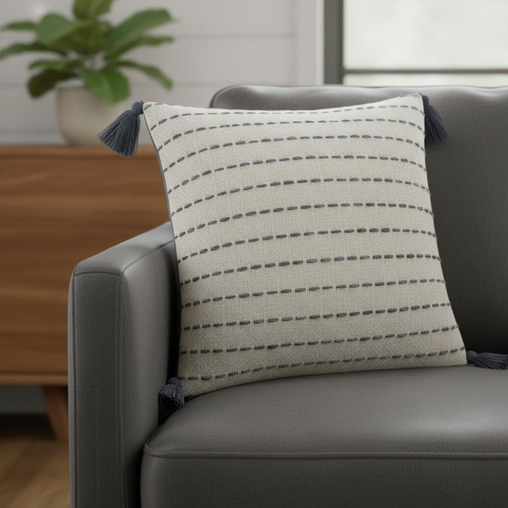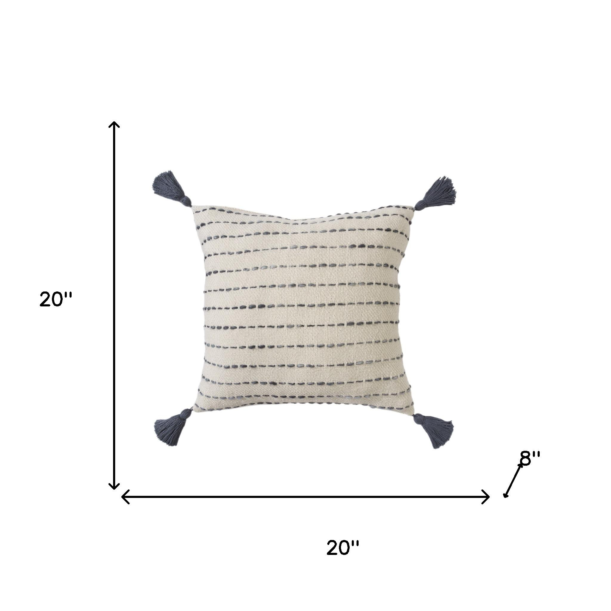 Unique and decorative, this comfortable 20-inch gray and ivory striped cotton blend throw pillow with fringe will leave a lasting impression. The gray and ivory coloring of the extremely durable and long lasting cotton blend will add dimension and texture to your space. Great to use on its own or mix with other decorations for the perfect look. Decorative throw pillows not only add color and dimension to your space but can be comfy and supportive when you are lounging and cuddling as well. 20.00-inch h x 20.00-inch w x 8.00-inch d.