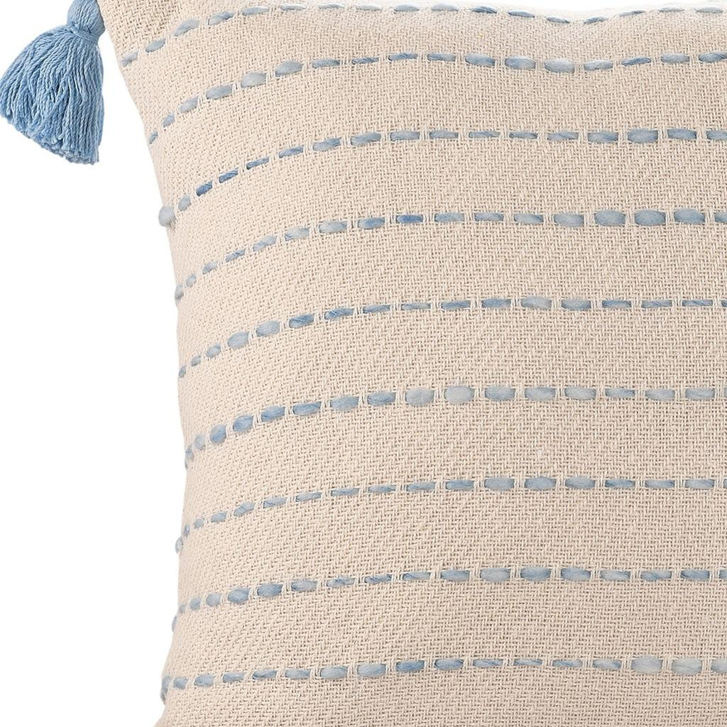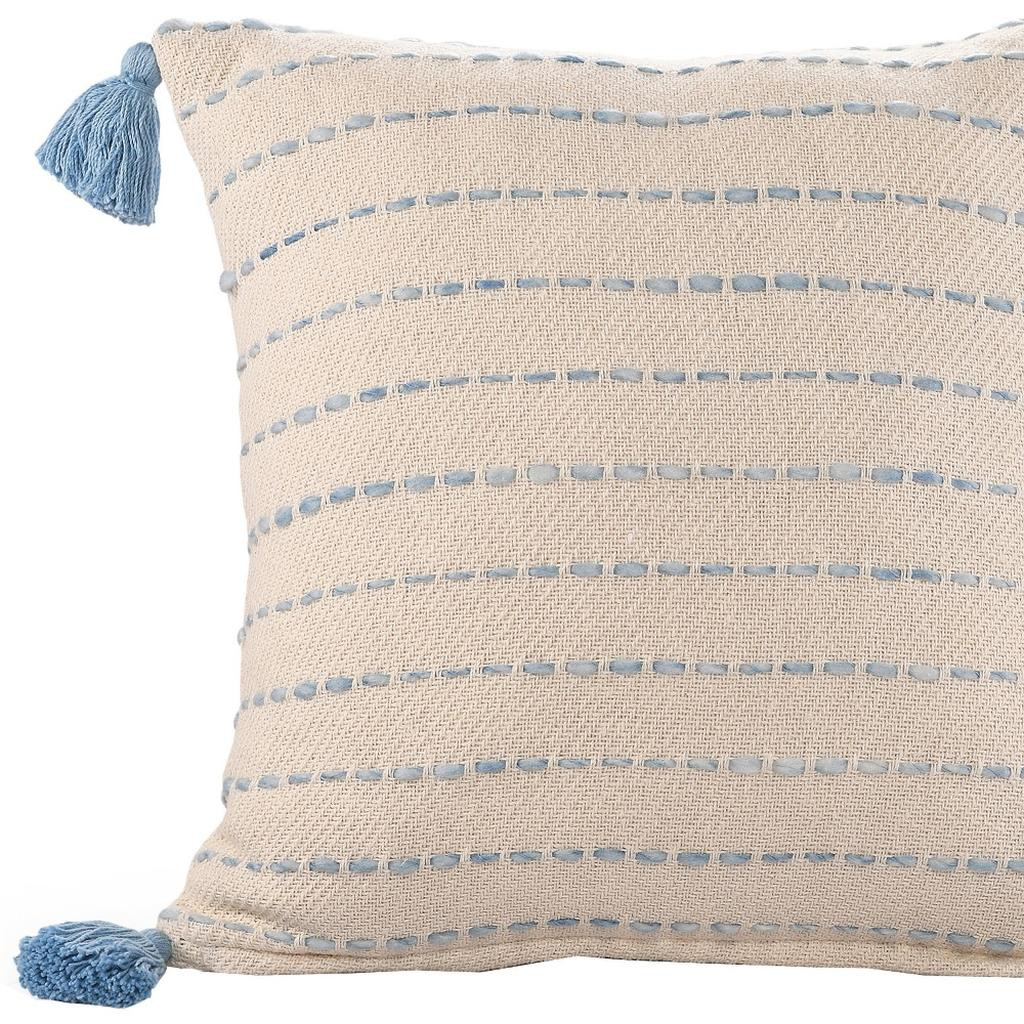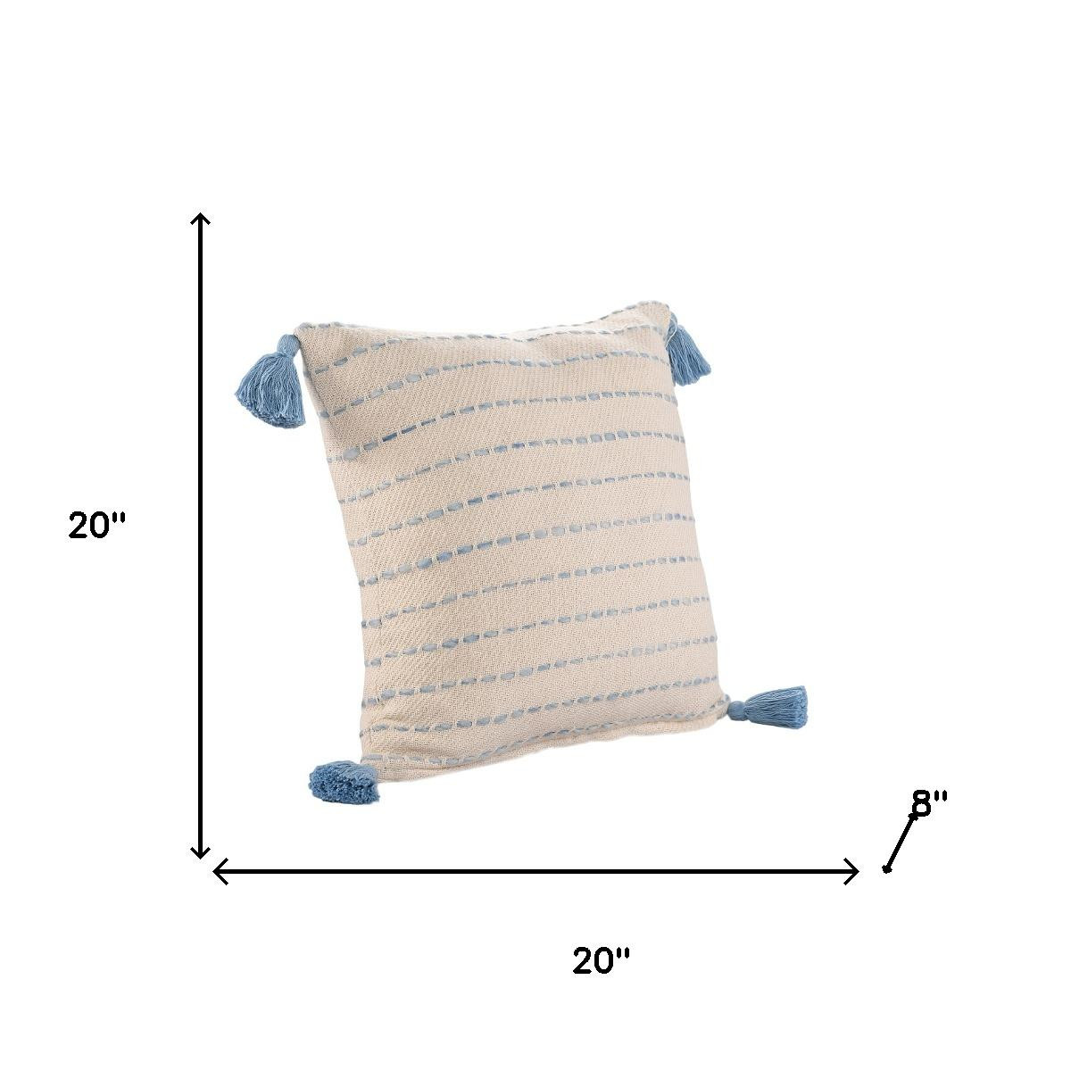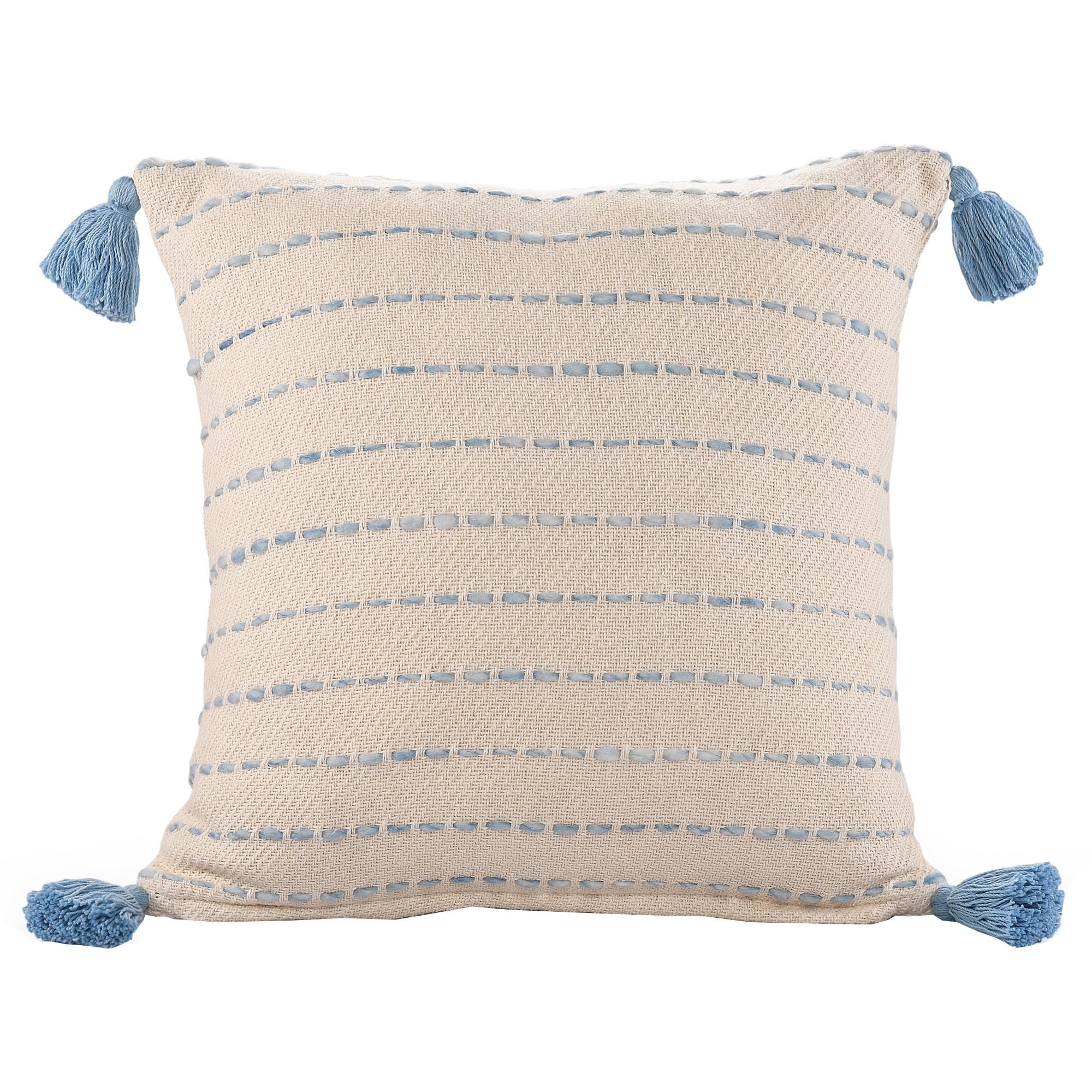 The perfect complement to your sofa, favorite chair, or bed, this 20-inch blue and ivory striped cotton blend throw pillow with fringe is a great decorative accent. Durable blue and ivory cotton blend has been used to give this pillow a beautiful look that will stand the test of time. Great to use on its own or mix with other decorations for the perfect look. Decorative throw pillows not only add color and dimension to your space but can be comfy and supportive when you are lounging and cuddling as well. 20.00-inch h x 20.00-inch w x 8.00-inch d.
