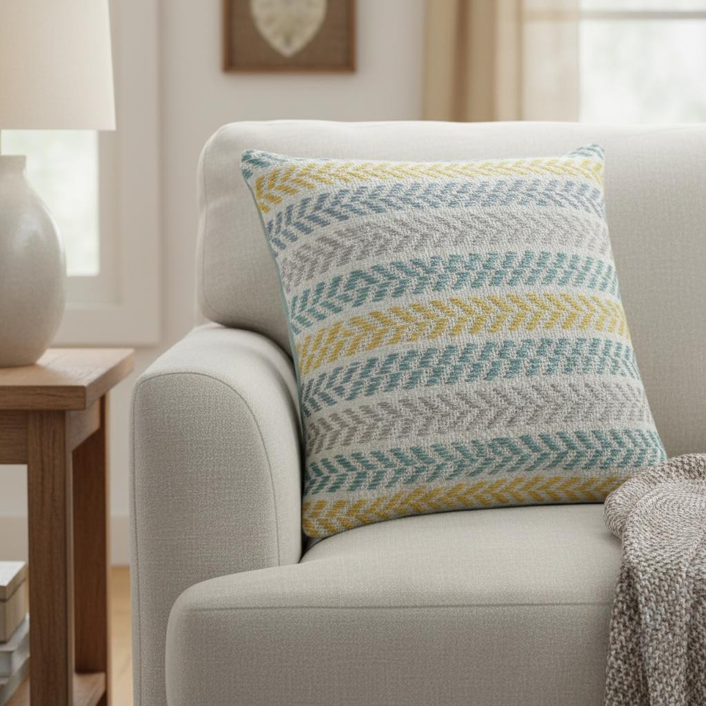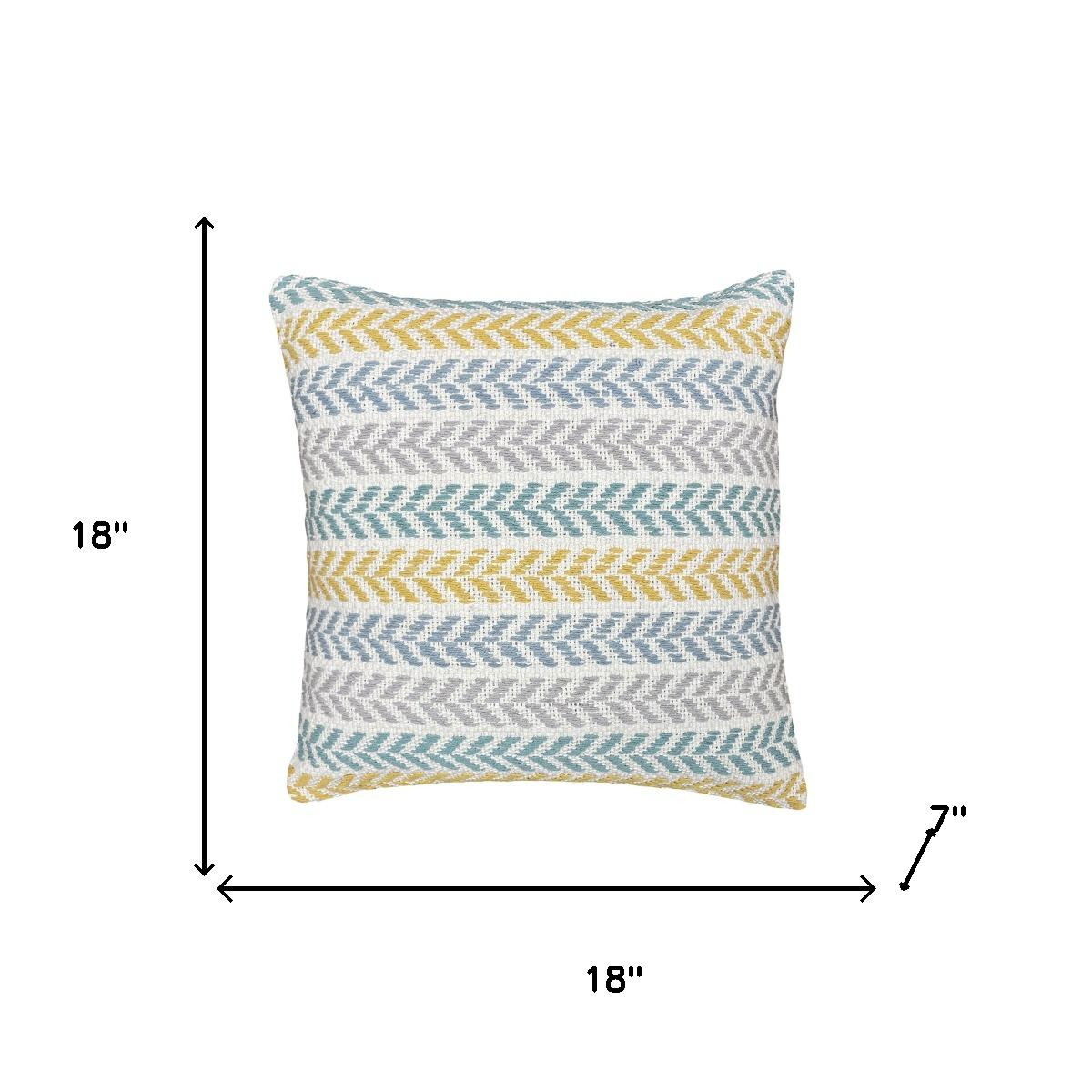 The perfect complement to your sofa, favorite chair, or bed, this 18-inch yellow and blue chevron cotton throw pillow with texture is a great decorative accent. The yellow and blue coloring of the extremely durable and long lasting cotton will add dimension and texture to your space. For anyone that loves to decorate or accent their space with color and texture. Decorative throw pillows not only add color and dimension to your space but can be comfy and supportive when you are lounging and cuddling as well. 18.00-inch h x 18.00-inch w x 7.00-inch d.