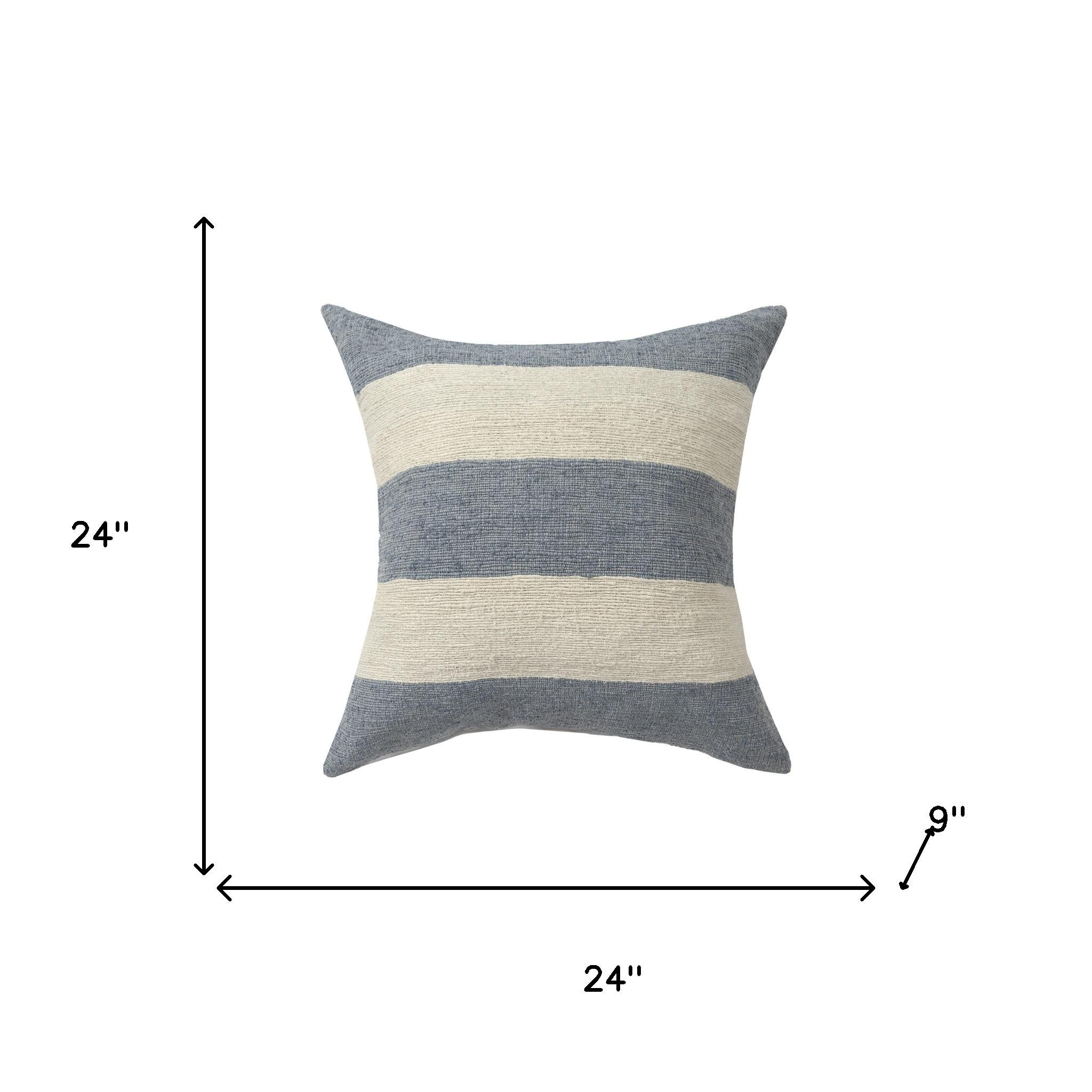 The perfect complement to your sofa, favorite chair, or bed, this 24-inch blue and ivory striped linen blend throw pillow is a great decorative accent. This blue and ivory hued piece represents quality construction, expertly made from durable linen blend that is not only long lasting but soft to the touch as well. Great to use on its own or mix with other decorations for the perfect look. Decorative throw pillows not only add color and dimension to your space but can be comfy and supportive when you are lounging and cuddling as well. 24.00-inch h x 24.00-inch w x 9.00-inch d.
