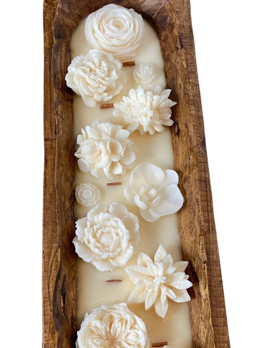 Don't miss out on the enchantment of candlelight. Embrace the convenience and beauty of this 20-inch ivory sandalwood scented six wick candle in brown distressed wood oval dough bowl today. This sandalwood scented candle is versatile and can be appreciated by many people. Whether it's a birthday, housewarming, or holiday gift, our scented candle offers a thoughtful and personalized option that shows care and attention to detail. Includes a rustic and artisanal wood bowl to complete the look. Let the warm glow of candlelight create an intimate and welcoming ambiance for your guests or a soothing atmosphere for yourself. 3.00-inch h x 20.00-inch w x 6.00-inch d.