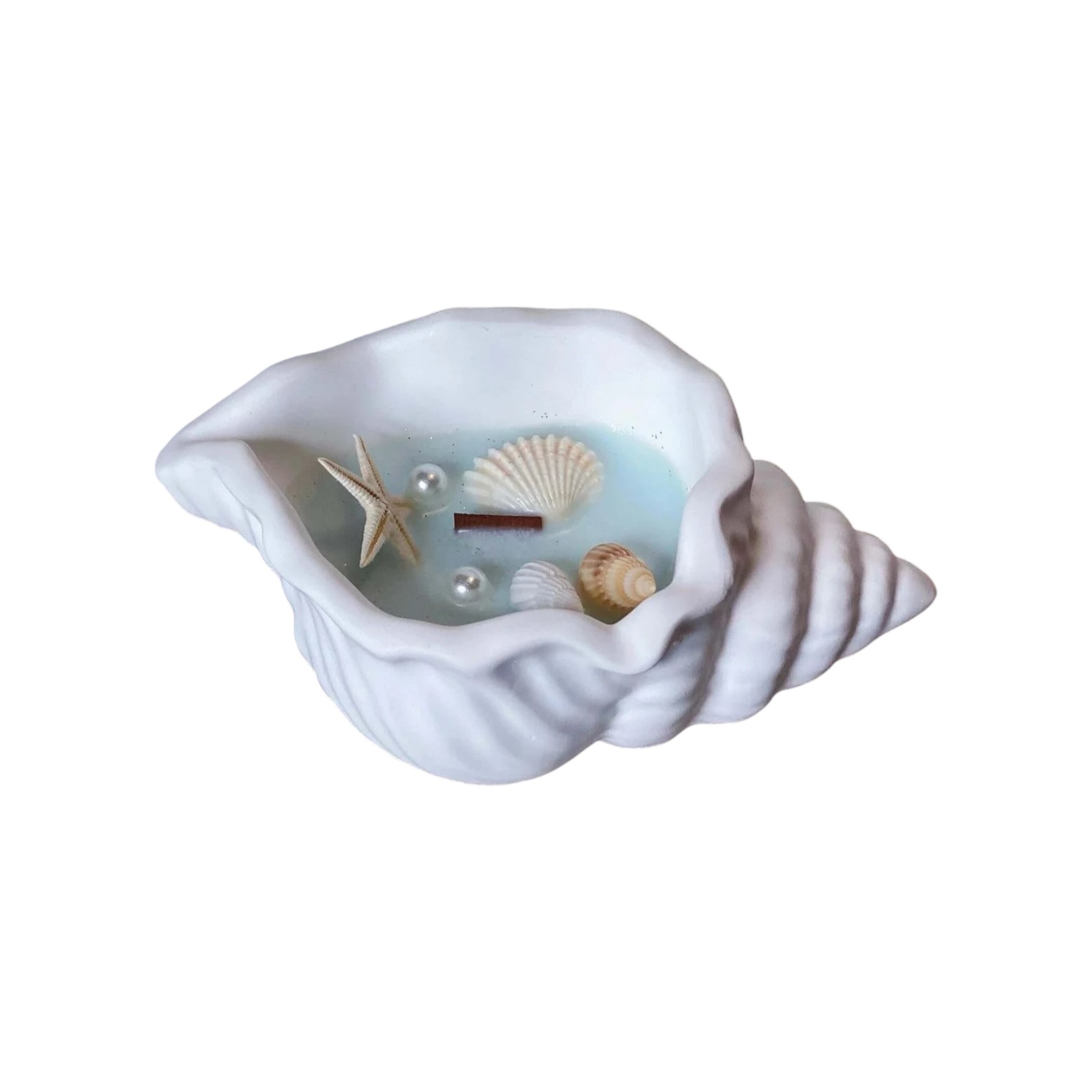You can illuminate your home with the elegance of this 6-inch light blue sea salt and orchid scented soy wax candle in white resin novelty holder. The gentle flickering flame and the fragrance of our sea salt and orchid scented candle can help reduce stress, promote relaxation, and enhance overall well-being. This unique seashell shaped resin candle holder features hand poured light blue premium wax that is accented with mini shells and pearls to bring a beachy coastal vibe to your space. Let the warm glow of candlelight create an intimate and welcoming ambiance for your guests or a soothing atmosphere for yourself. 6.50-inch h x 5.50-inch w x 2.00-inch d.