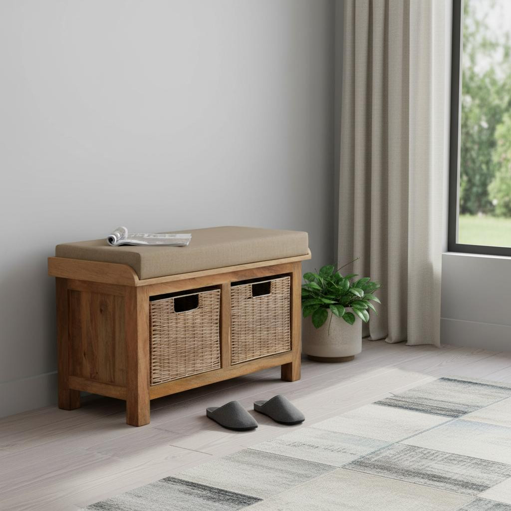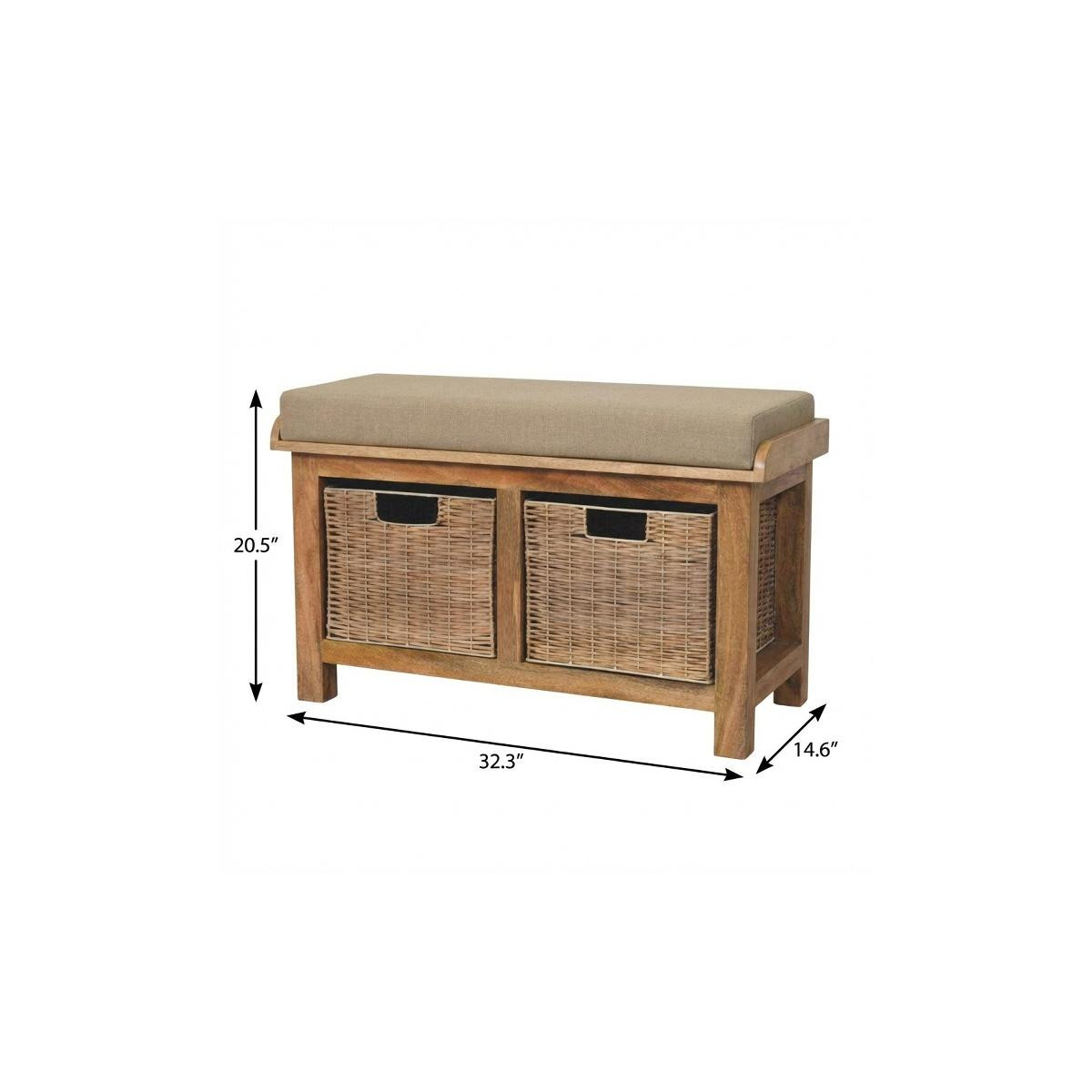 Optimize your space and add some charm to your room with the 32-inch beige and brown boucle and solid wood upholstered storage bench with baskets. A brown solid wood frame is finished off with a beige upholstery seat that is the epitome of quality construction and design. The included and removable baskets add to the casual charm and functionality. Ideal for entrance foyer, hallway, or laundry room. This bench is a great place store your keys, put on your shoes, or be a catchall on your way in or out. Benches don't have to be unsightly. Increase your seating and the fashion quotient of your room all at the same time with this hard wearing, versatile, and good looking bench. 20.50-inch h x 32.30-inch w x 14.60-inch d.