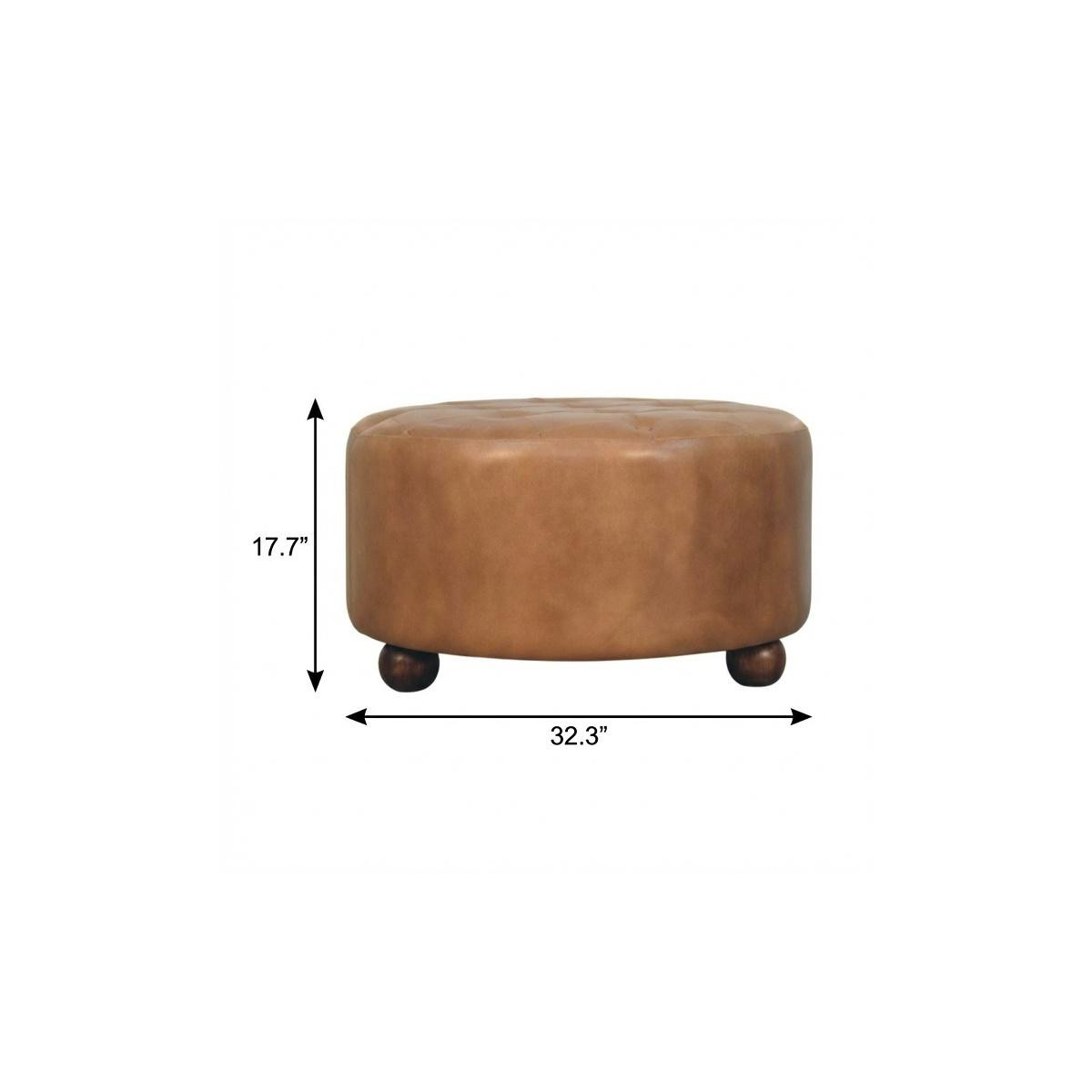 Get ready to relax with this 32-inch brown leather round footstool. This footstool is a treasure at the end of the day as an ideal place to rest your feet and legs and can also be used for extra seating when needed in a pinch. A brown monotone coloration gives this solid wood and upholstery ottoman a fresh and updated look. Easy to blend into most any room, a ottoman is a way to add a good looking accent to your space that can also be practical and useful. 17.70-inch h x 32.30-inch w x 32.30-inch d.