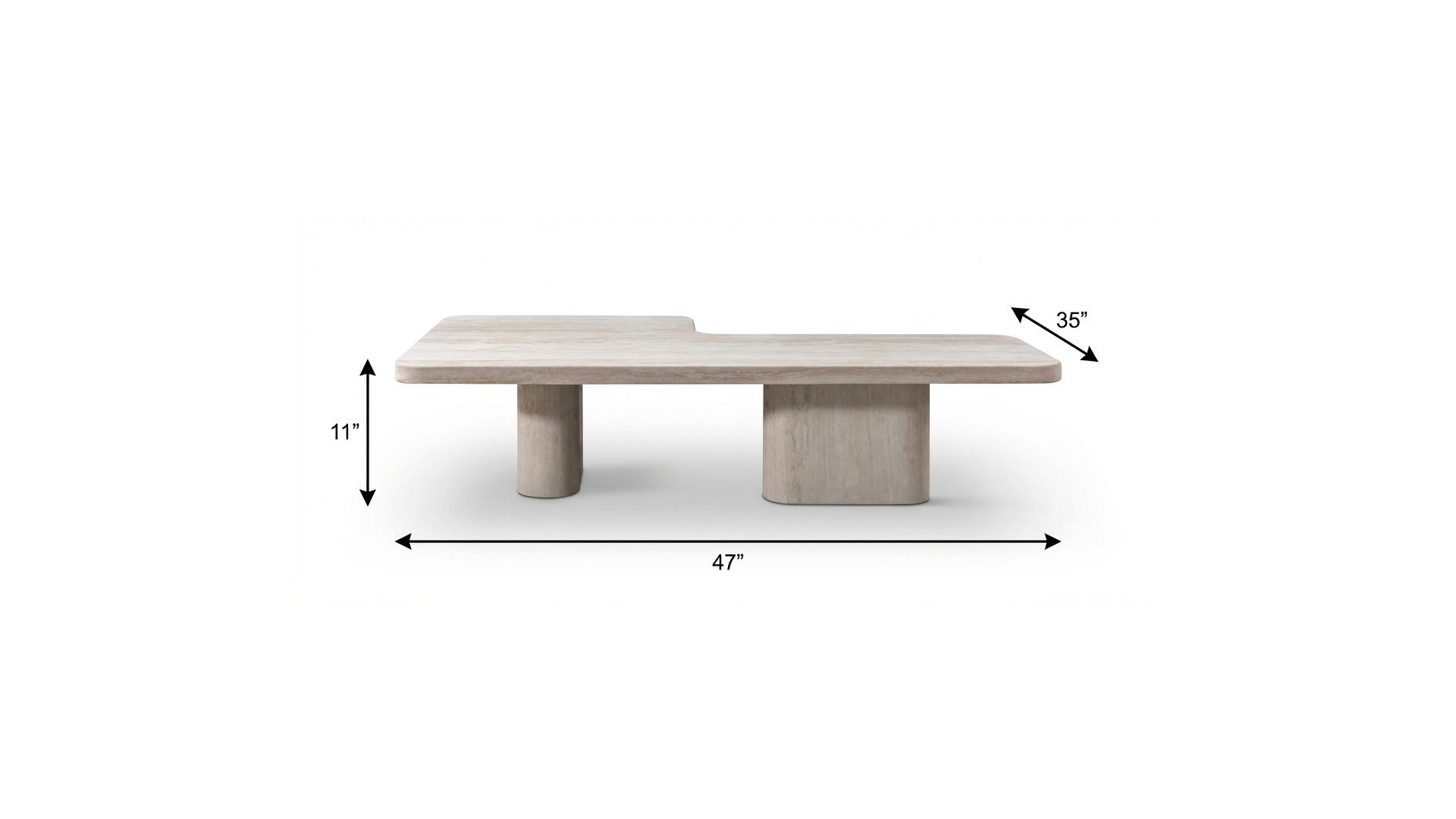 Make your living room or family room really stand out with this 47-inch beige genuine marble and marble free form double pedestal coffee table. A sleek beige monotone color gives this marble and genuine marble table a fresh and updated look. This free form table features a fresh and stylish shape to give your room a visually pleasing accent. It has an attractive design that will definitely breathe some fresh air into your interior. 11.00-inch h x 47.00-inch w x 35.00-inch d.