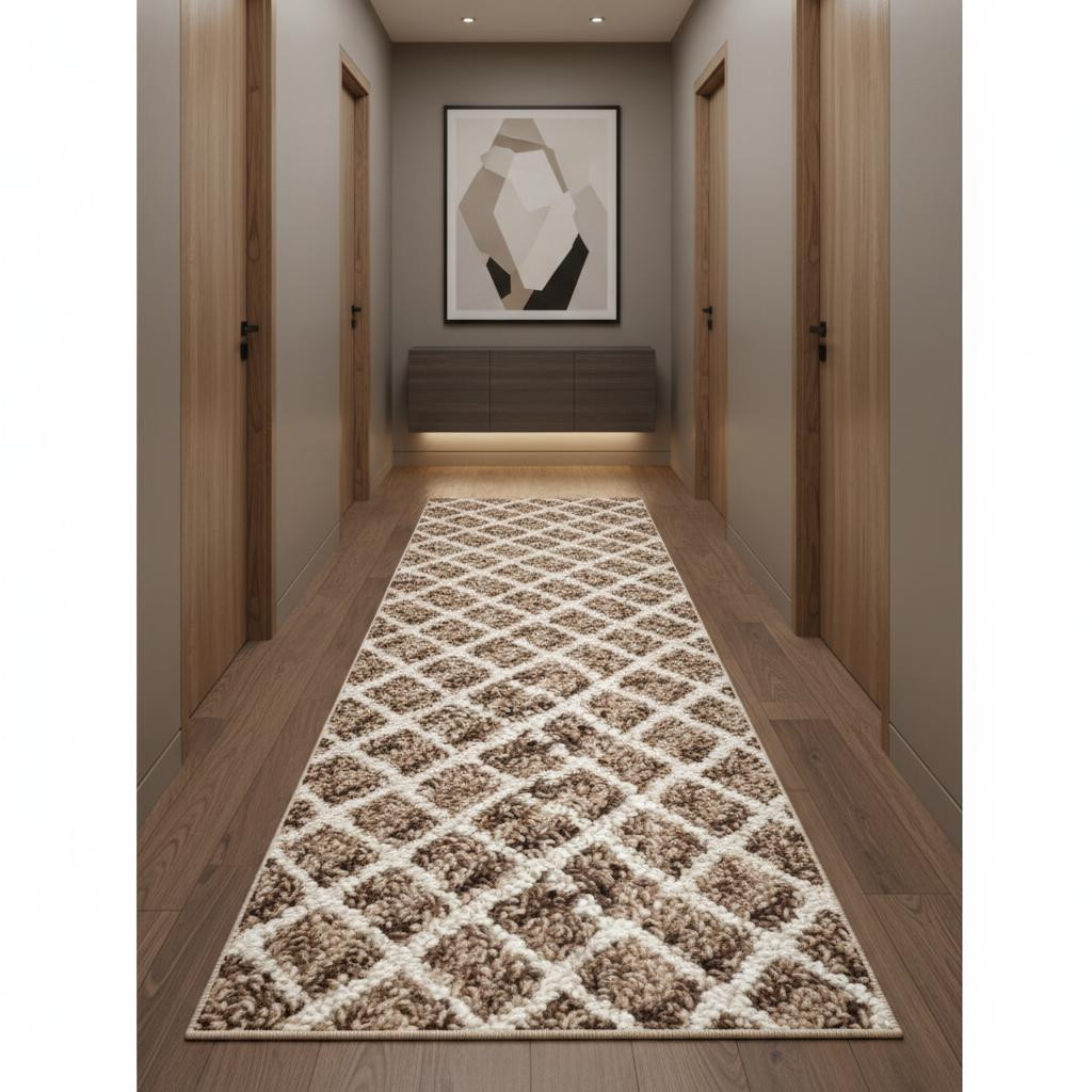 Add some artistry to your room with this 3-foot x 10-foot brown and gray geometric runner rug. Ideal for spaces with kids and pets, this rug is stain resistant to help repel dirt and spilled liquids. Built to last, this rug crafted from polyester fibers is known for its durability and long lasting appeal. This modern style runner makes a great accent for the hallway, in front of cabinets, in the laundry room, or any other space you need a narrow and long rug. 31.00-inch h x 120.00-inch w x 0.40-inch d.