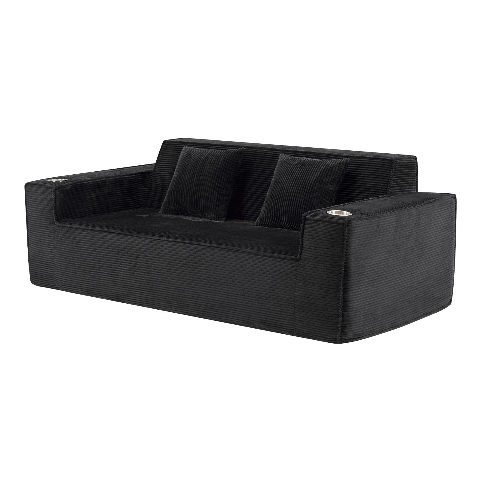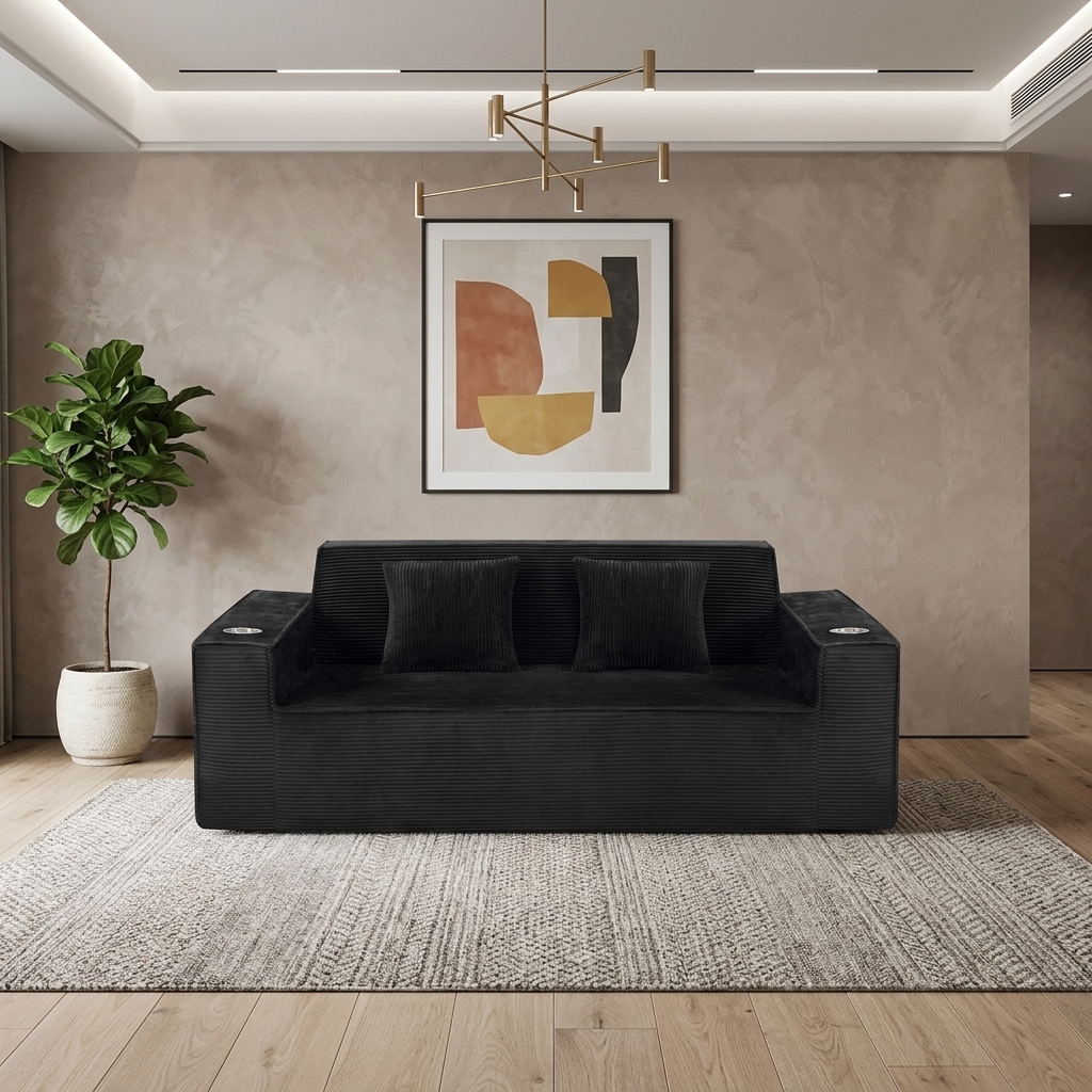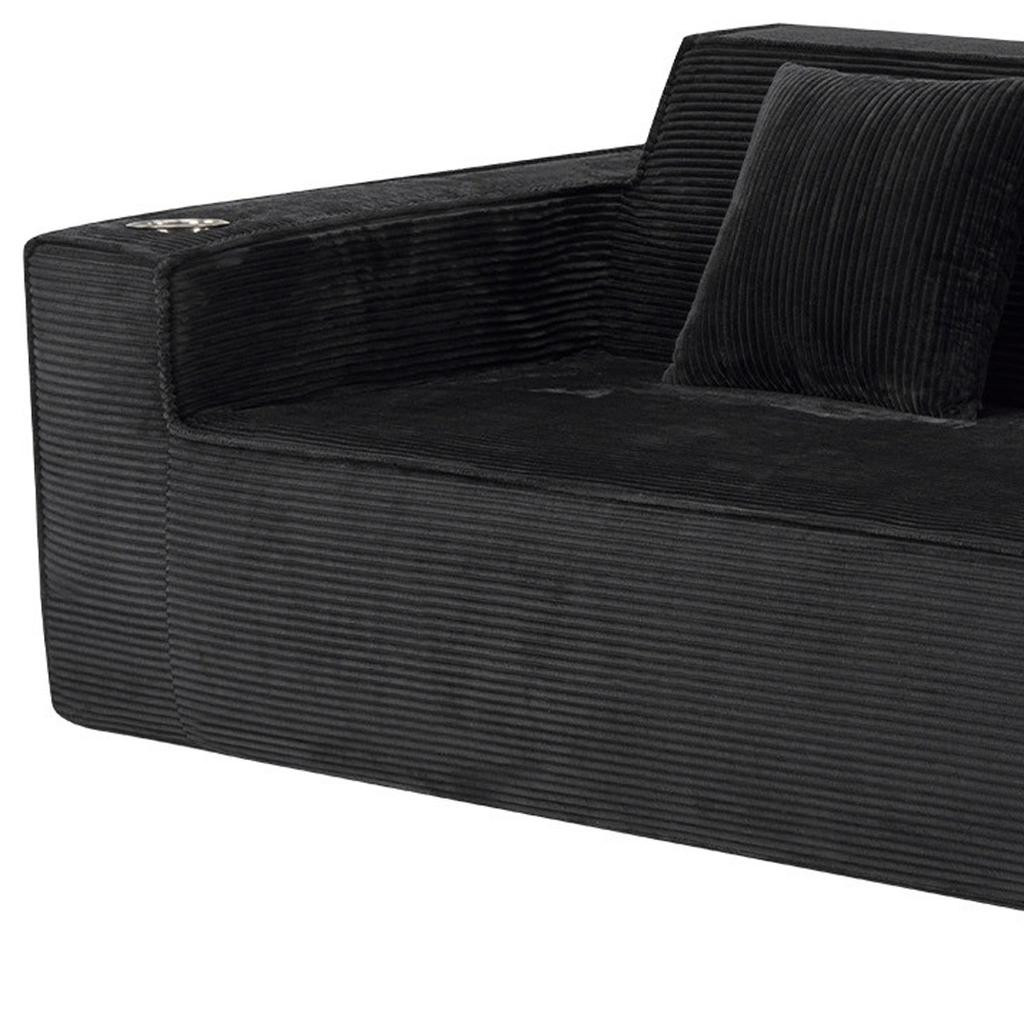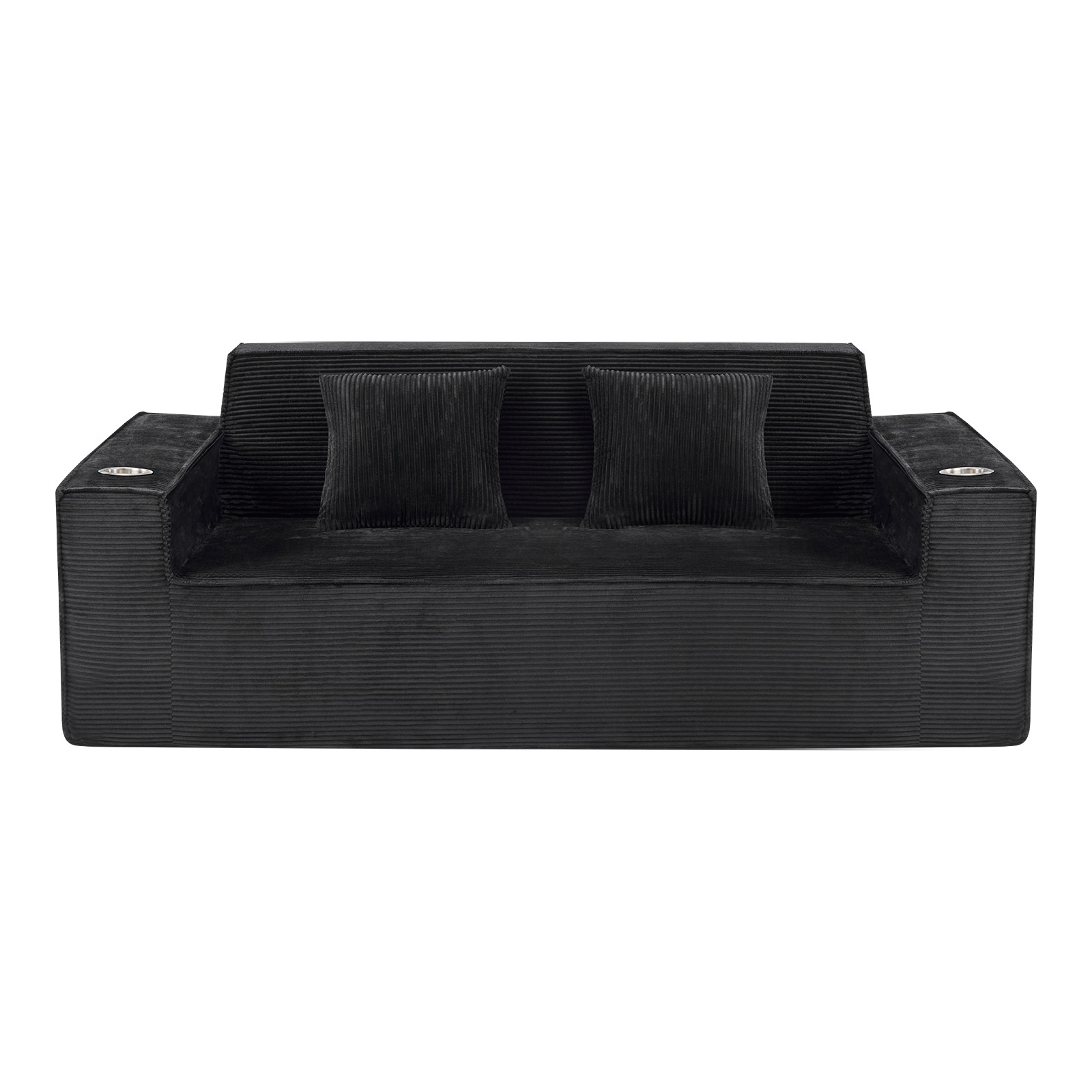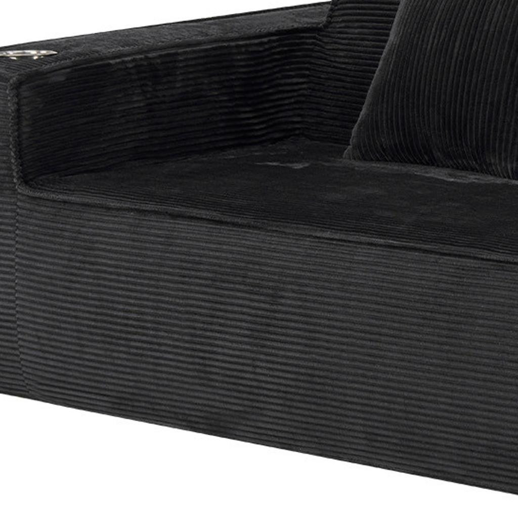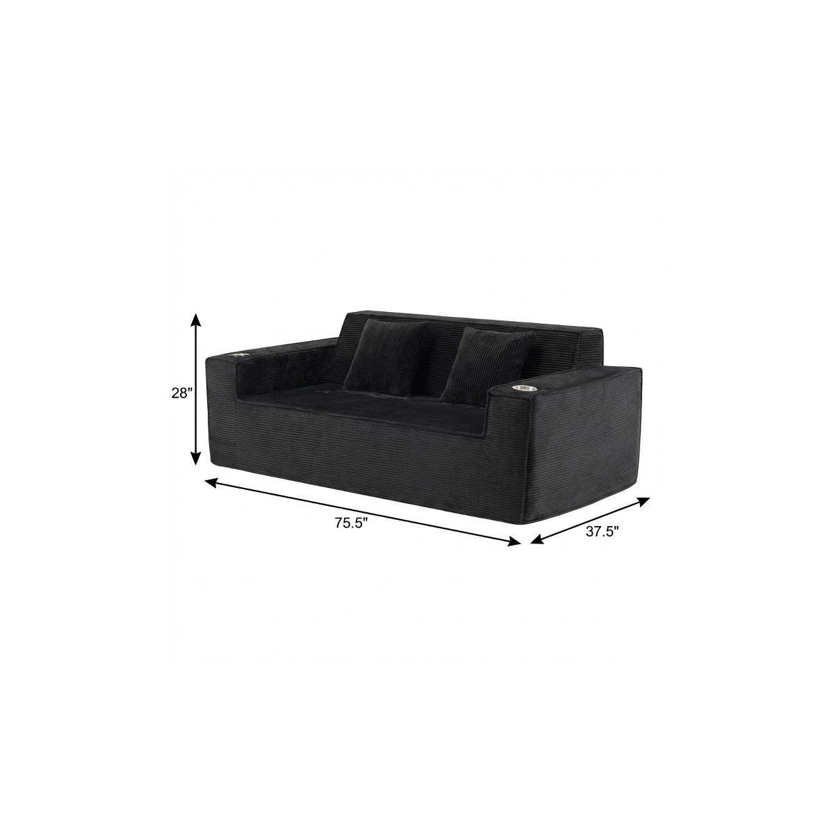 Designed for comfort and good looks, this 76-inch black corduroy sofa with toss pillows is a great option to anchor your space. This solid color standard is fully upholstered with supremely soft and textural plush corduroy that is unique and gives this piece some special flair. Solid colors give you lots of decorative options and are easy to work into your decor scheme. Square arms include cup holders and offer a comfy place to rest. A great showpiece for your room, this compact sofa is a must have for small spaces in your living room, office, bedroom, or lounge. 28.00-inch h x 75.50-inch w x 37.50-inch d.