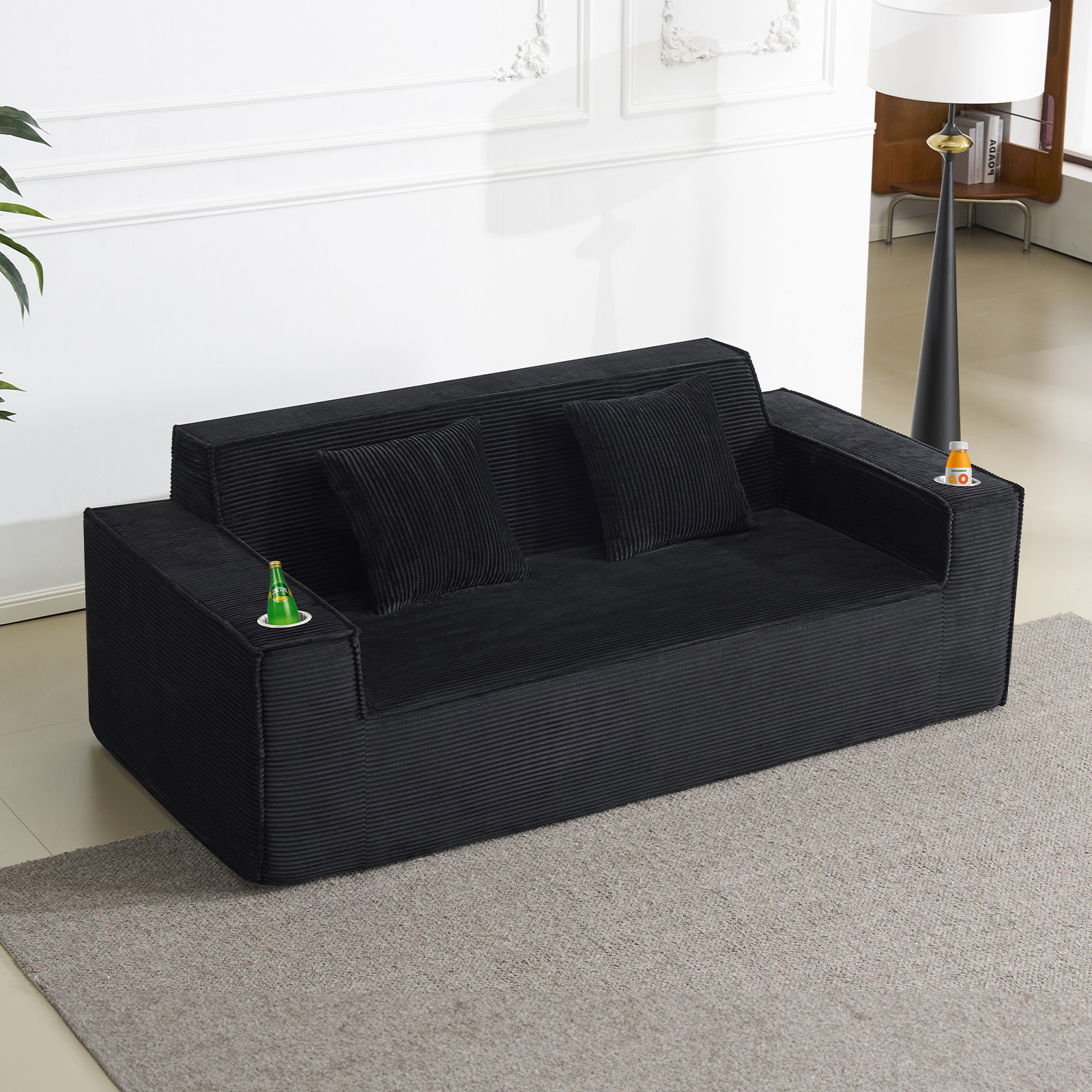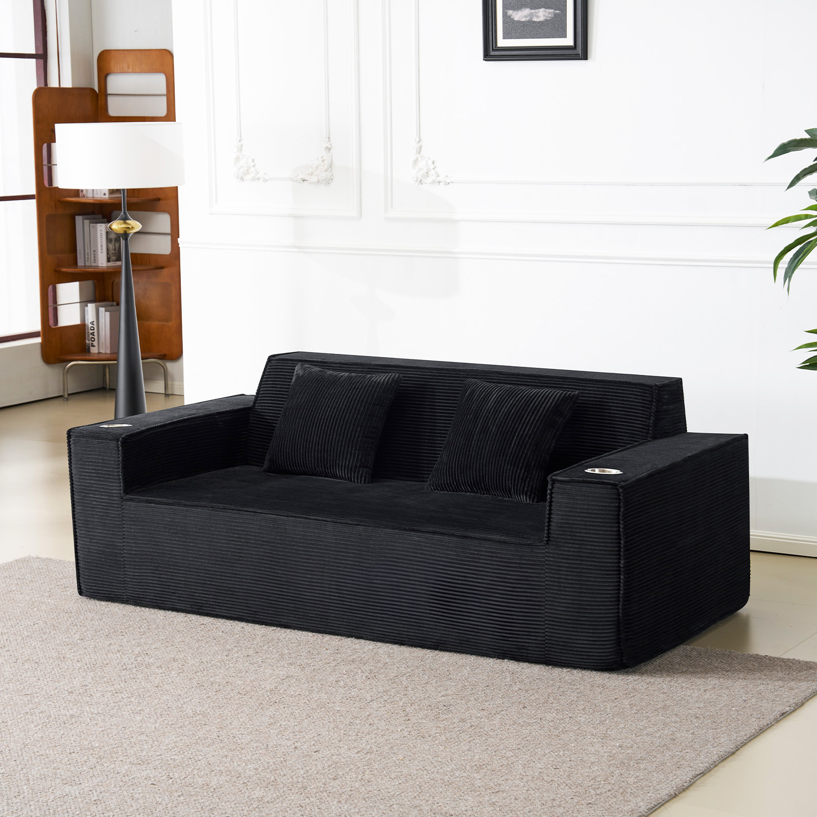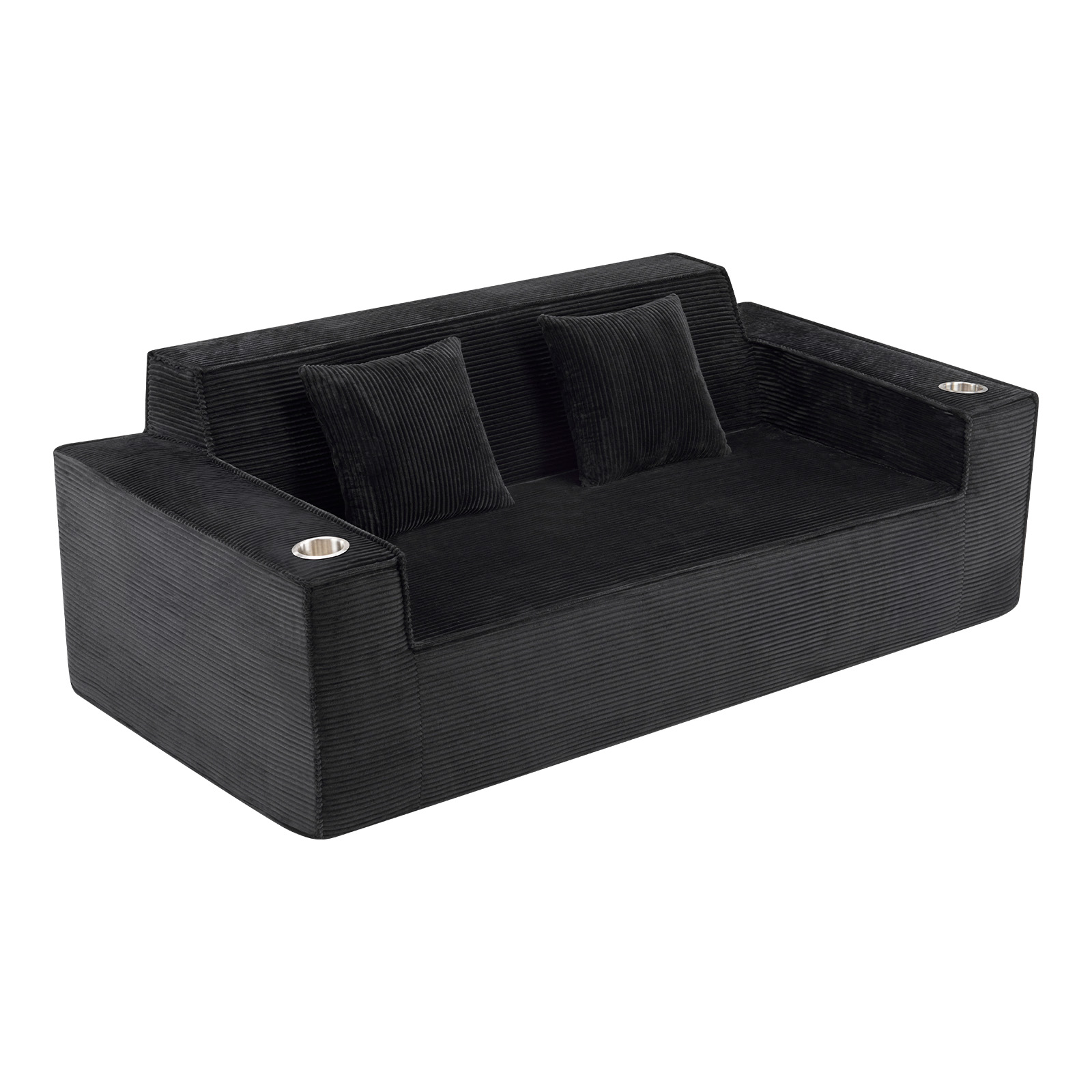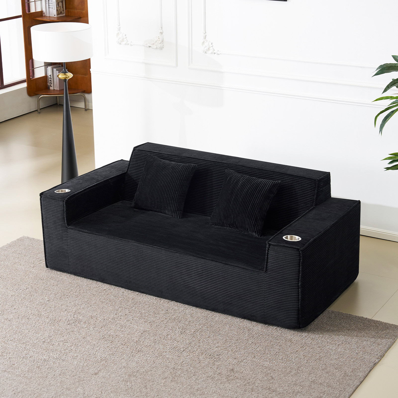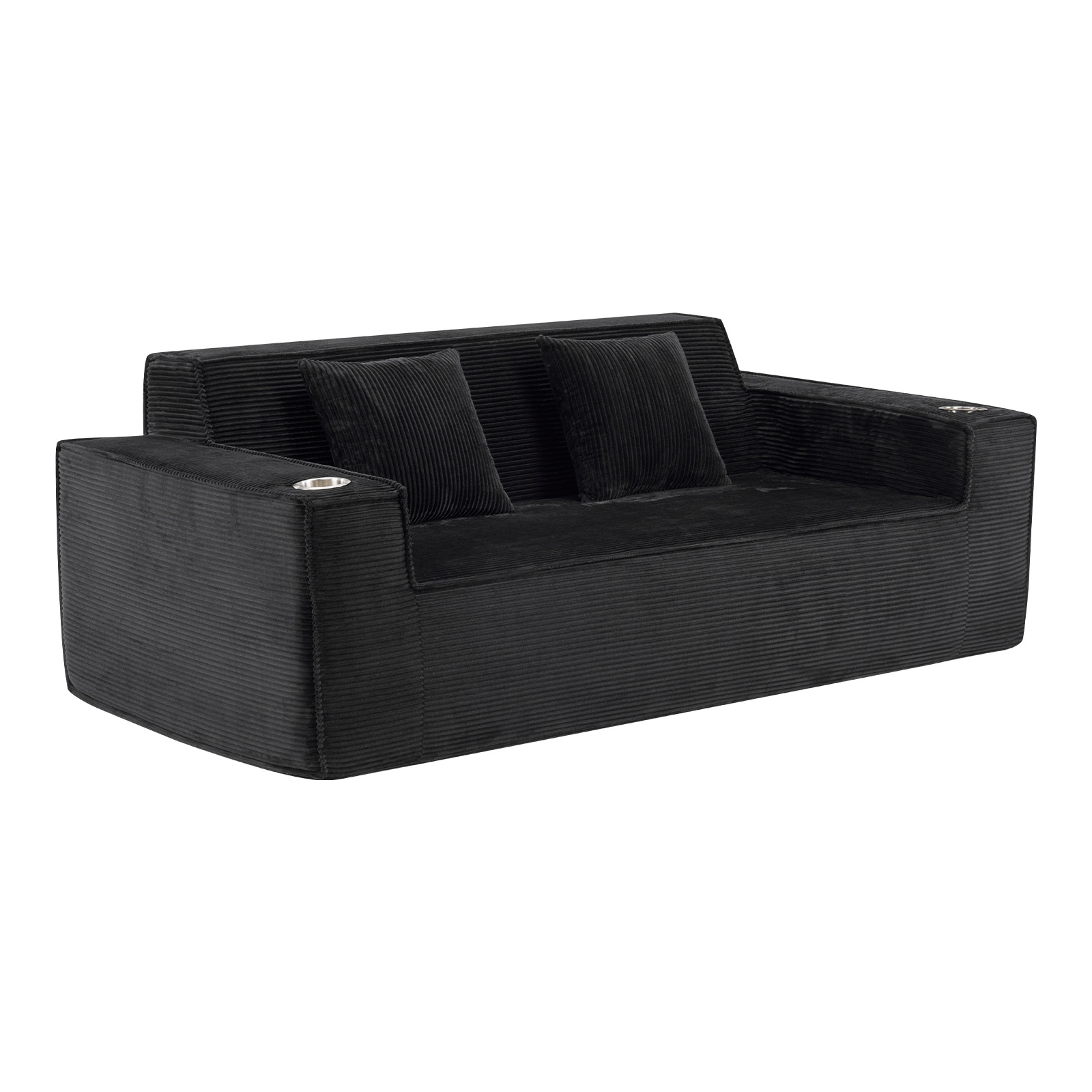 Designed for comfort and good looks, this 76-inch black corduroy sofa with toss pillows is a great option to anchor your space. This solid color standard is fully upholstered with supremely soft and textural plush corduroy that is unique and gives this piece some special flair. Solid colors give you lots of decorative options and are easy to work into your decor scheme. Square arms include cup holders and offer a comfy place to rest. A great showpiece for your room, this compact sofa is a must have for small spaces in your living room, office, bedroom, or lounge. 28.00-inch h x 75.50-inch w x 37.50-inch d.