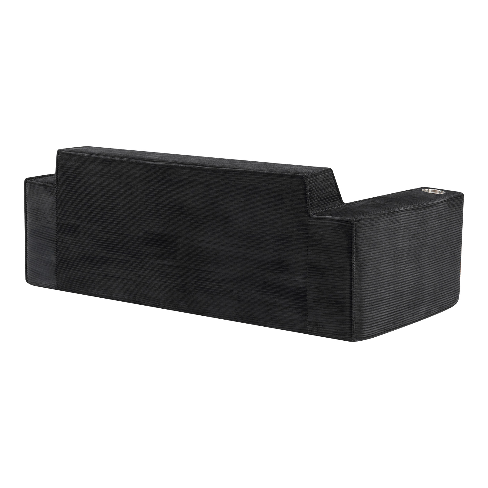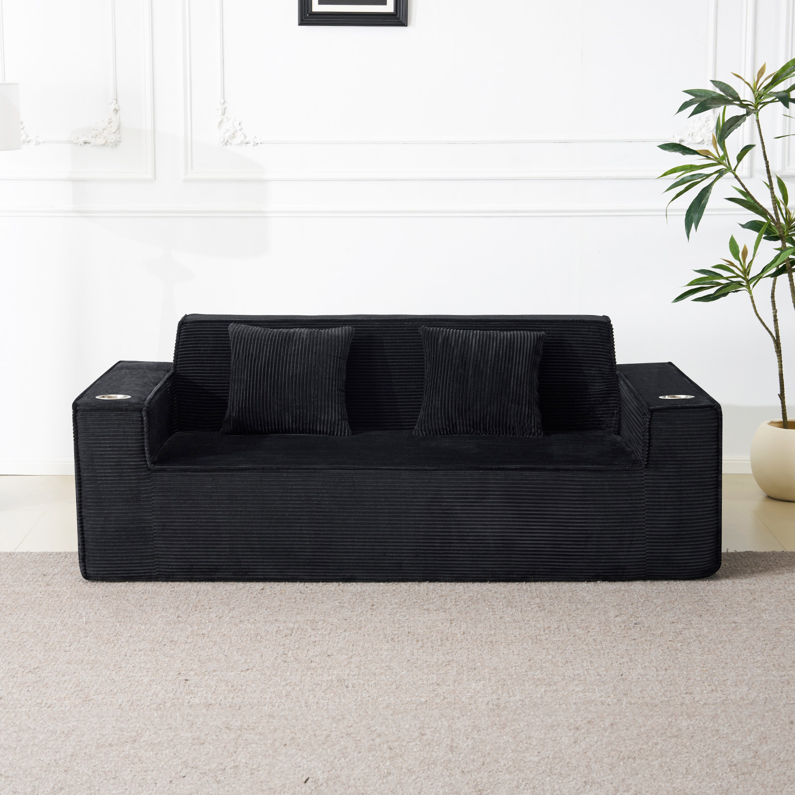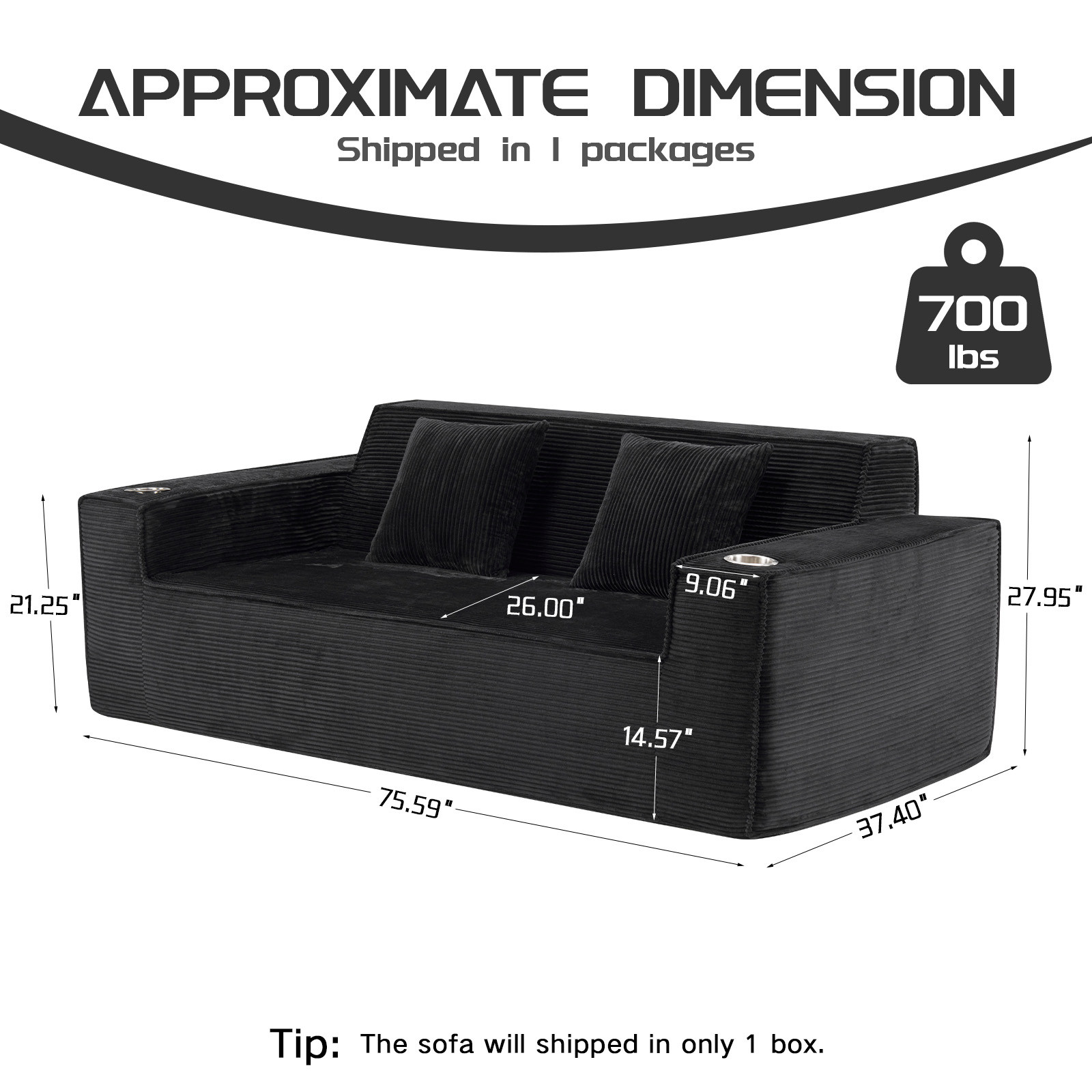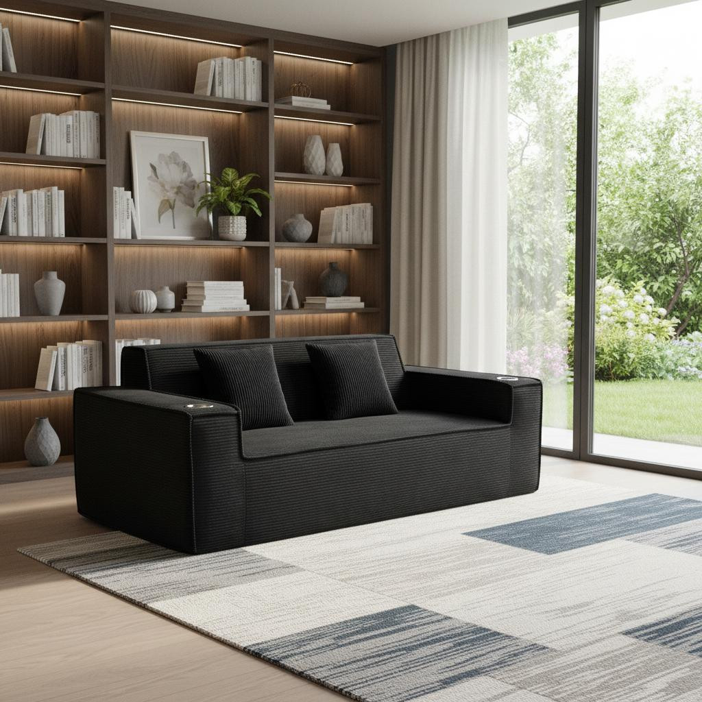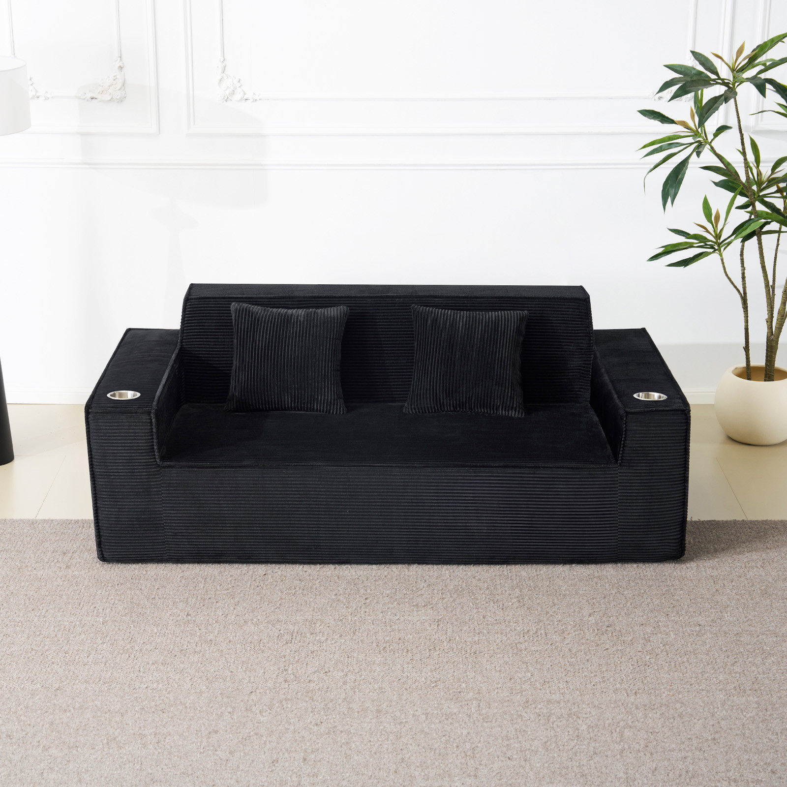 Designed for comfort and good looks, this 76-inch black corduroy sofa with toss pillows is a great option to anchor your space. This solid color standard is fully upholstered with supremely soft and textural plush corduroy that is unique and gives this piece some special flair. Solid colors give you lots of decorative options and are easy to work into your decor scheme. Square arms include cup holders and offer a comfy place to rest. A great showpiece for your room, this compact sofa is a must have for small spaces in your living room, office, bedroom, or lounge. 28.00-inch h x 75.50-inch w x 37.50-inch d.