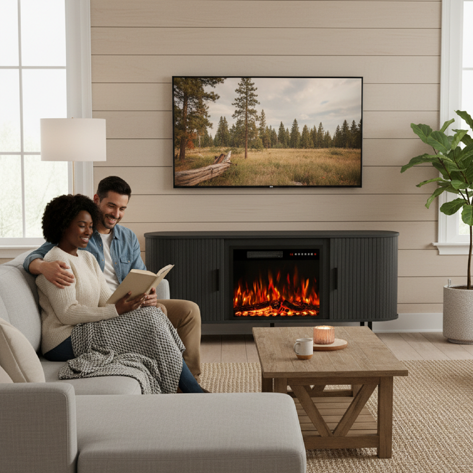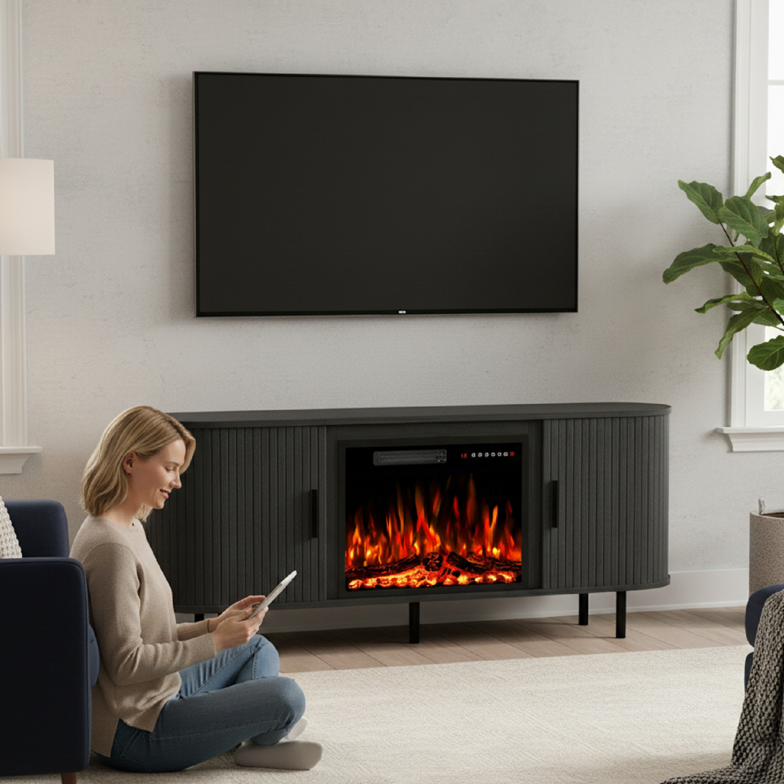 Ready to be enjoyed in your living room, family room, or recreation room, this 65-inch black wood fireplace entertainment center with fireplace is a practical and good looking piece of furniture that will help to anchor your room. Designed to be sturdy and long lasting, this versatile furniture piece is crafted from durable manufactured wood and features a modern design style. Create a fabulous and comfortable media experience as you watch tv on this stand that is also a warm and cozy electric fireplace. Convert your room into a special place with your favorite collectibles and tv accessories that is suitable for living room, bedroom, or office. 27.04-inch h x 65.00-inch w x 15.74-inch d.