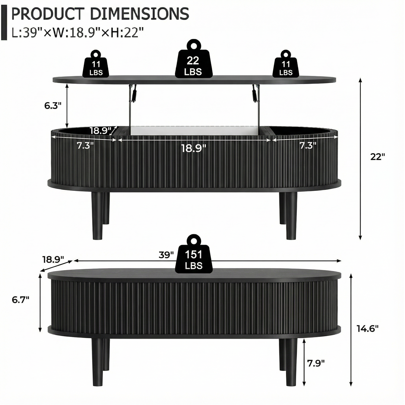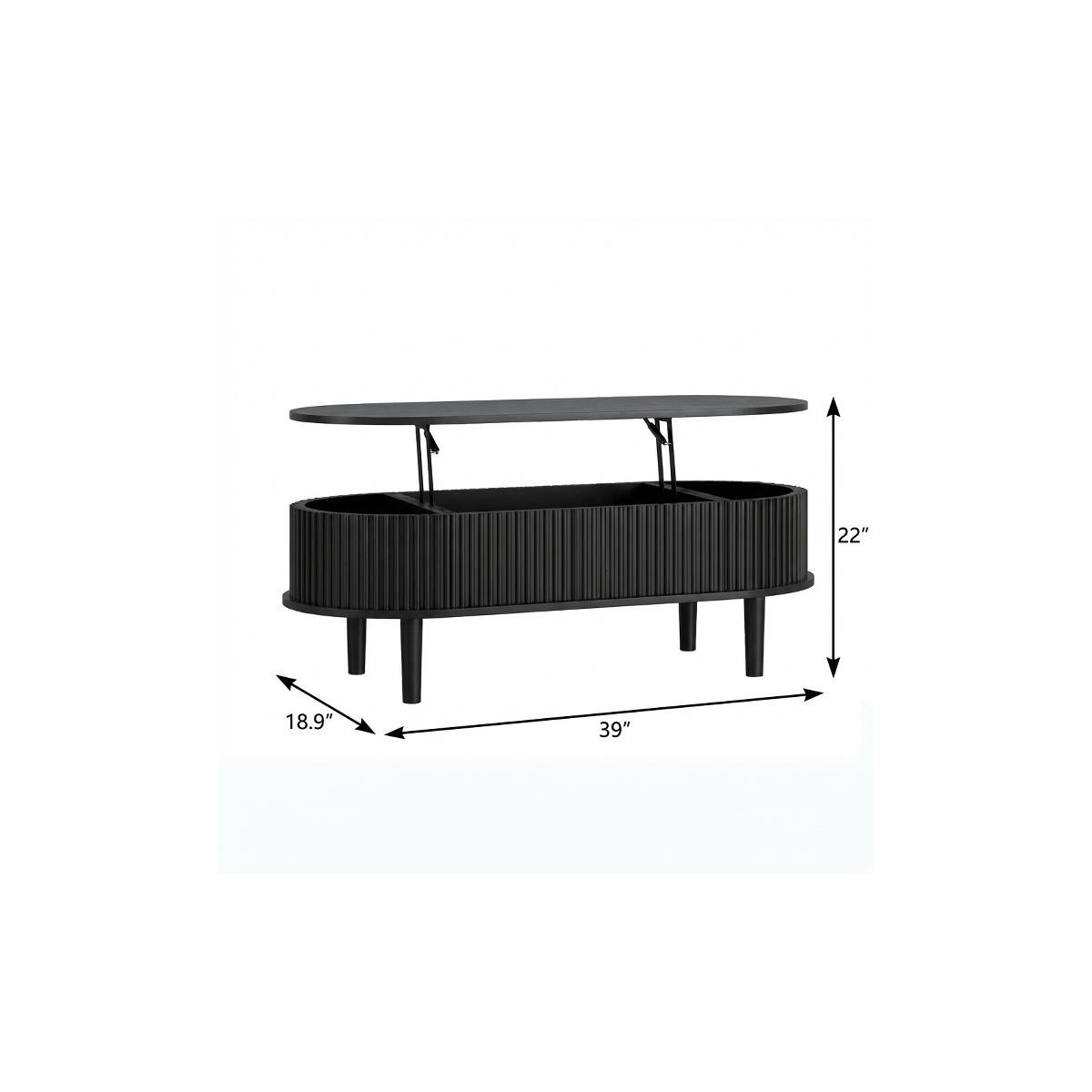 Give your living room, family room, or office the perfect anchor piece with this 39-inch black wood oval lift top coffee table. This table features quality construction from manufactured wood and an updated monotone color scheme with black as the main color on both the top and the base. This oval table is an updated take on a classic. If you're looking for something that can fit into a living area, bedroom, or office, this coffee table is for you. 22.00-inch h x 39.00-inch w x 18.90-inch d.