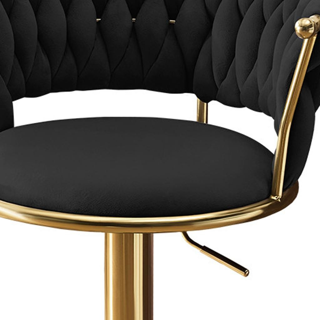 With this set of two black and gold velvet and metal low back adjustable height swivel bar chairs you can add design and extra seating to your space. The gold coloration of the high quality metal base marries nicely with the black velvet seat to create a striking color combination. The round shape of the seat combines with a curved, woven tufted low back and swivel function to give these chairs a comfortable and fashionable look. 38.50-inch h x 20.00-inch w x 18.50-inch d.