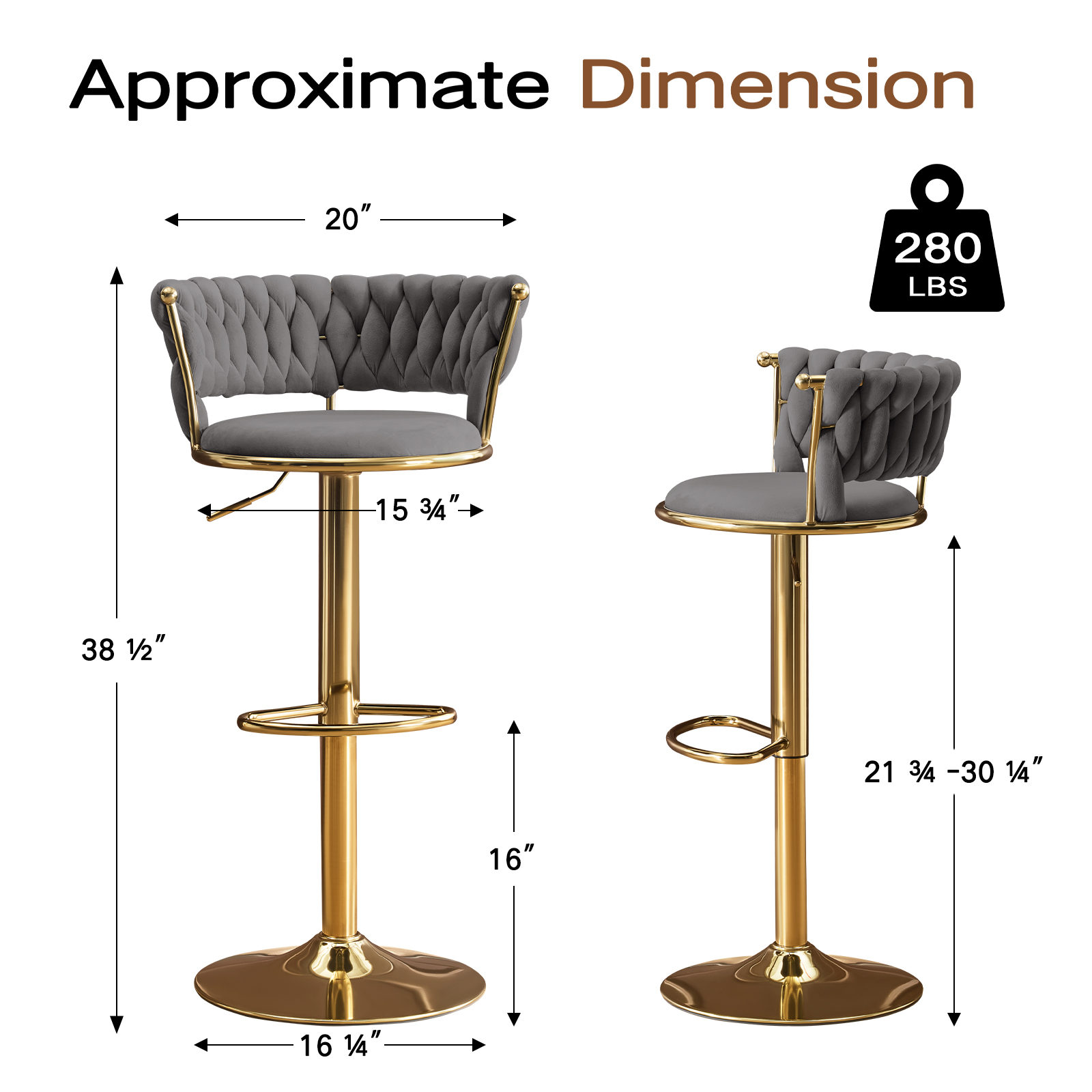 With this set of two gray and gold velvet and metal low back adjustable height swivel bar chairs you can add design and extra seating to your space. The gold coloration of the high quality metal base marries nicely with the gray velvet seat. The round shape of the seat combines with a low back to give this chair a comfortable and fashionable look. 38.50-inch h x 20.00-inch w x 18.50-inch d.