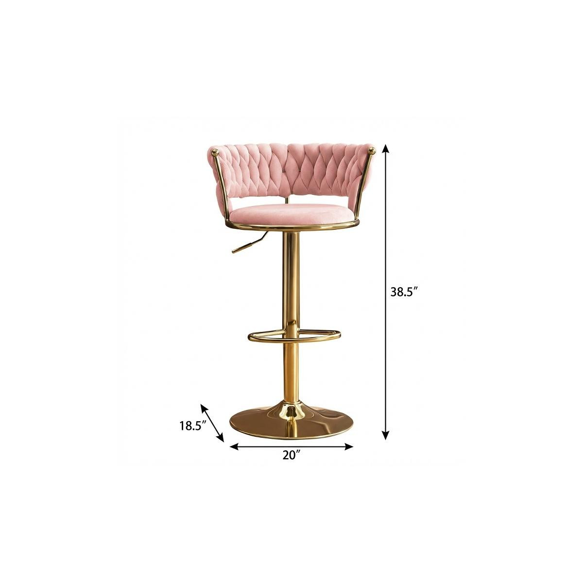 Comfortable enough to sit in for awhile, this set of two pink and gold velvet and metal low back adjustable height swivel bar chairs will transcend the look of your room. Featuring a round seat design, these chairs are upholstered in luxurious velvet for an inviting touch. The modern style is enhanced by a gold metal frame, providing both elegance and stability while offering adjustable height for versatile seating options. 38.50-inch h x 20.00-inch w x 18.50-inch d.