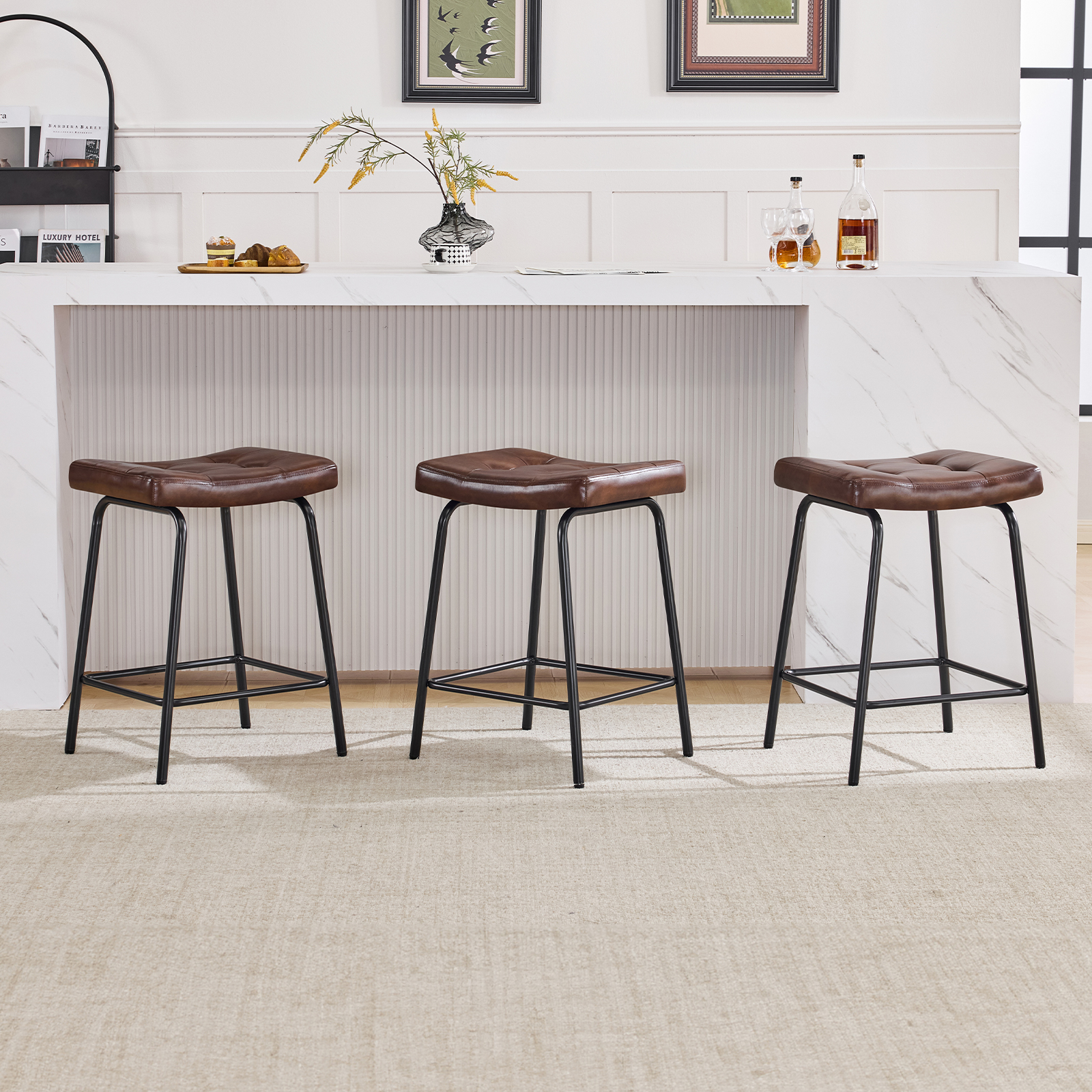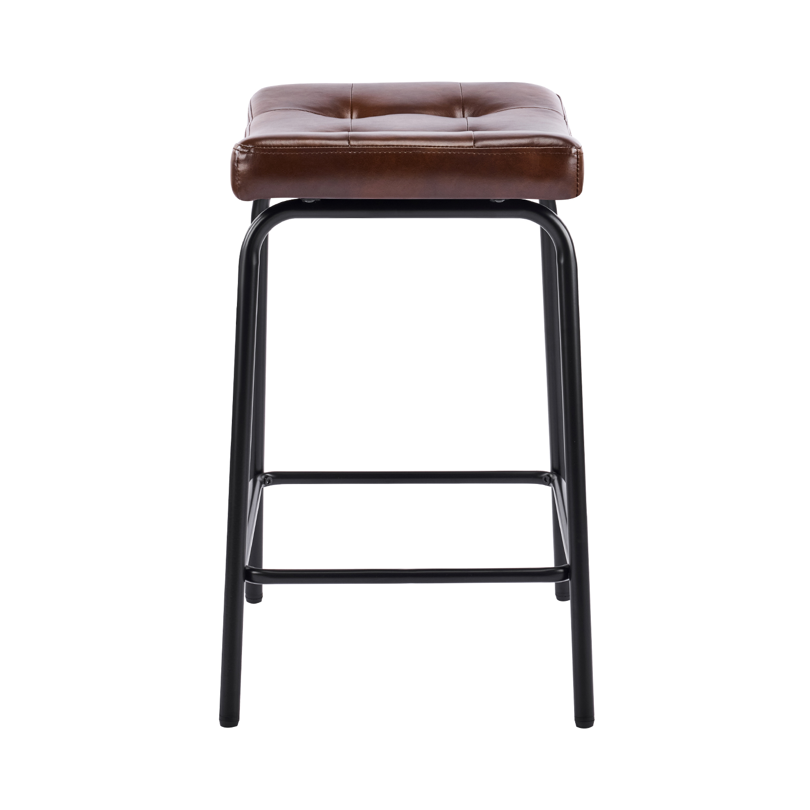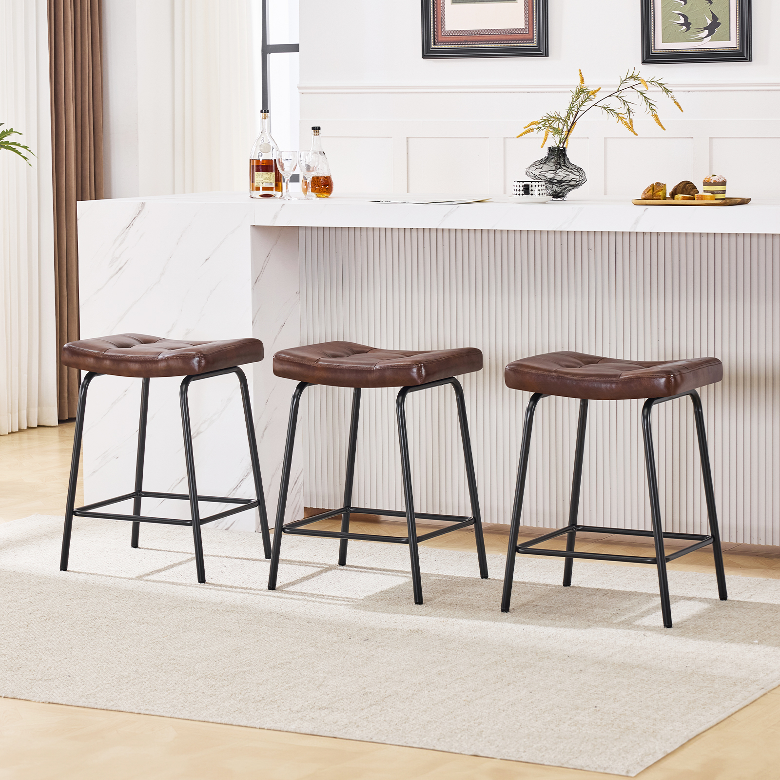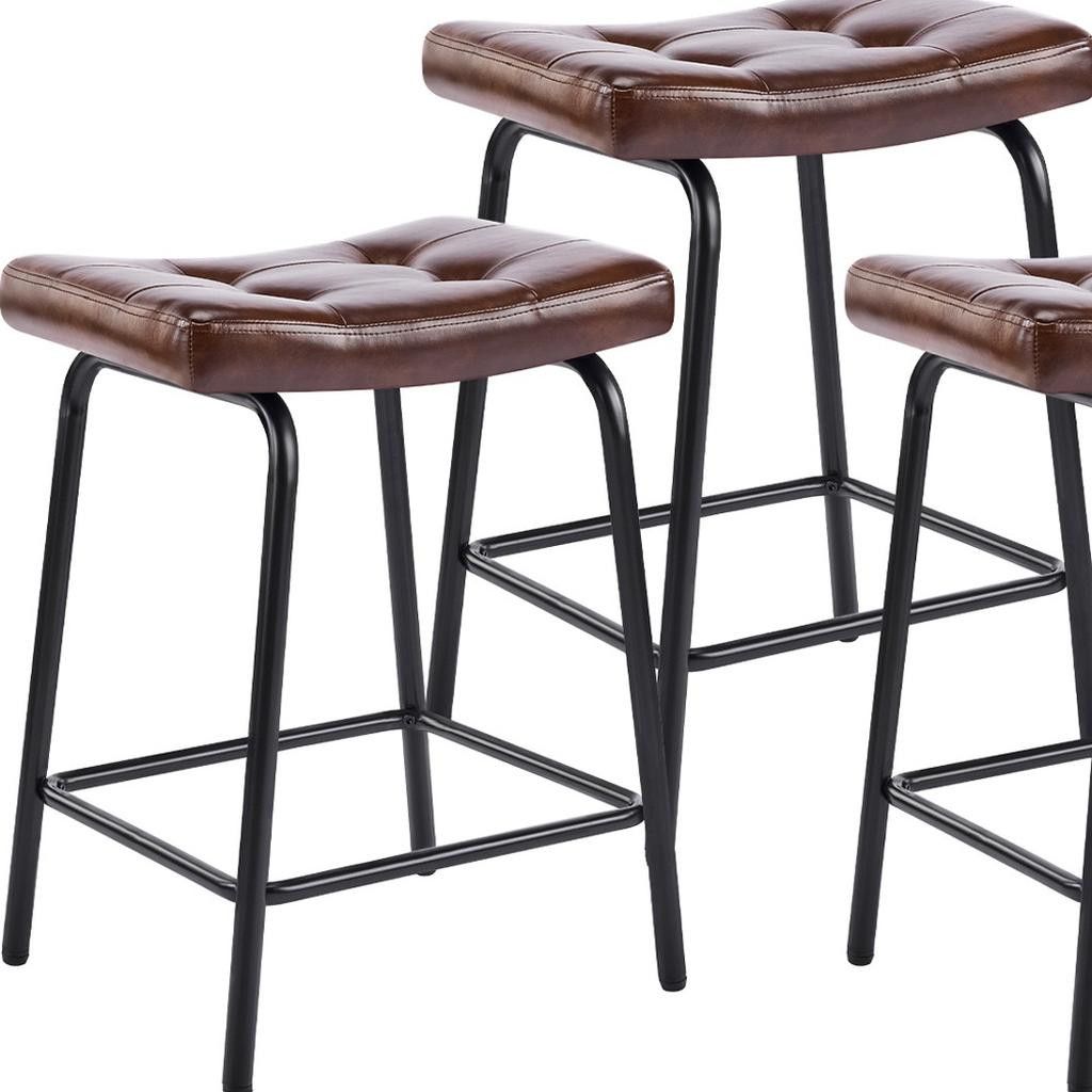 This set of three 23-inch brown and black faux leather and metal counter height bar chairs will be the perfect way to add some cool design and utility to your space similar to what you find in your favorite cafes or pubs. The chairs feature a sleek backless design with saddle seat style that provides comfort for extended use. Upholstered in high-quality button tufted faux leather, they offer a stylish look that complements contemporary decor. The sturdy metal frame ensures durability while enhancing the modern aesthetic of your home or gathering space. 25.50-inch h x 18.50-inch w x 14.50-inch d.