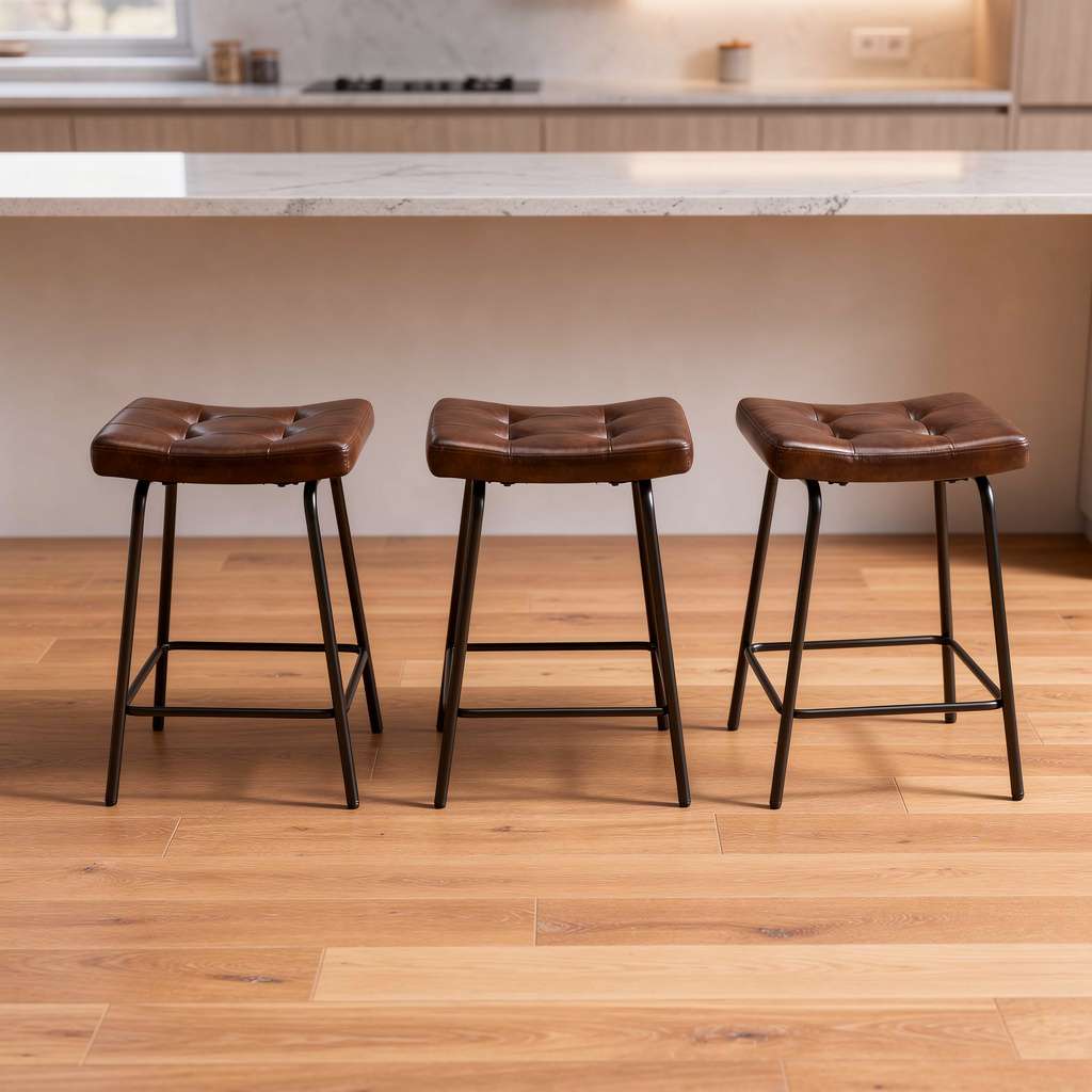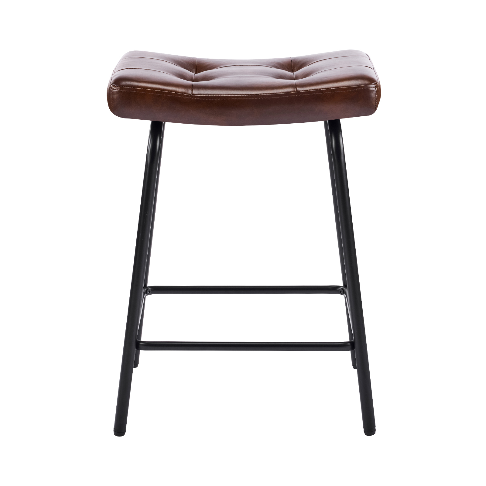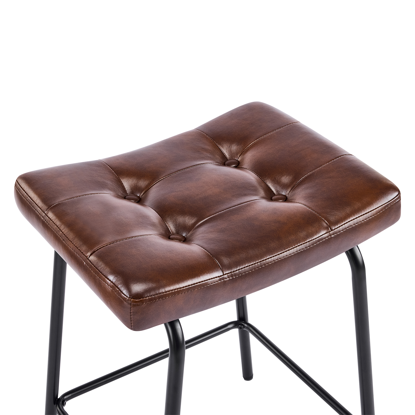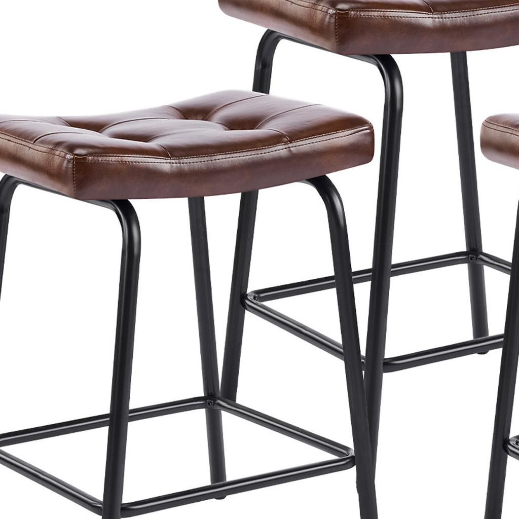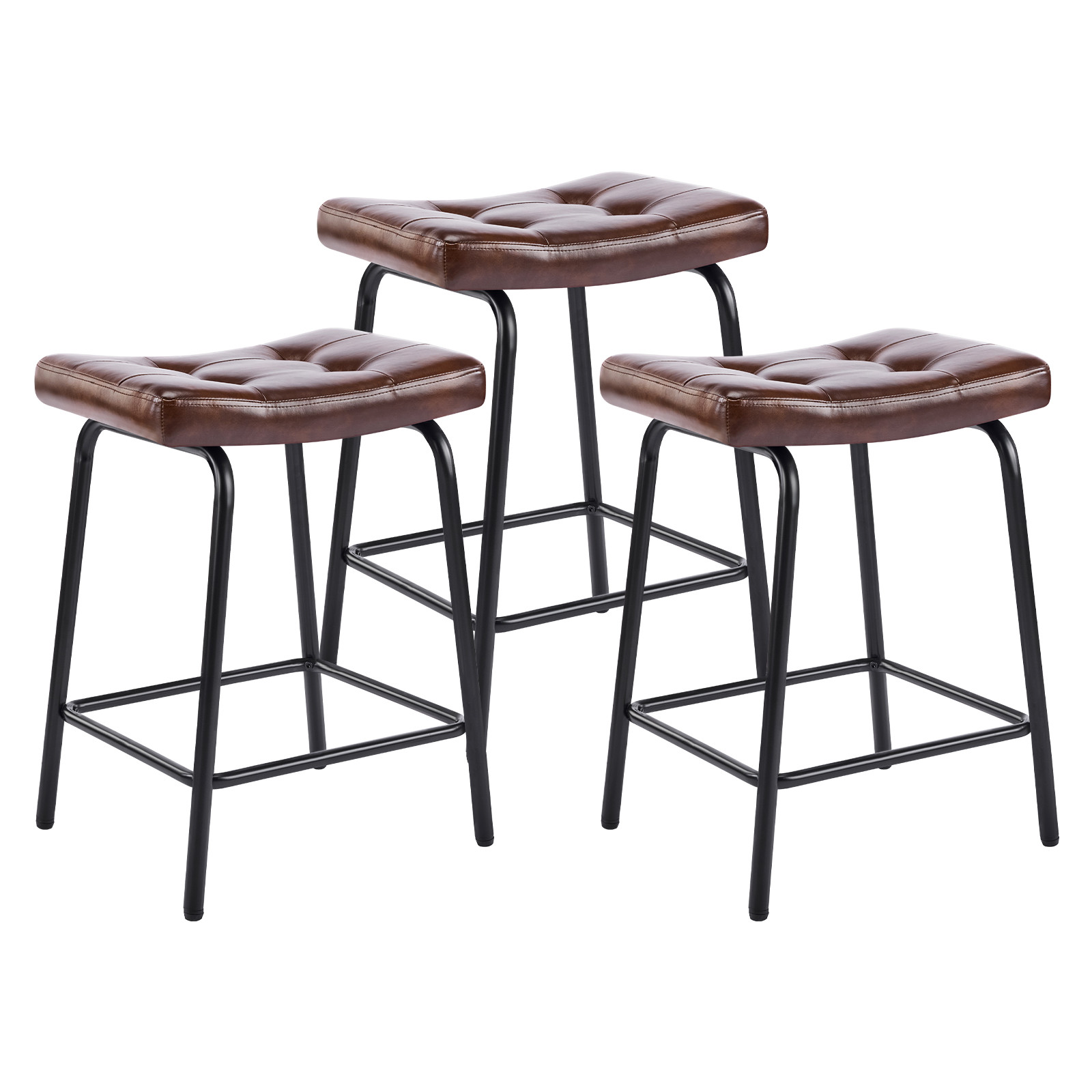 This set of three 23-inch brown and black faux leather and metal counter height bar chairs will be the perfect way to add some cool design and utility to your space similar to what you find in your favorite cafes or pubs. The chairs feature a sleek backless design with saddle seat style that provides comfort for extended use. Upholstered in high-quality button tufted faux leather, they offer a stylish look that complements contemporary decor. The sturdy metal frame ensures durability while enhancing the modern aesthetic of your home or gathering space. 25.50-inch h x 18.50-inch w x 14.50-inch d.