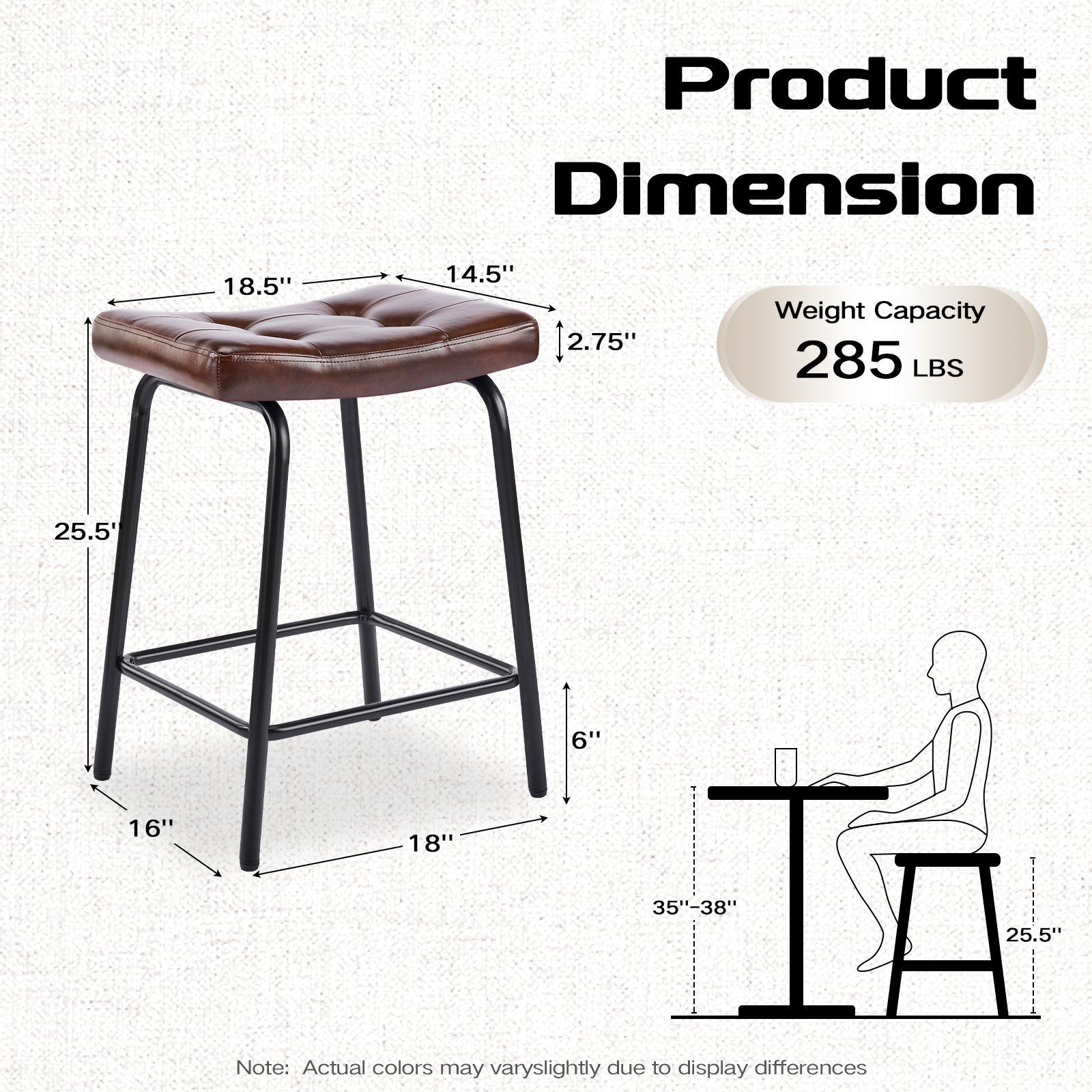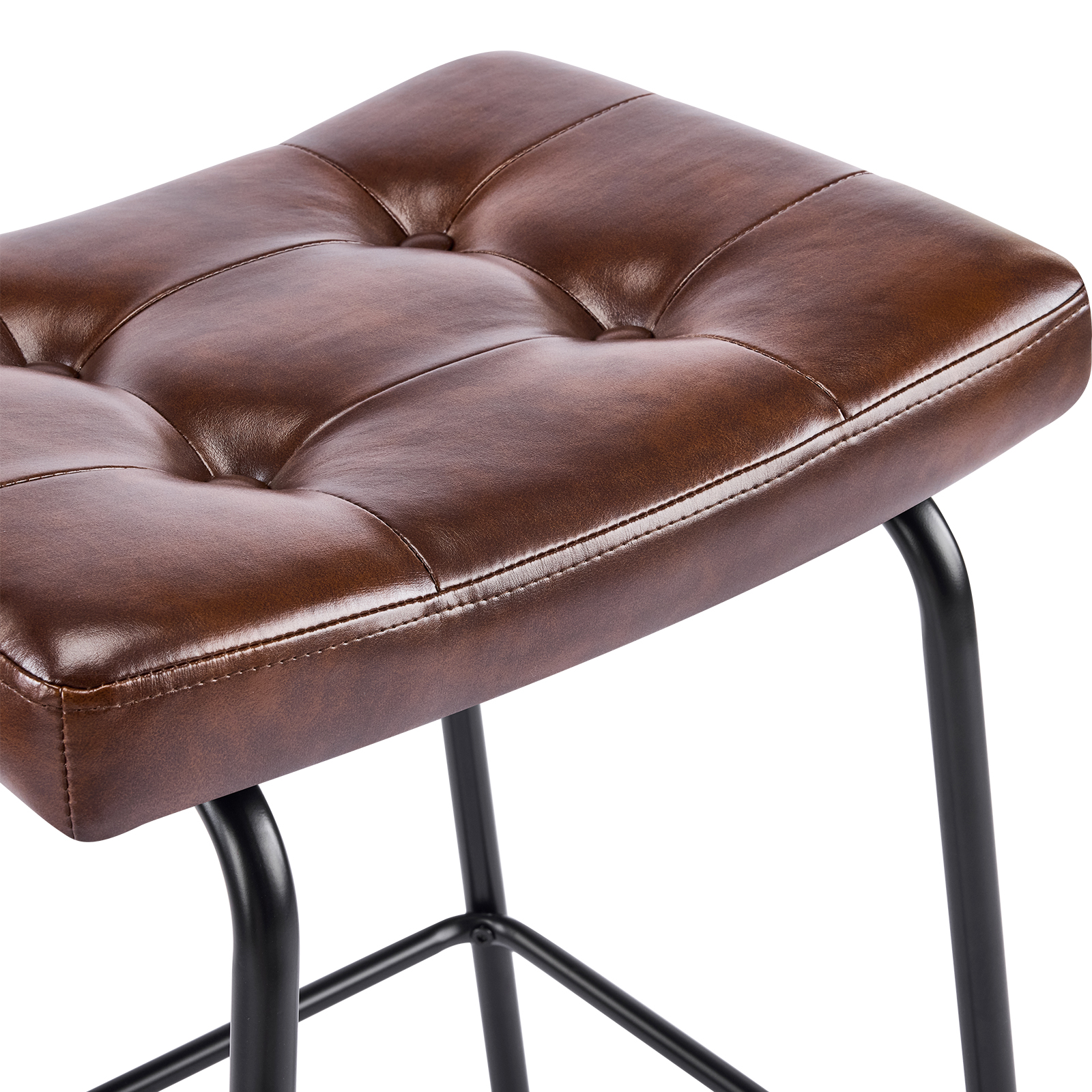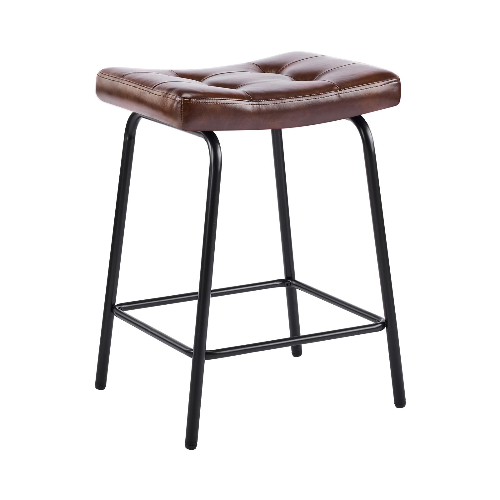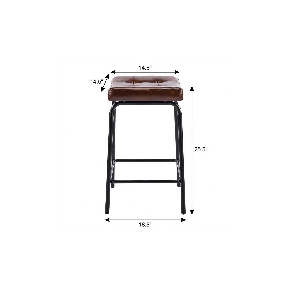 This set of three 23-inch brown and black faux leather and metal counter height bar chairs will be the perfect way to add some cool design and utility to your space similar to what you find in your favorite cafes or pubs. The chairs feature a sleek backless design with saddle seat style that provides comfort for extended use. Upholstered in high-quality button tufted faux leather, they offer a stylish look that complements contemporary decor. The sturdy metal frame ensures durability while enhancing the modern aesthetic of your home or gathering space. 25.50-inch h x 18.50-inch w x 14.50-inch d.