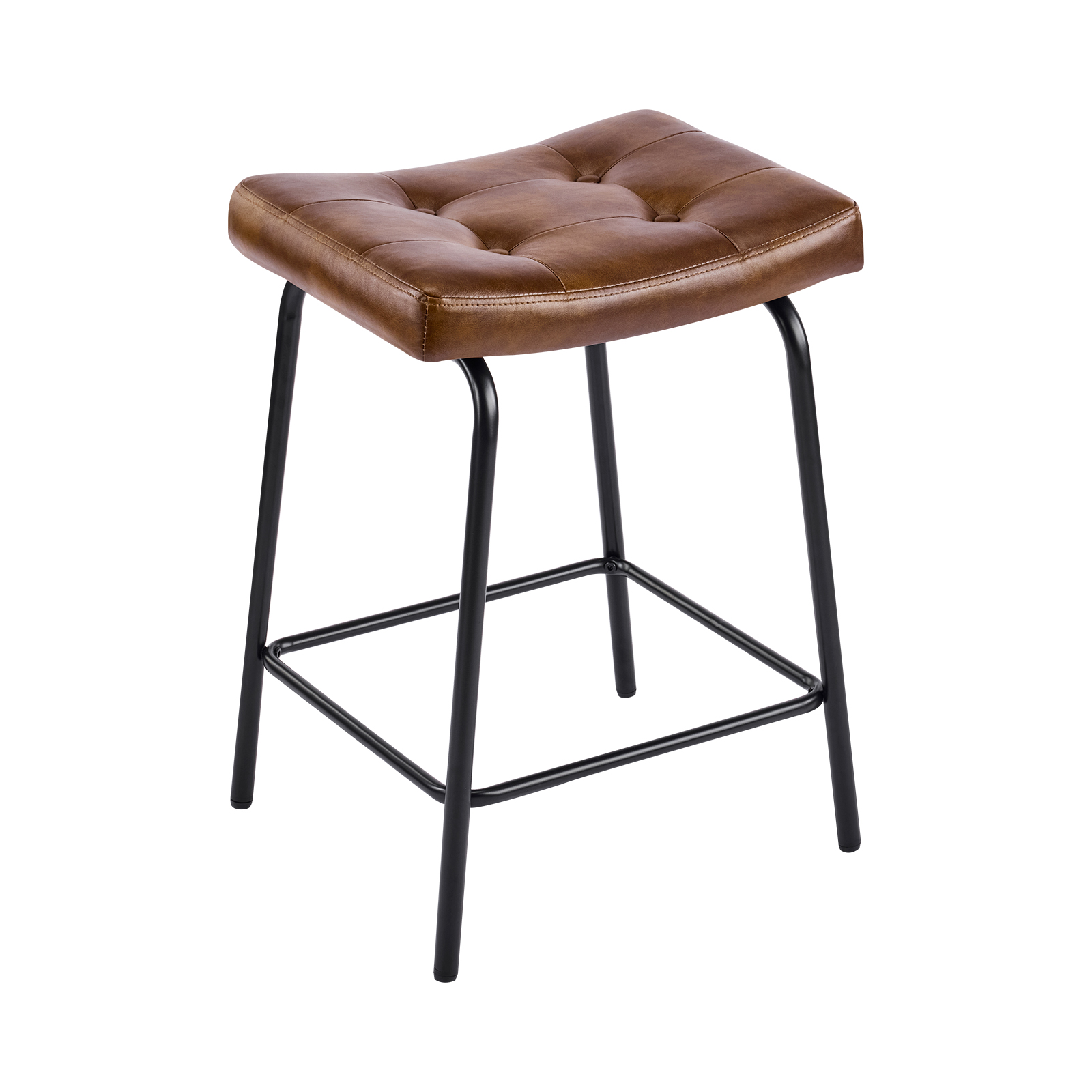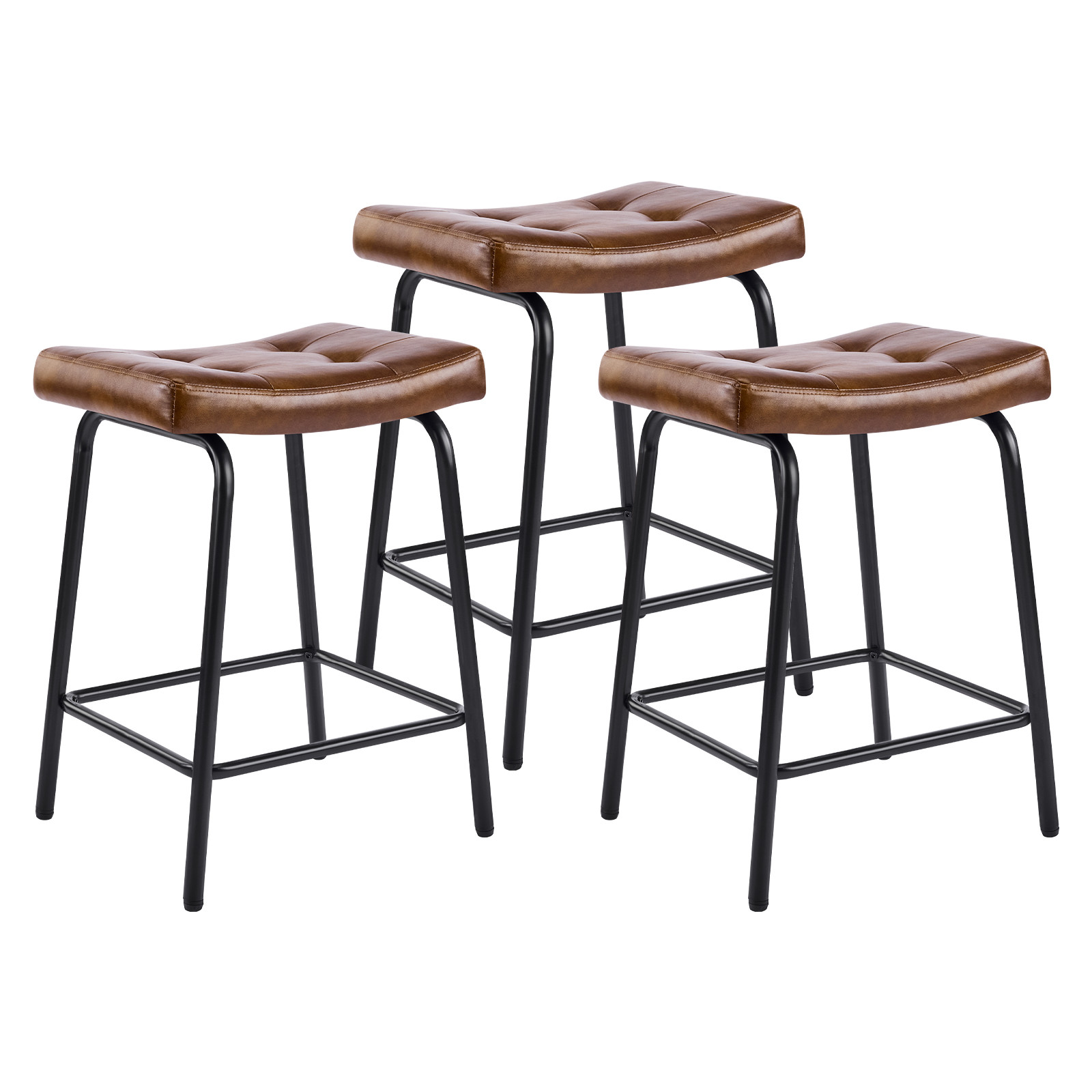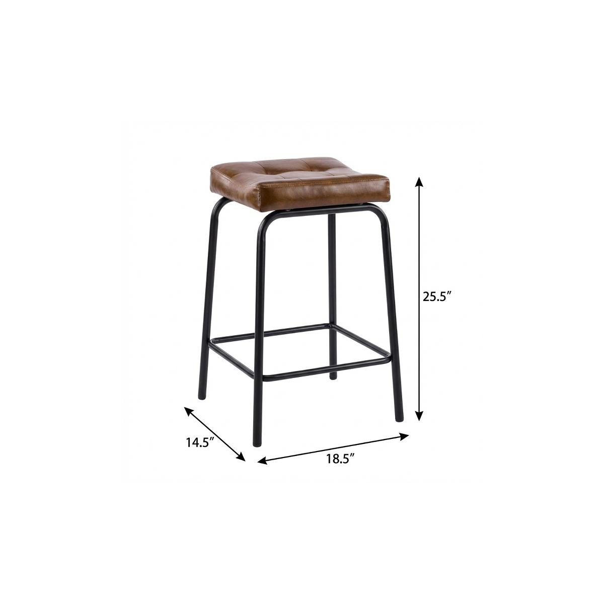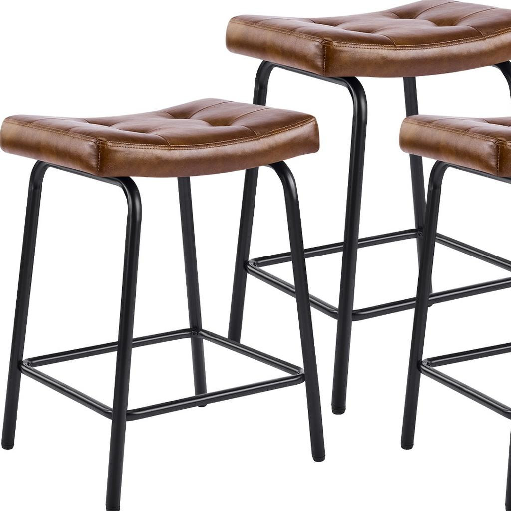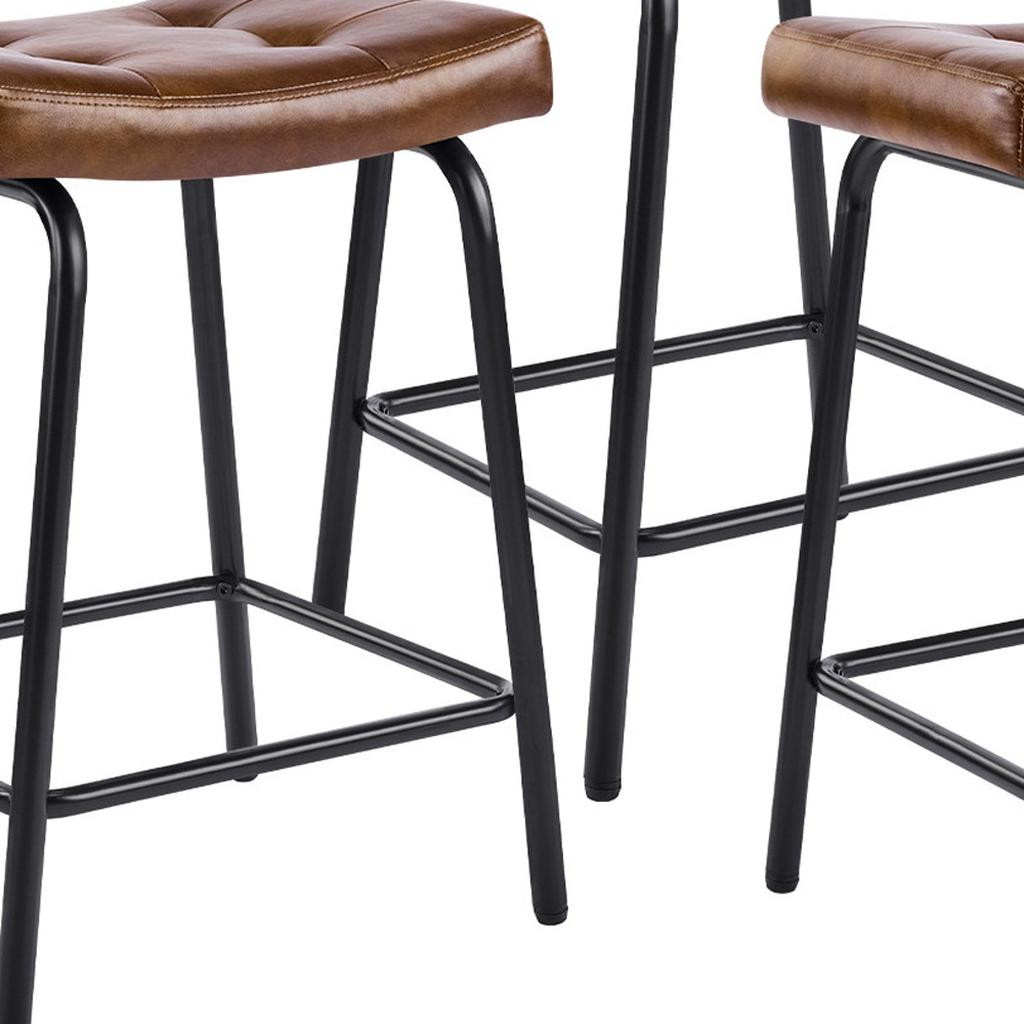 The perfect way to add some extra seating in your home, this set of three 23-inch light brown and black faux leather and metal counter height bar chairs will elevate the look and vibe of your room. A black metal frame is finished off with a warm, light brown button tufted faux leather seat that is the epitome of quality construction and design. Featuring a modern slightly rustic style, these saddle seat bar chairs combine comfort and sophistication effortlessly. Designed for versatility, their counter height makes them suitable for various dining spaces. 25.50-inch h x 18.50-inch w x 14.50-inch d.