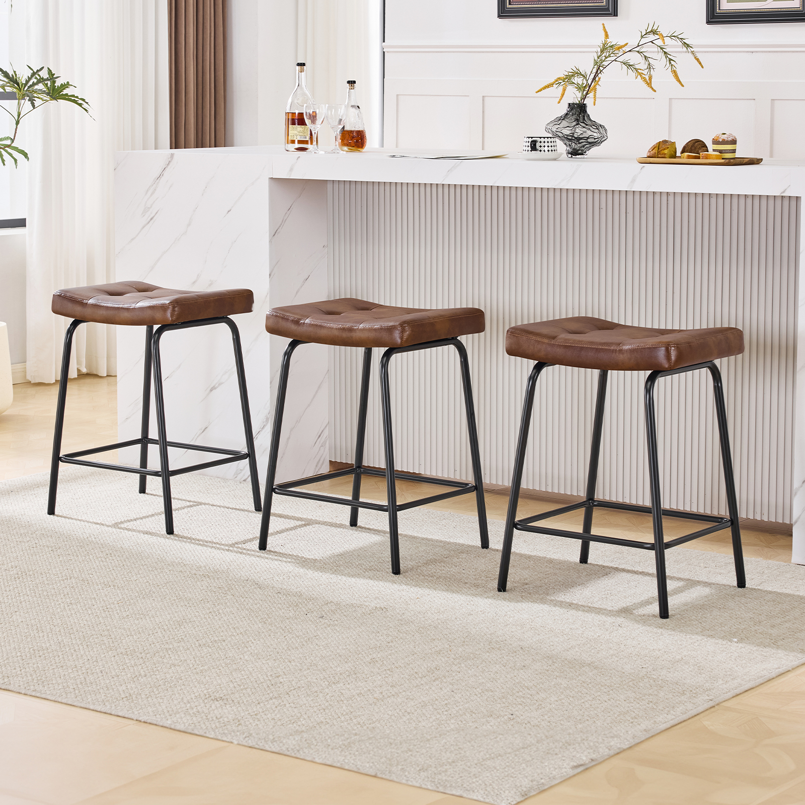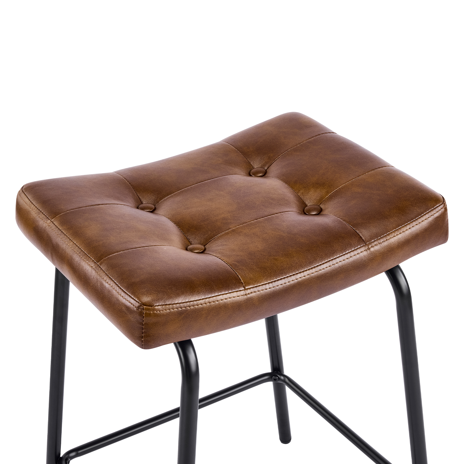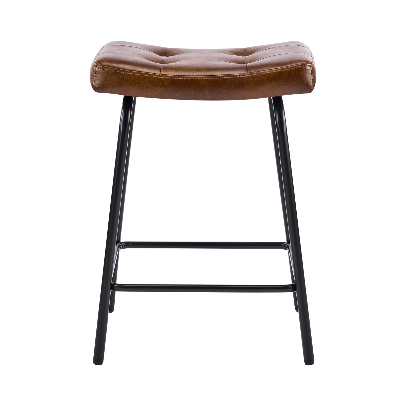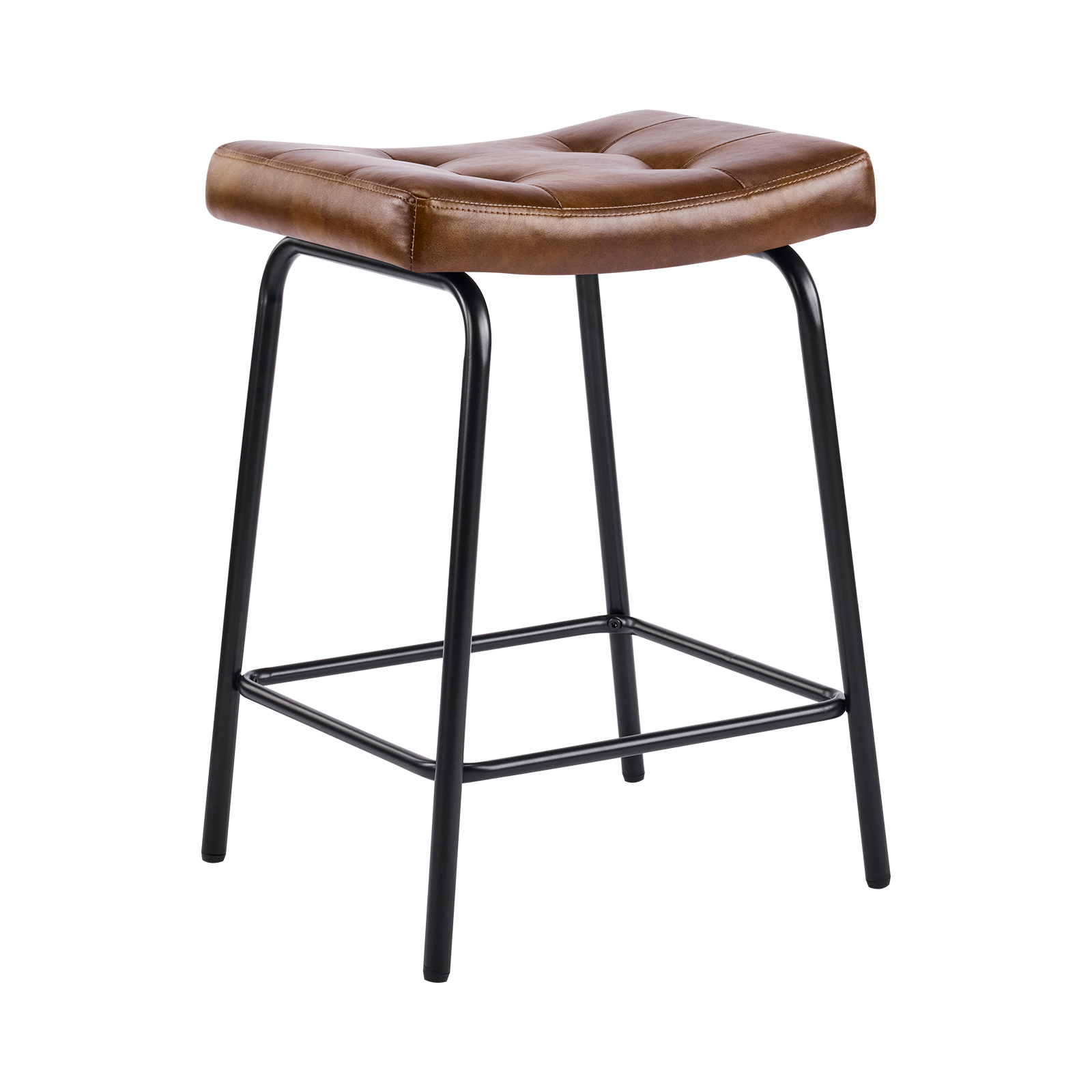 The perfect way to add some extra seating in your home, this set of three 23-inch light brown and black faux leather and metal counter height bar chairs will elevate the look and vibe of your room. A black metal frame is finished off with a warm, light brown button tufted faux leather seat that is the epitome of quality construction and design. Featuring a modern slightly rustic style, these saddle seat bar chairs combine comfort and sophistication effortlessly. Designed for versatility, their counter height makes them suitable for various dining spaces. 25.50-inch h x 18.50-inch w x 14.50-inch d.