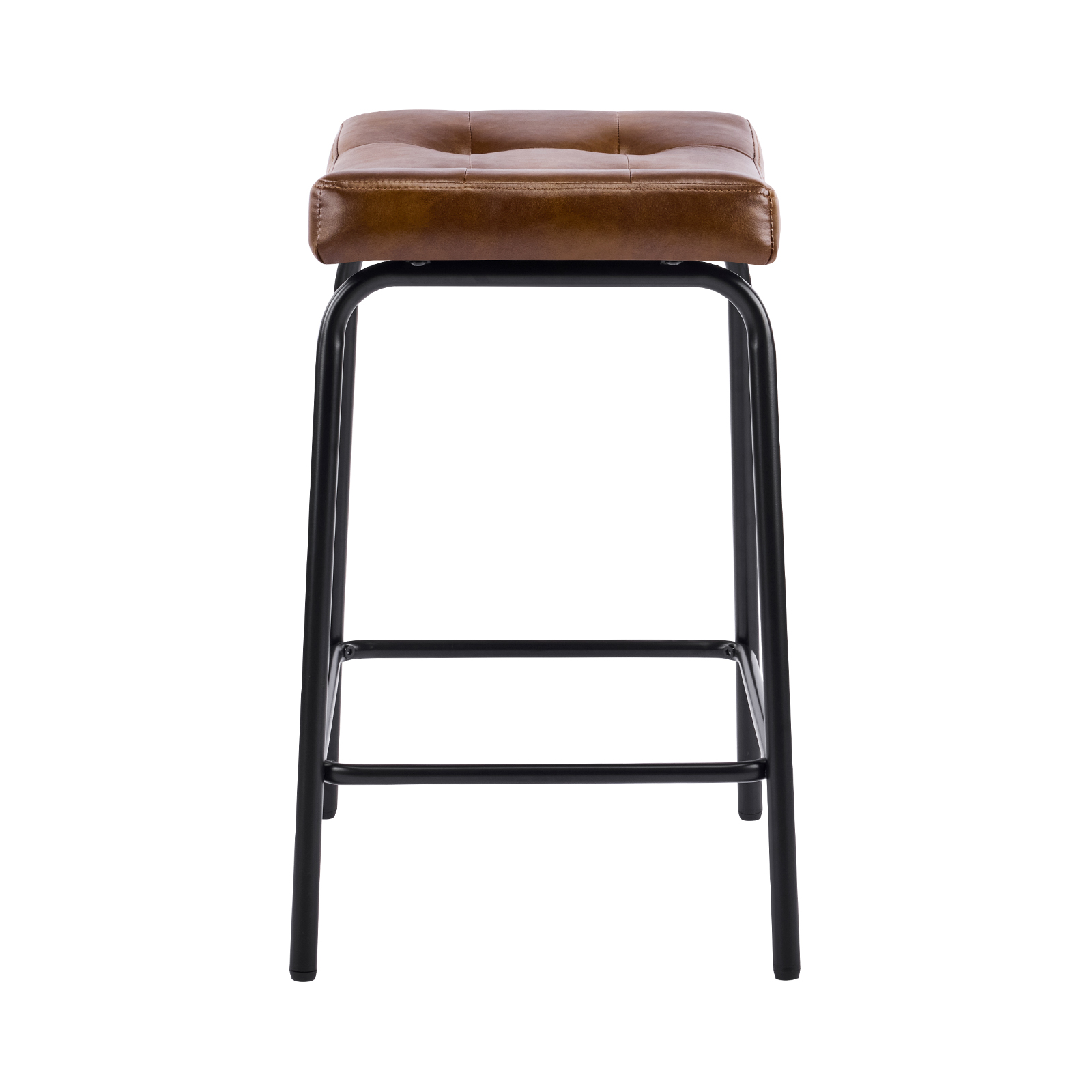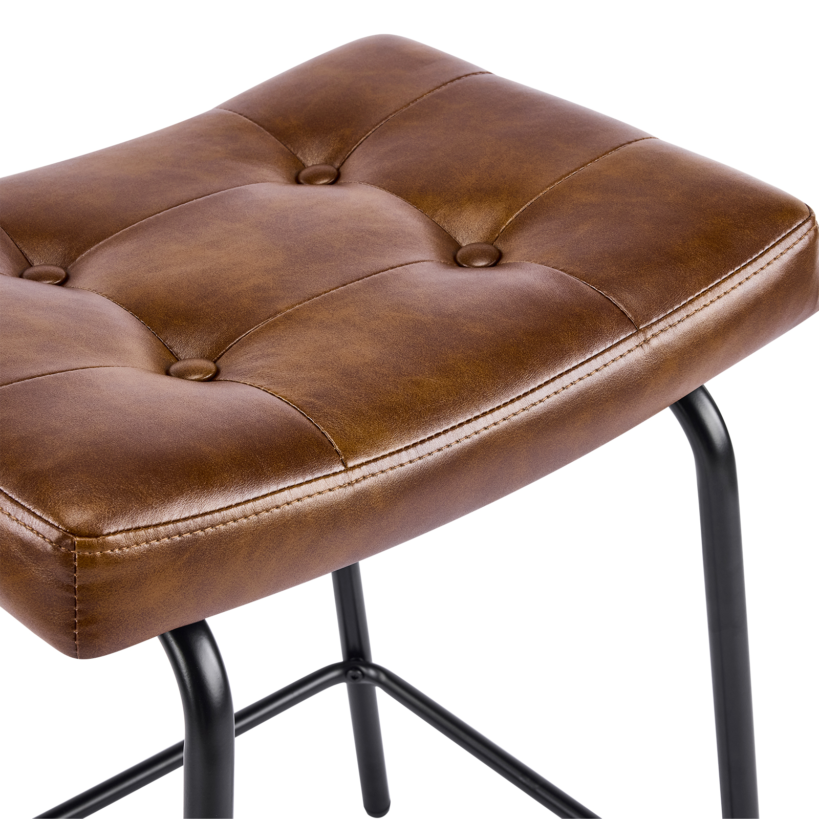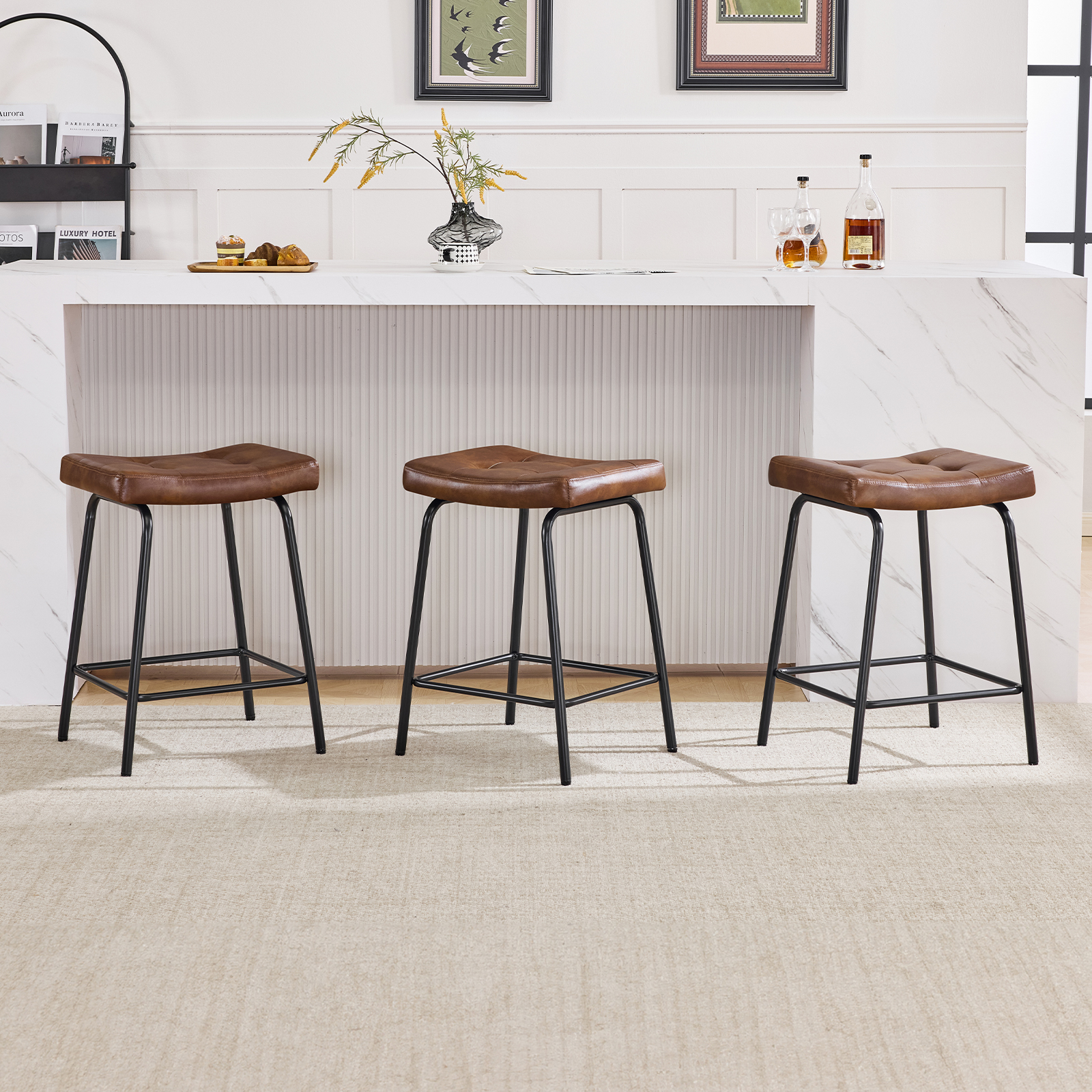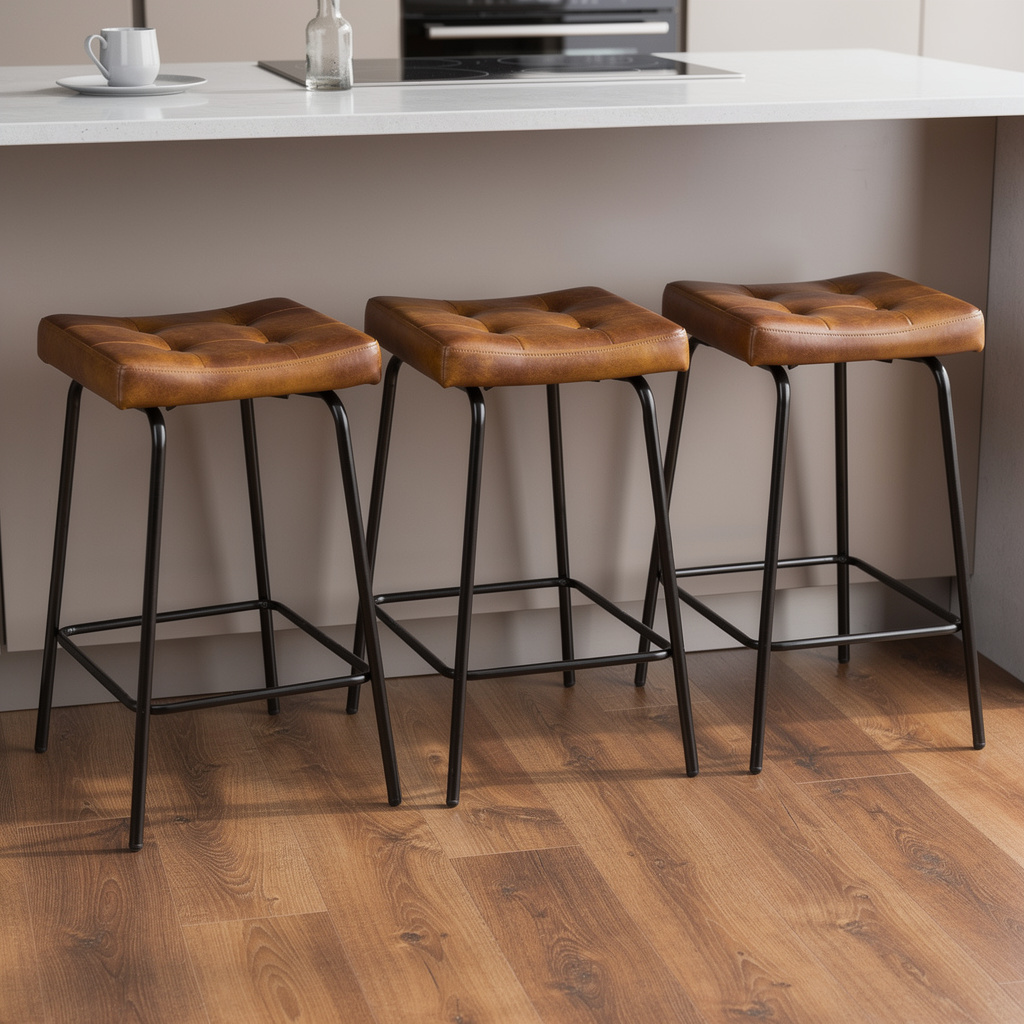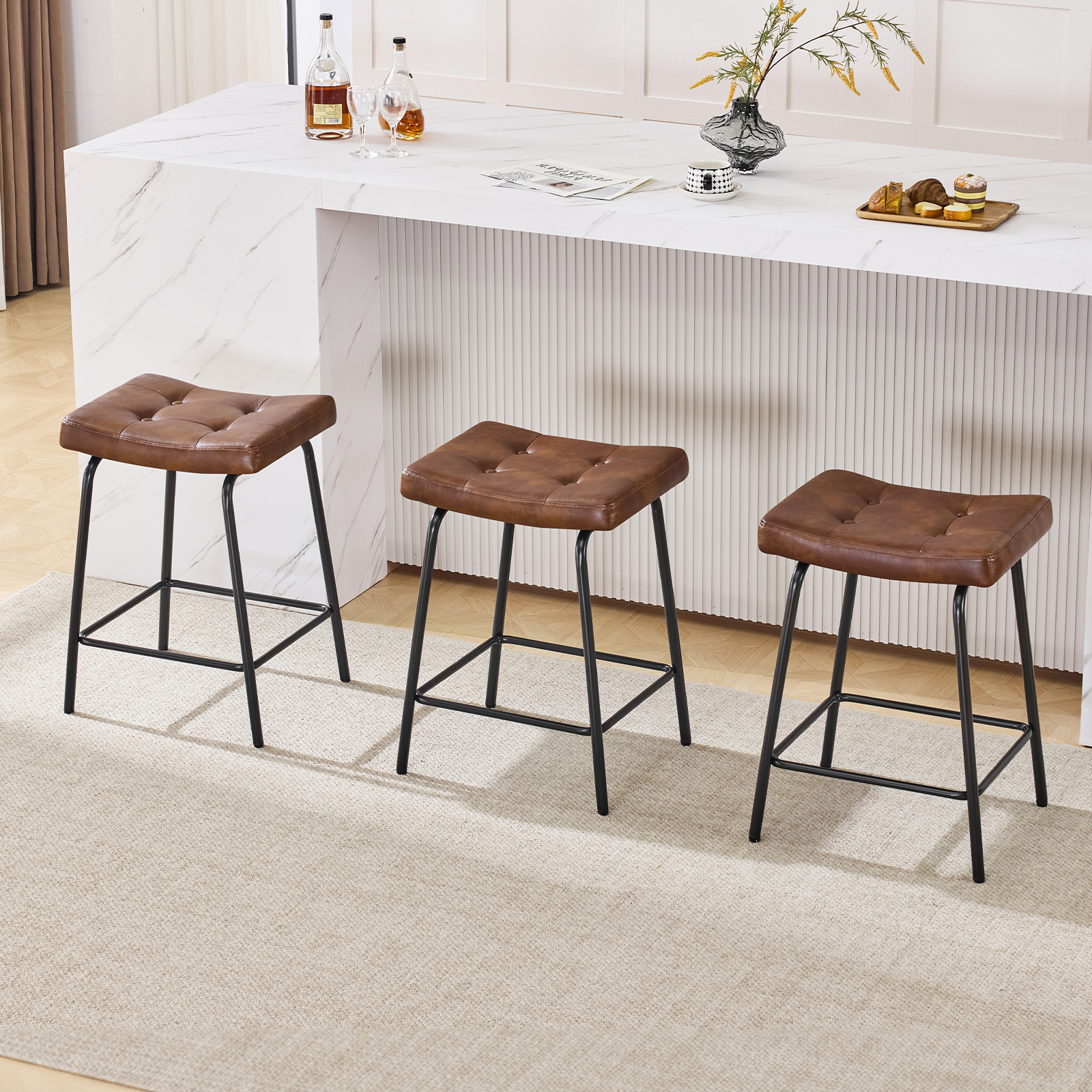 The perfect way to add some extra seating in your home, this set of three 23-inch light brown and black faux leather and metal counter height bar chairs will elevate the look and vibe of your room. A black metal frame is finished off with a warm, light brown button tufted faux leather seat that is the epitome of quality construction and design. Featuring a modern slightly rustic style, these saddle seat bar chairs combine comfort and sophistication effortlessly. Designed for versatility, their counter height makes them suitable for various dining spaces. 25.50-inch h x 18.50-inch w x 14.50-inch d.