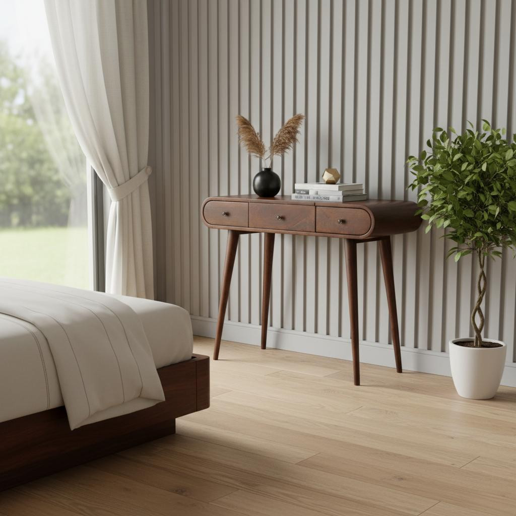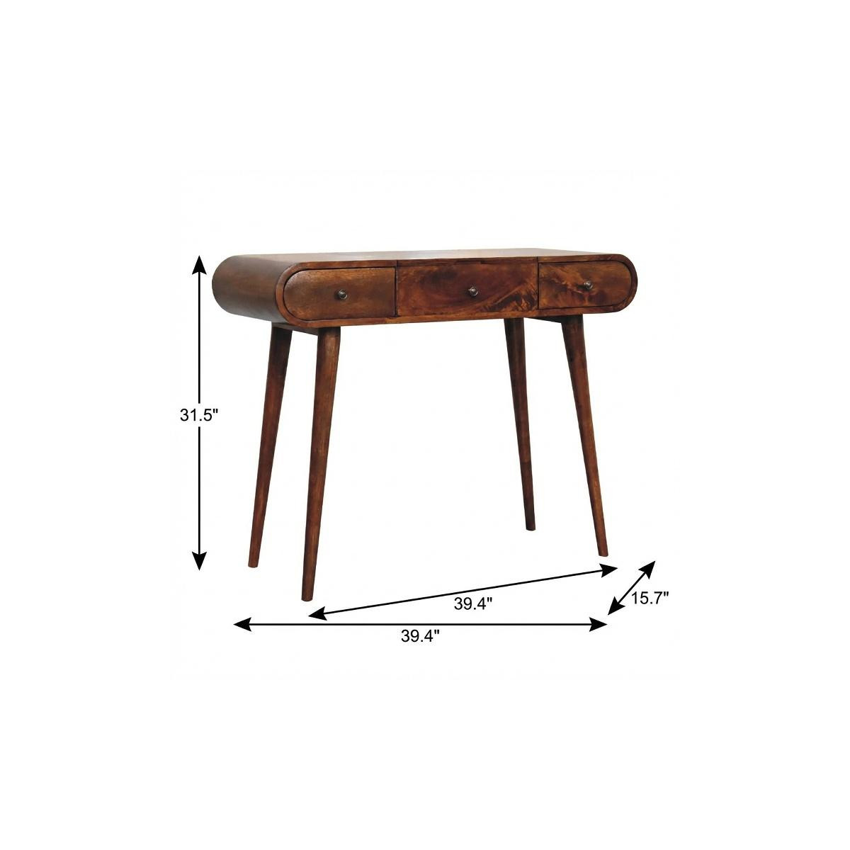 Upgrade your beauty routine with our versatile 39-inch chestnut solid wood mirrored three drawer vanity table. Not only does it add reflection and lustrous beauty to you bedroom or bathroom, as a bonus, this vanity table is also easy to clean. Made with the highest quality construction from durable and genuine solid wood. Say goodbye to cluttered bathroom counters and hello to our stunning vanity table. Our versatile vanity will cater to your grooming needs, whether it's keeping organized, applying makeup, styling your hair, or achieving your best look every day. 31.50-inch h x 39.40-inch w x 15.70-inch d.
