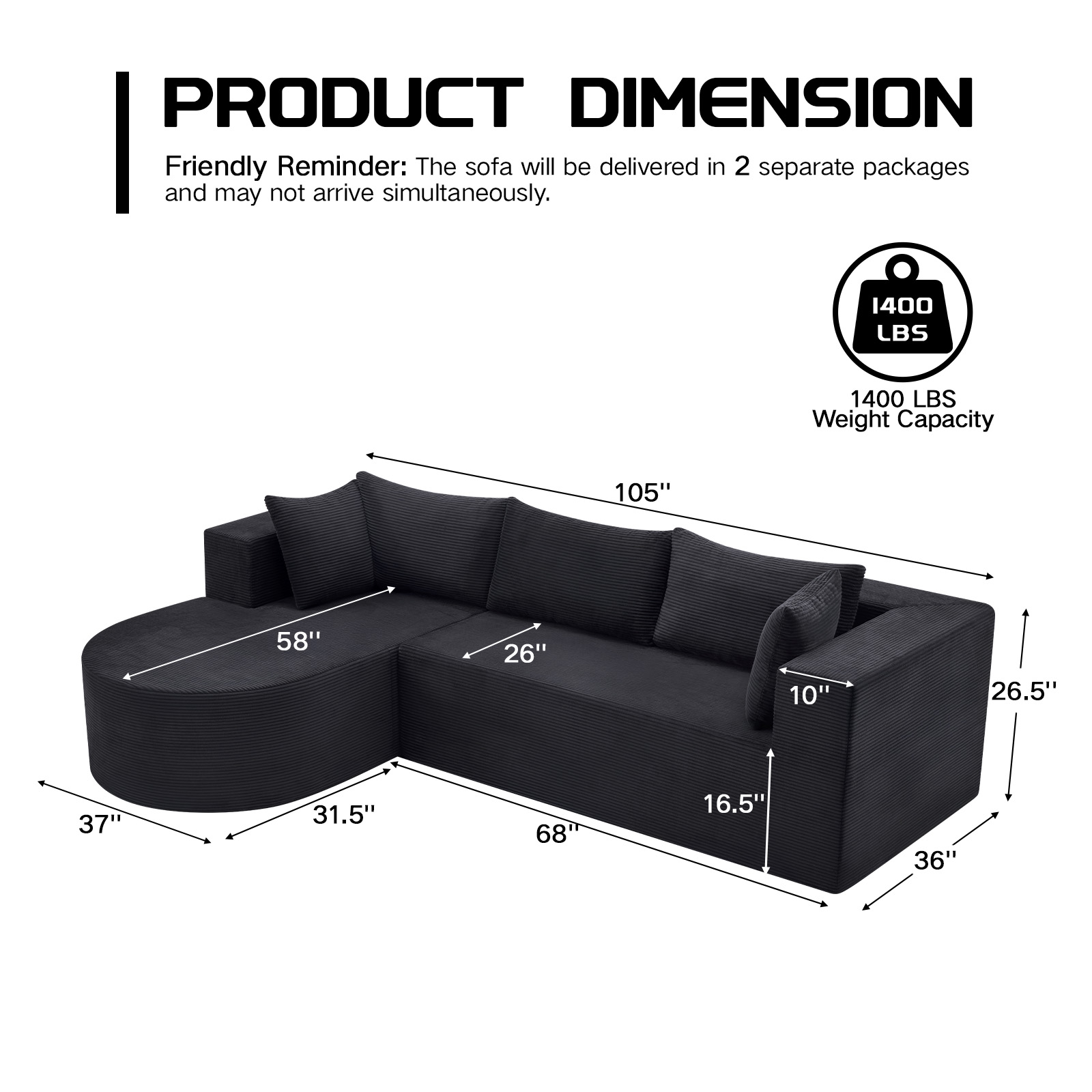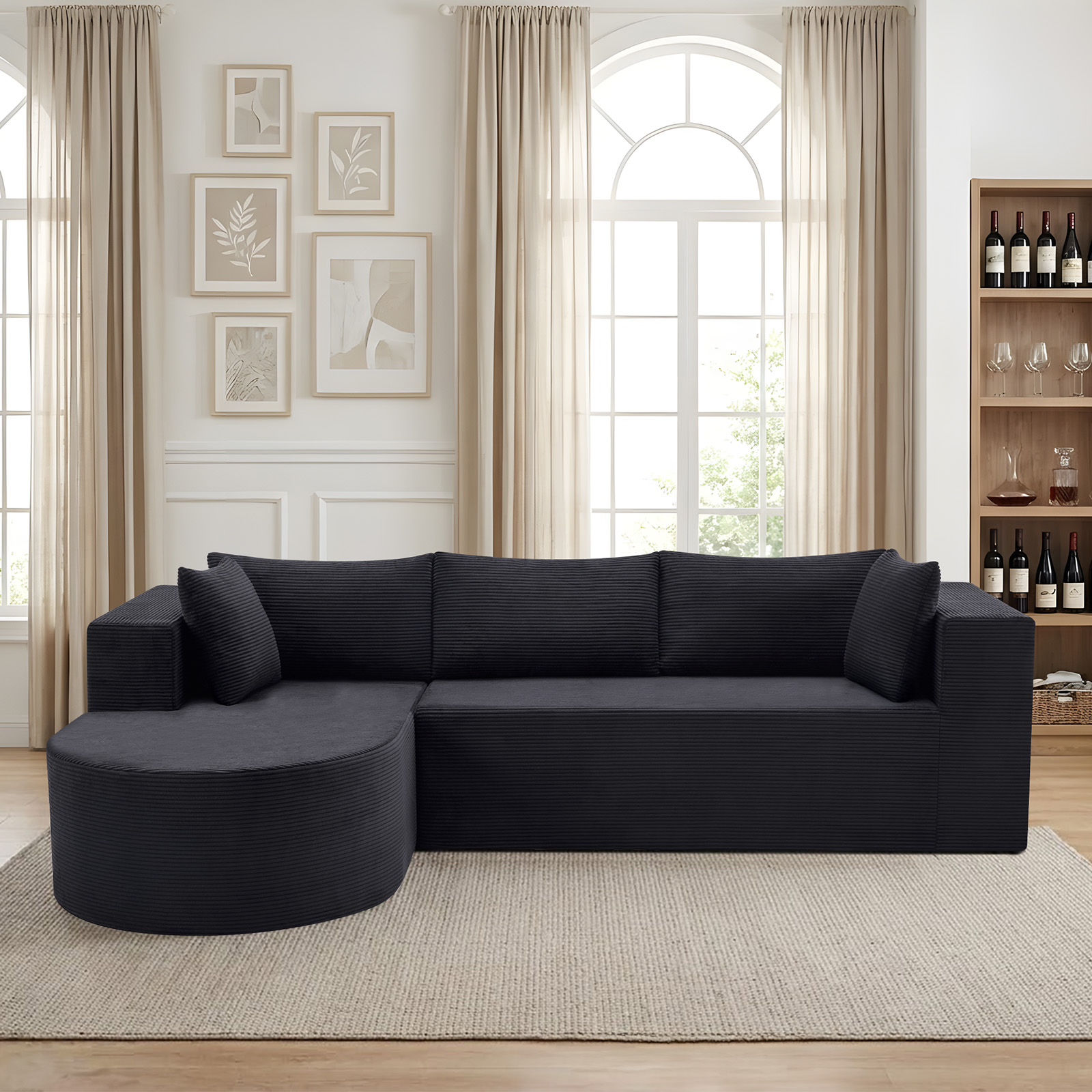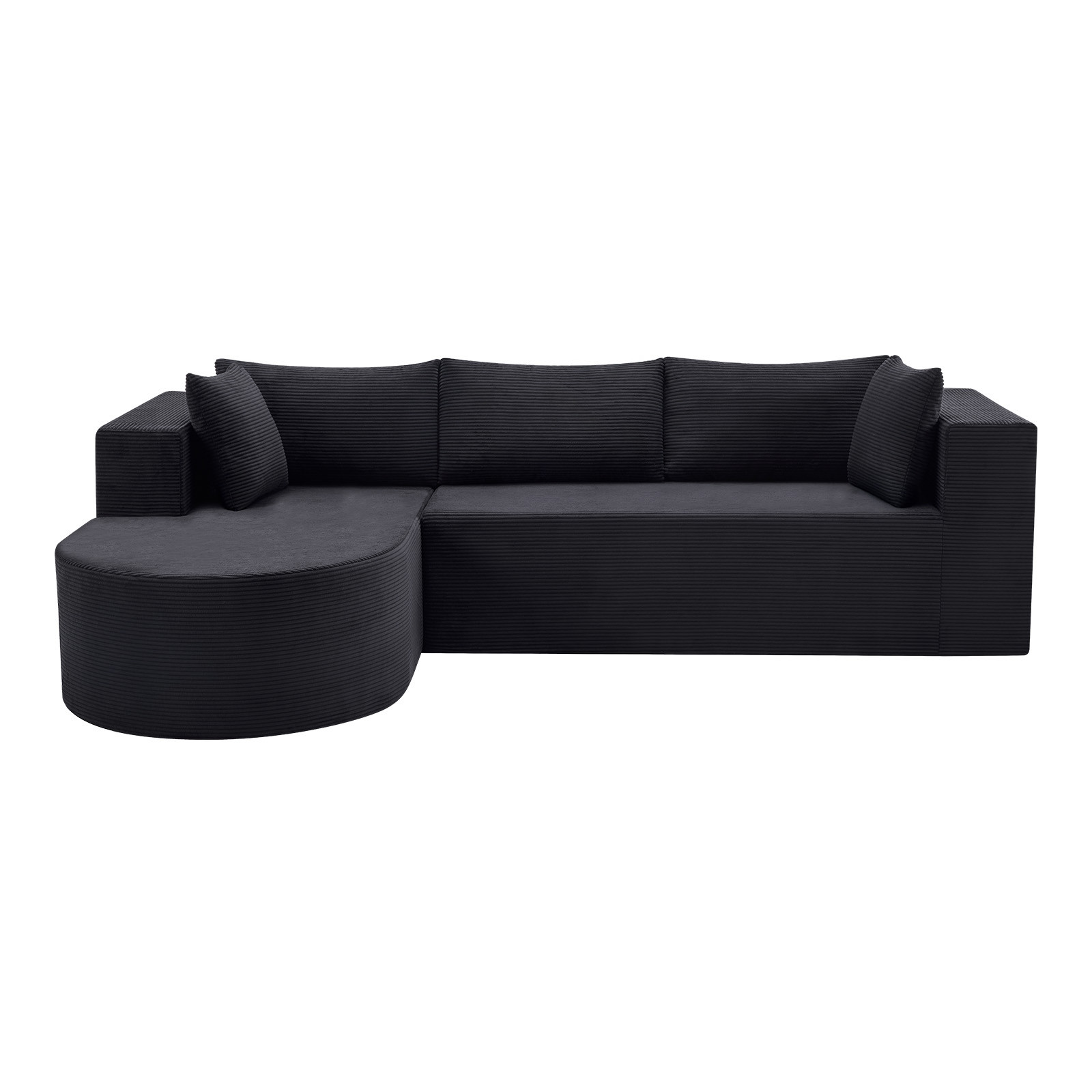 The 105-inch black corduroy modular left rounded chaise style sofa with toss pillows is a stunning addition to any living space. This stylish two piece sofa features a modern modular L-shaped design. Fully upholstered in luxurious plush and textural black corduroy, this solid color set adds a touch of cozy style to your room. The tight seat style ensures lasting comfort, while the cushion back provides optimal support. It includes cozy wide arms that contribute to its overall appeal. Crafted with a foam frame that offers both durability and cozy comfort, this modular sectional with rounded edge chaise is the perfect centerpiece for any modern space. 26.50-inch h x 105.00-inch w x 67.50-inch d.
