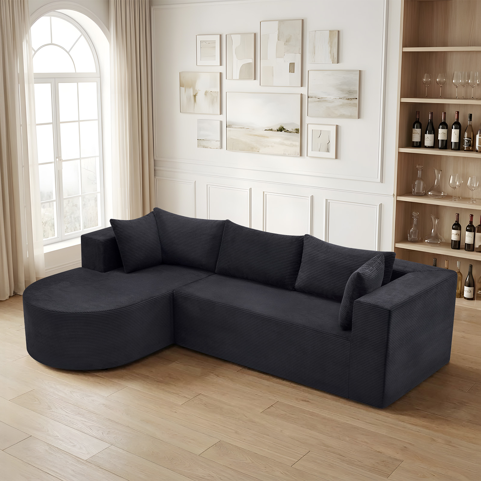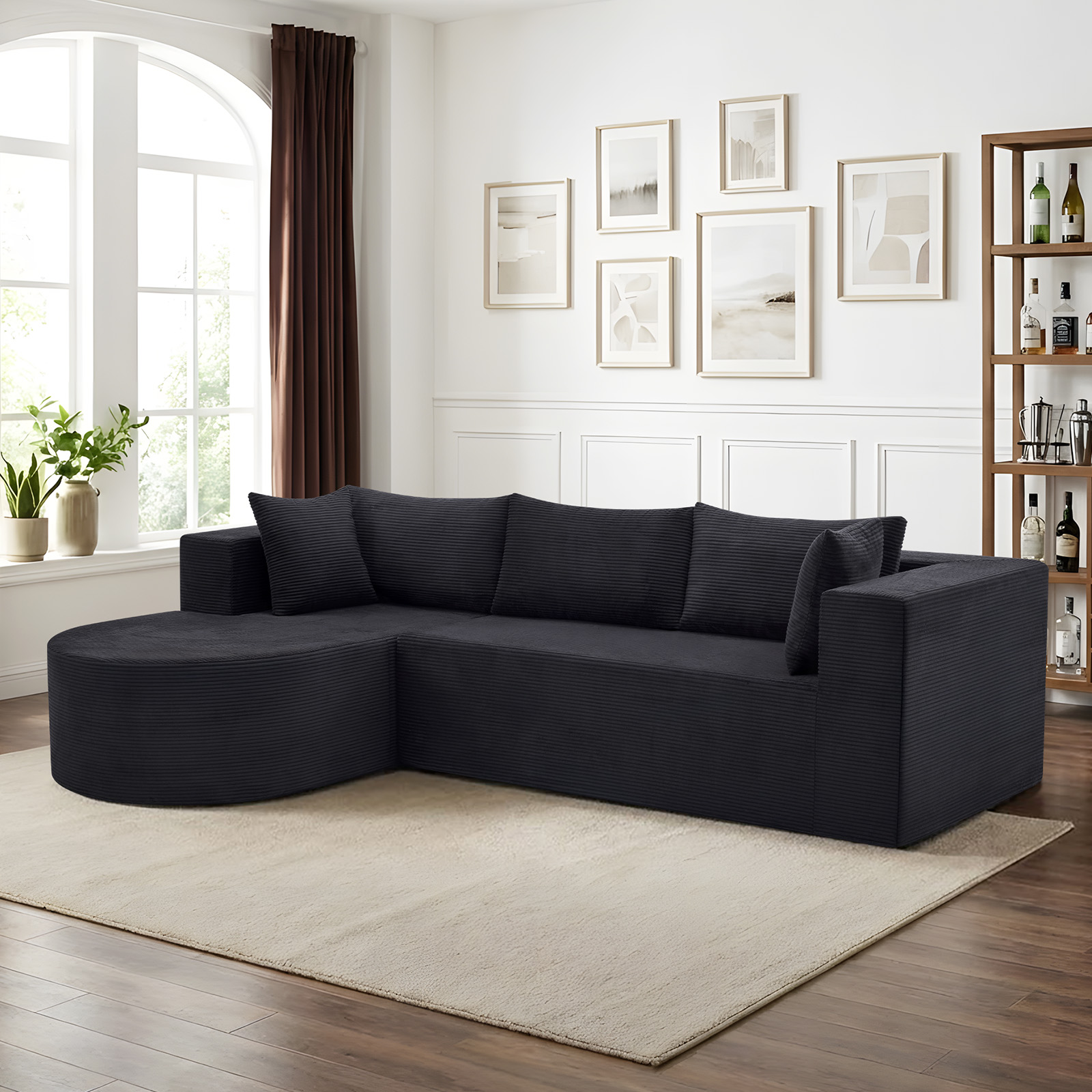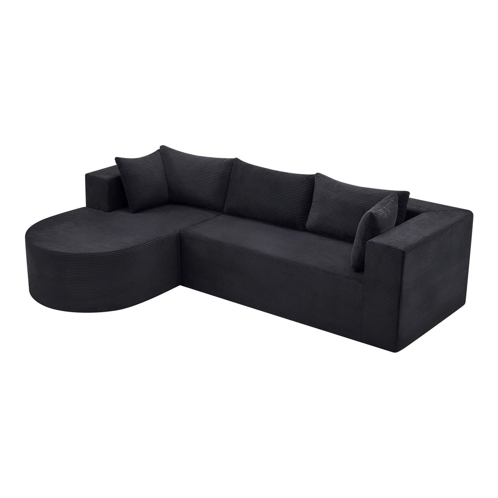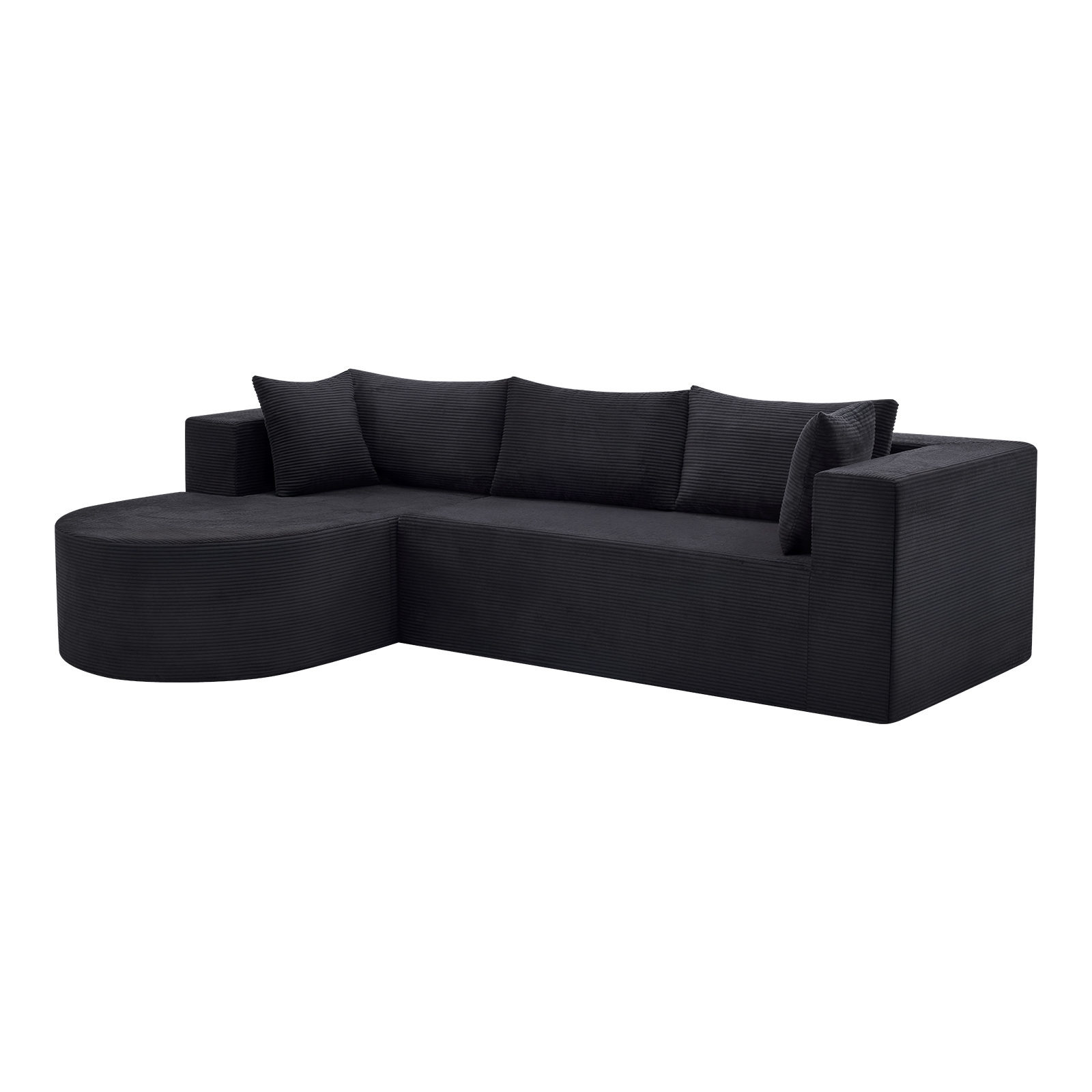 The 105-inch black corduroy modular left rounded chaise style sofa with toss pillows is a stunning addition to any living space. This stylish two piece sofa features a modern modular L-shaped design. Fully upholstered in luxurious plush and textural black corduroy, this solid color set adds a touch of cozy style to your room. The tight seat style ensures lasting comfort, while the cushion back provides optimal support. It includes cozy wide arms that contribute to its overall appeal. Crafted with a foam frame that offers both durability and cozy comfort, this modular sectional with rounded edge chaise is the perfect centerpiece for any modern space. 26.50-inch h x 105.00-inch w x 67.50-inch d.