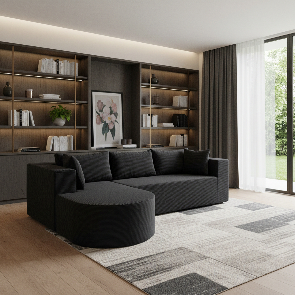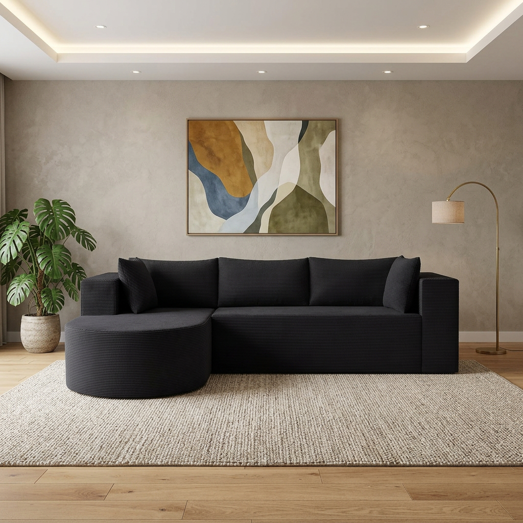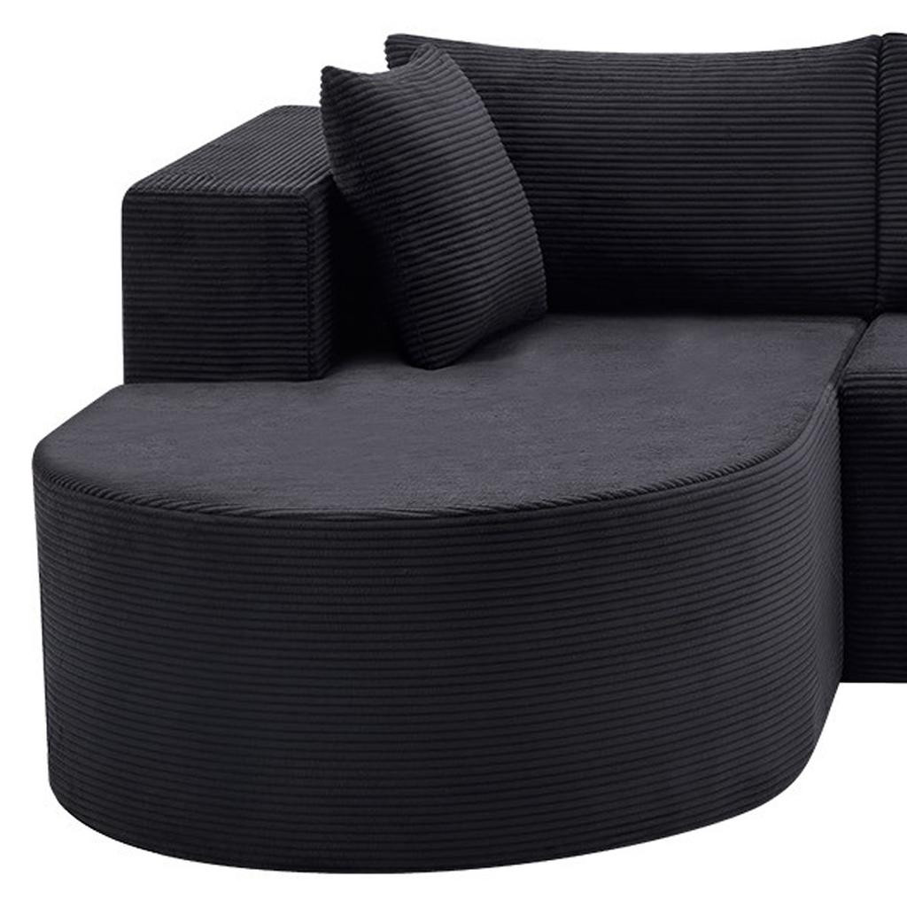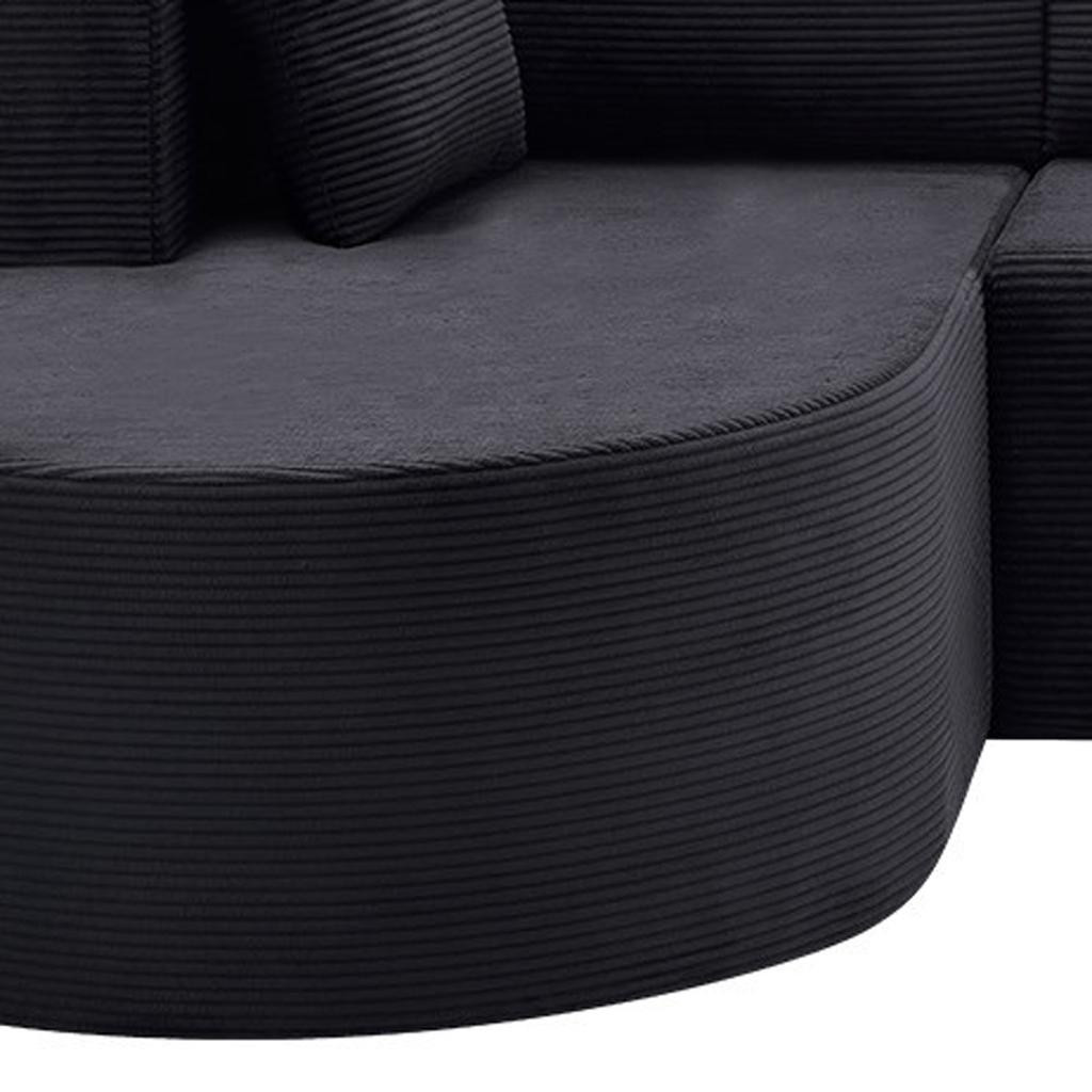 The 105-inch black corduroy modular left rounded chaise style sofa with toss pillows is a stunning addition to any living space. This stylish two piece sofa features a modern modular L-shaped design. Fully upholstered in luxurious plush and textural black corduroy, this solid color set adds a touch of cozy style to your room. The tight seat style ensures lasting comfort, while the cushion back provides optimal support. It includes cozy wide arms that contribute to its overall appeal. Crafted with a foam frame that offers both durability and cozy comfort, this modular sectional with rounded edge chaise is the perfect centerpiece for any modern space. 26.50-inch h x 105.00-inch w x 67.50-inch d.