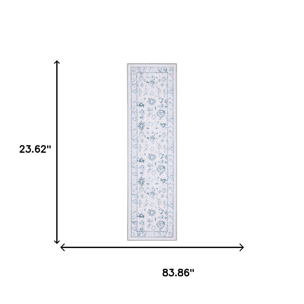 This 7-foot ivory and blue oriental washable runner rug, is a great way to add warmth to a room. Ideal for spaces with kids and pets, this rug is stain resistant to help repel dirt and spilled liquids. Built to last, this rug crafted from polyester fibers is known for its durability and long lasting appeal. This traditional style runner makes a great accent for the hallway, in front of cabinets, in the laundry room, or any other space you need a narrow and long rug. 23.62-inch h x 83.86-inch w x 0.12-inch d.